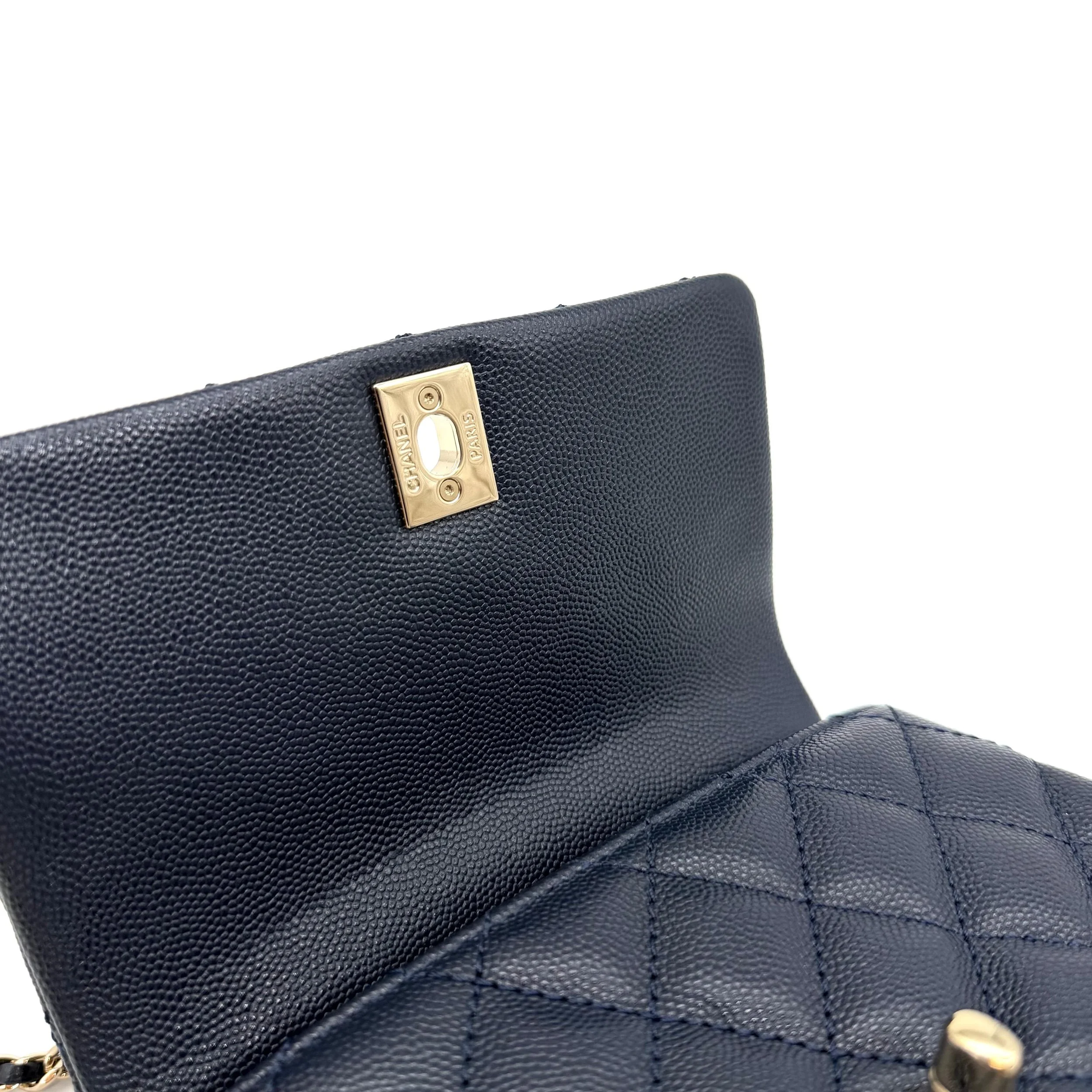 Item Description/Model: Chanel Coco Handle Mini Top Handle Flap Bag Navy Blue Caviar Leather Champagne Gold Hardware