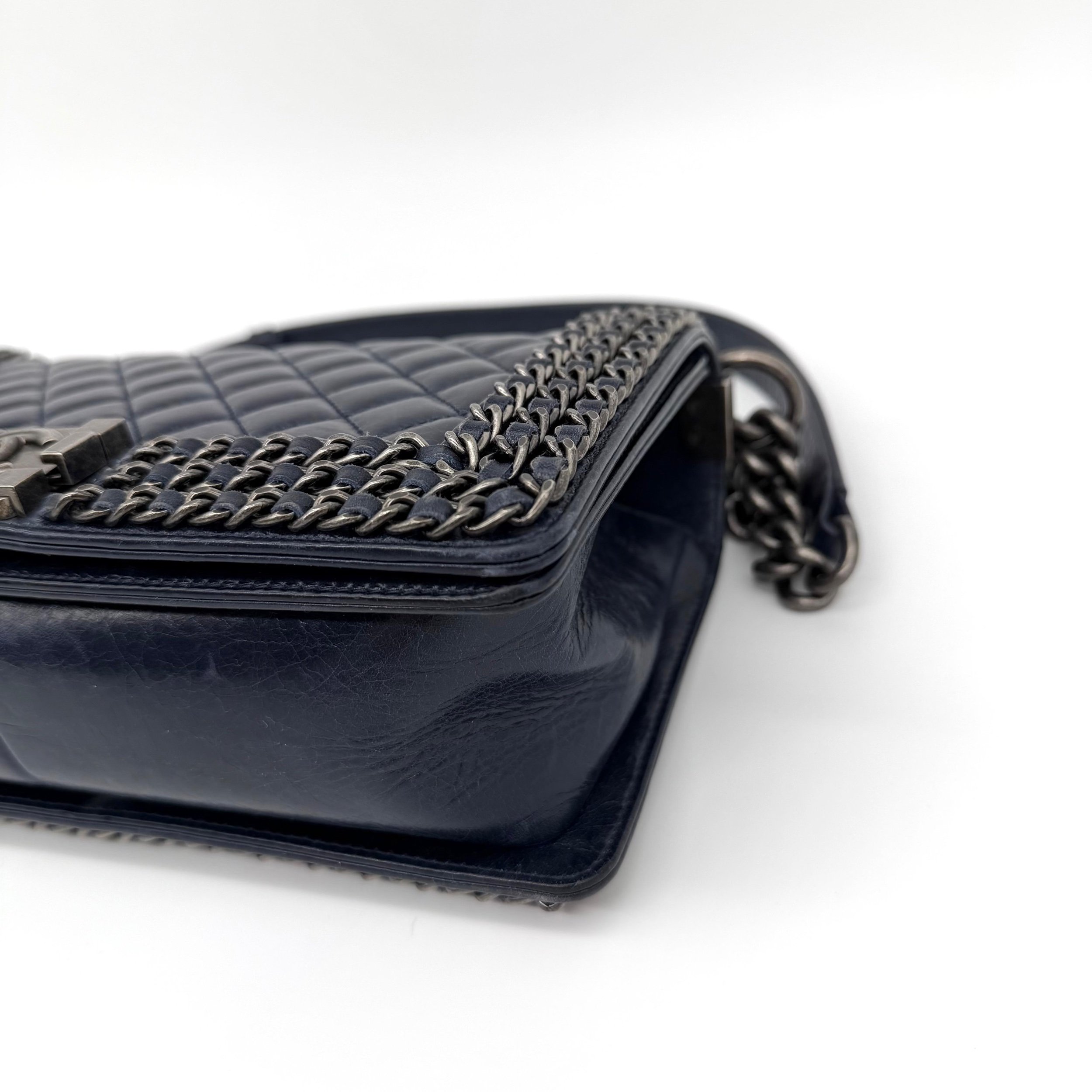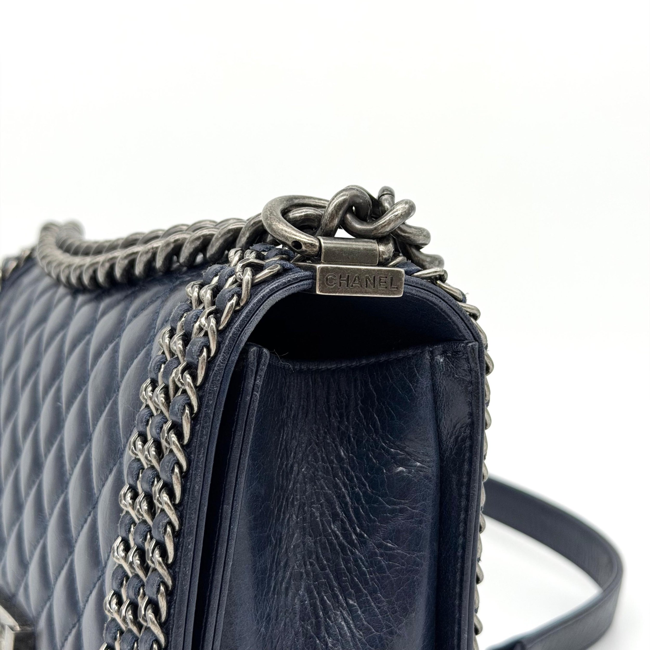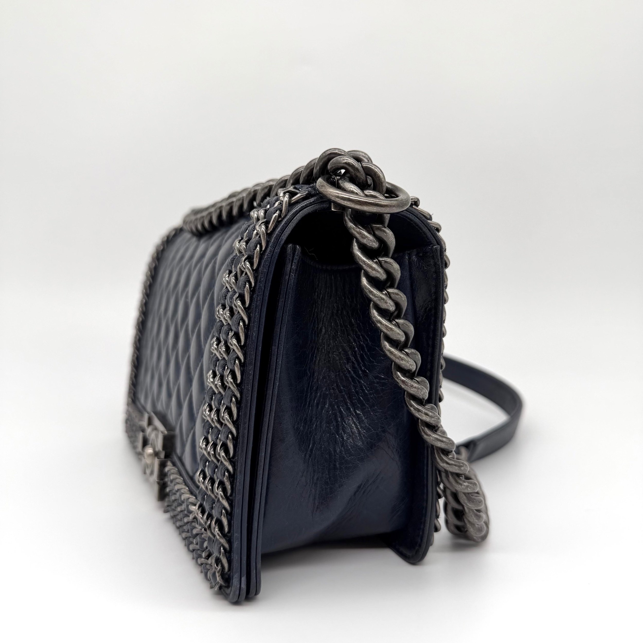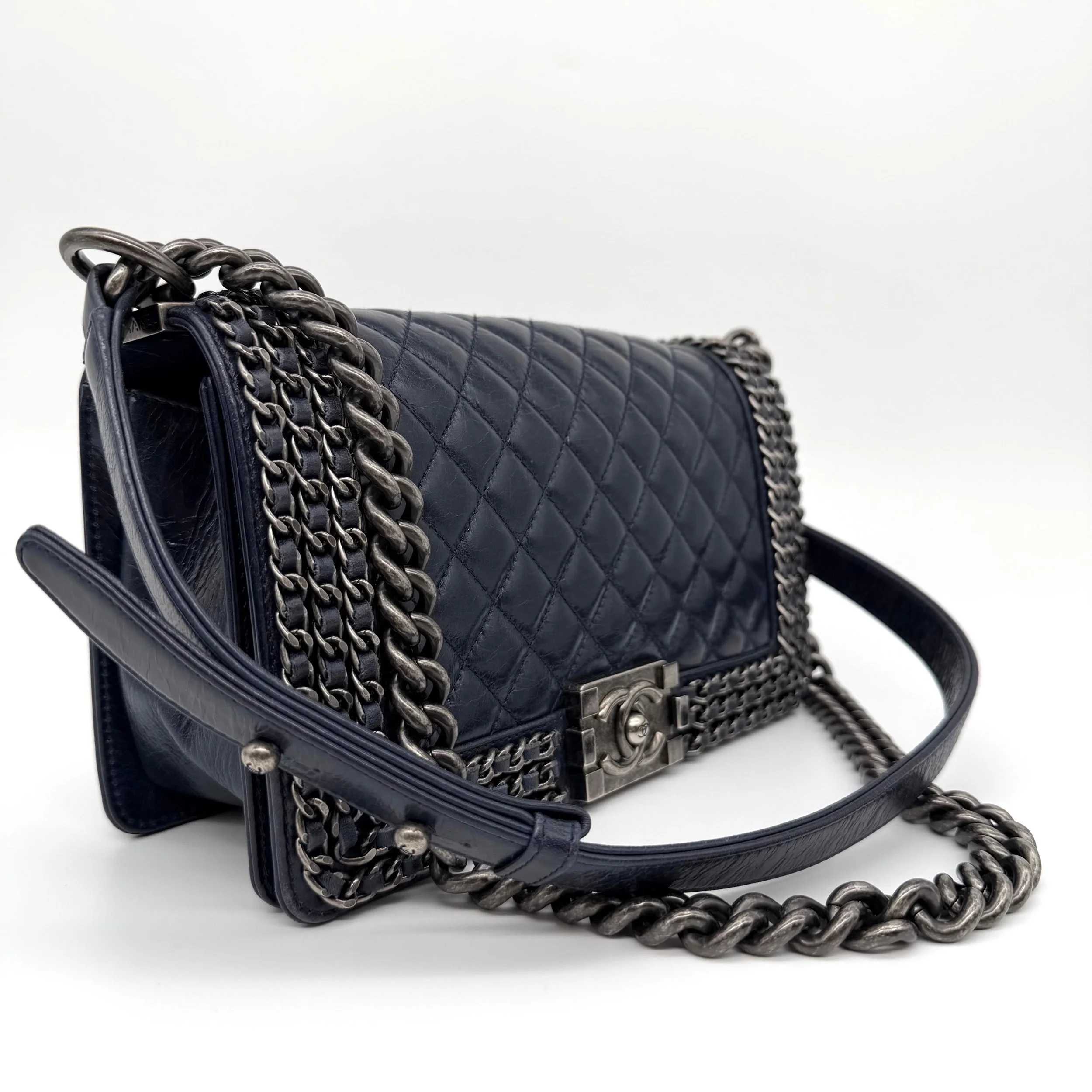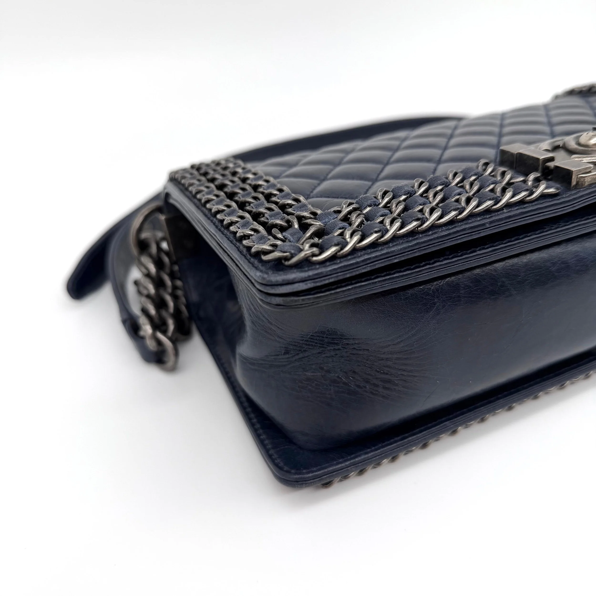 Item Description/Model: Chanel Medium Boy Chain Flap Bag in Quilted Navy Blue Crumpled Leather and Chain / Leather Trim Ruthenium (Silver/Gunmetal) Hardware