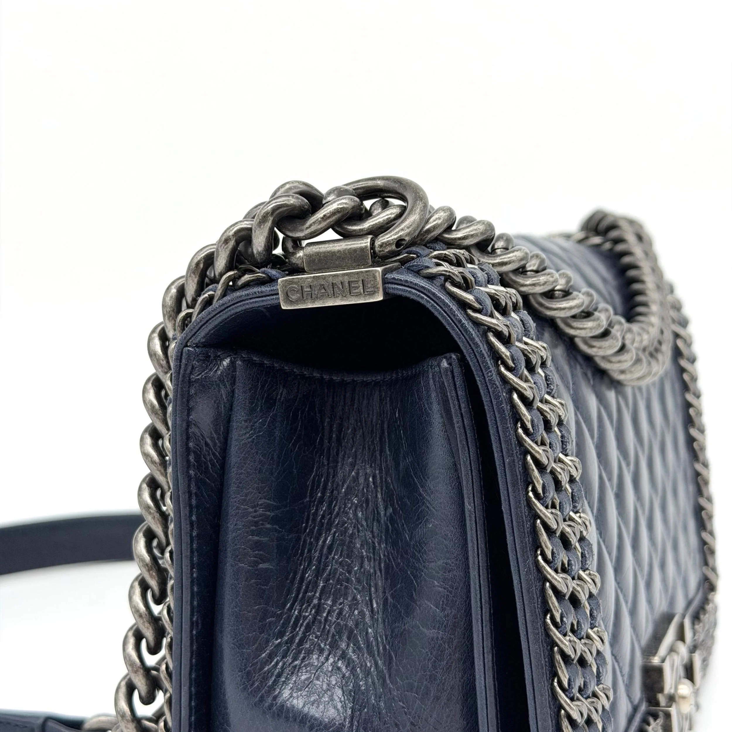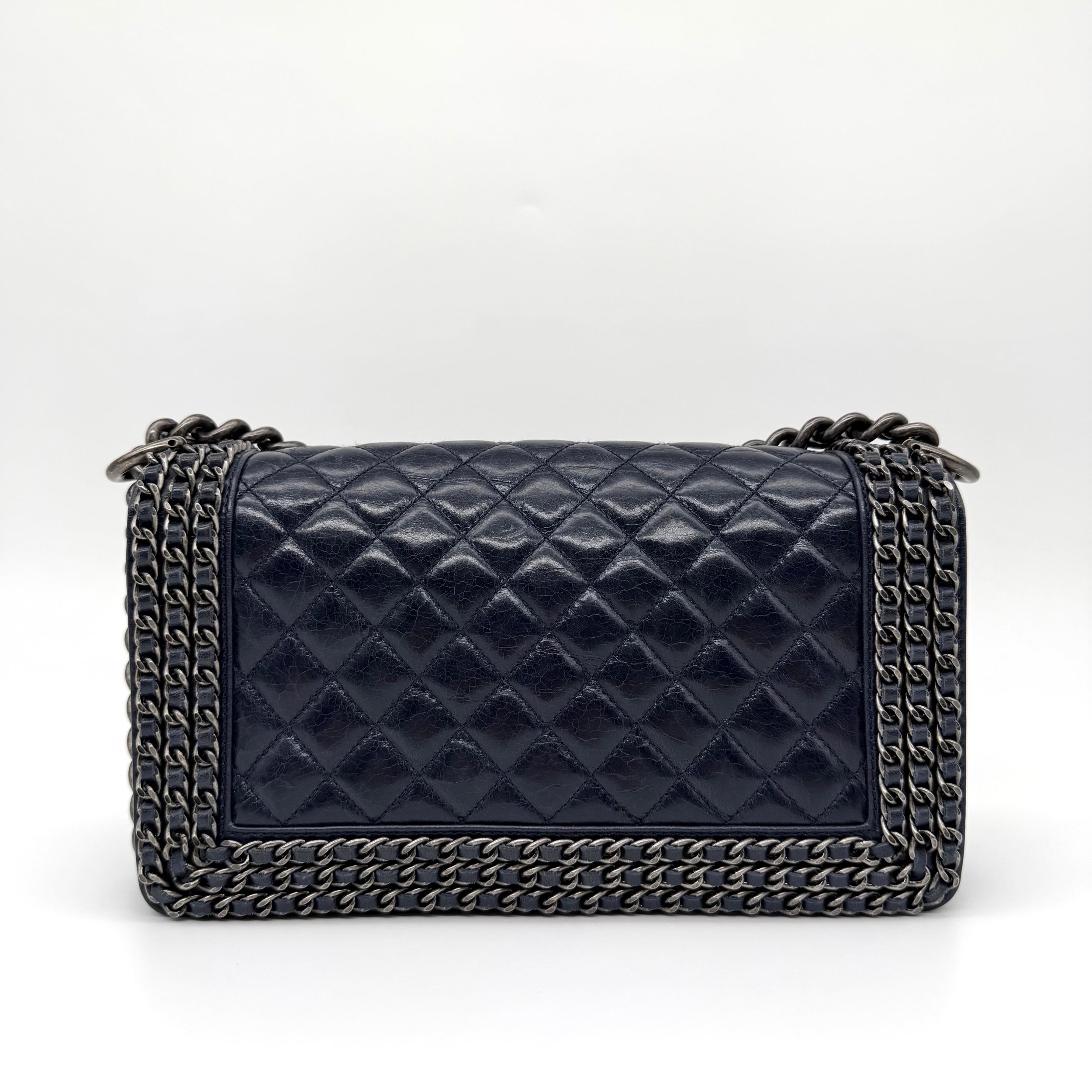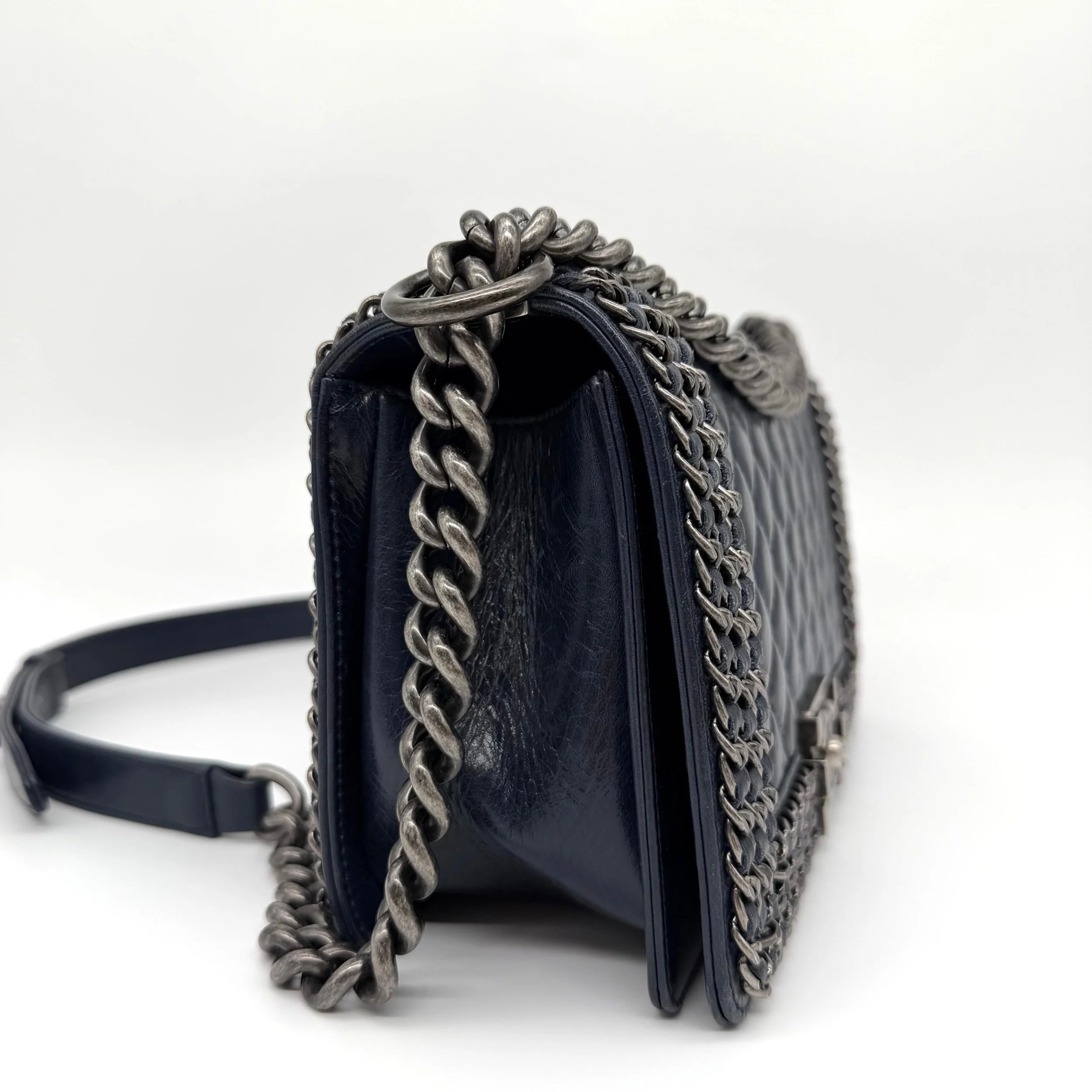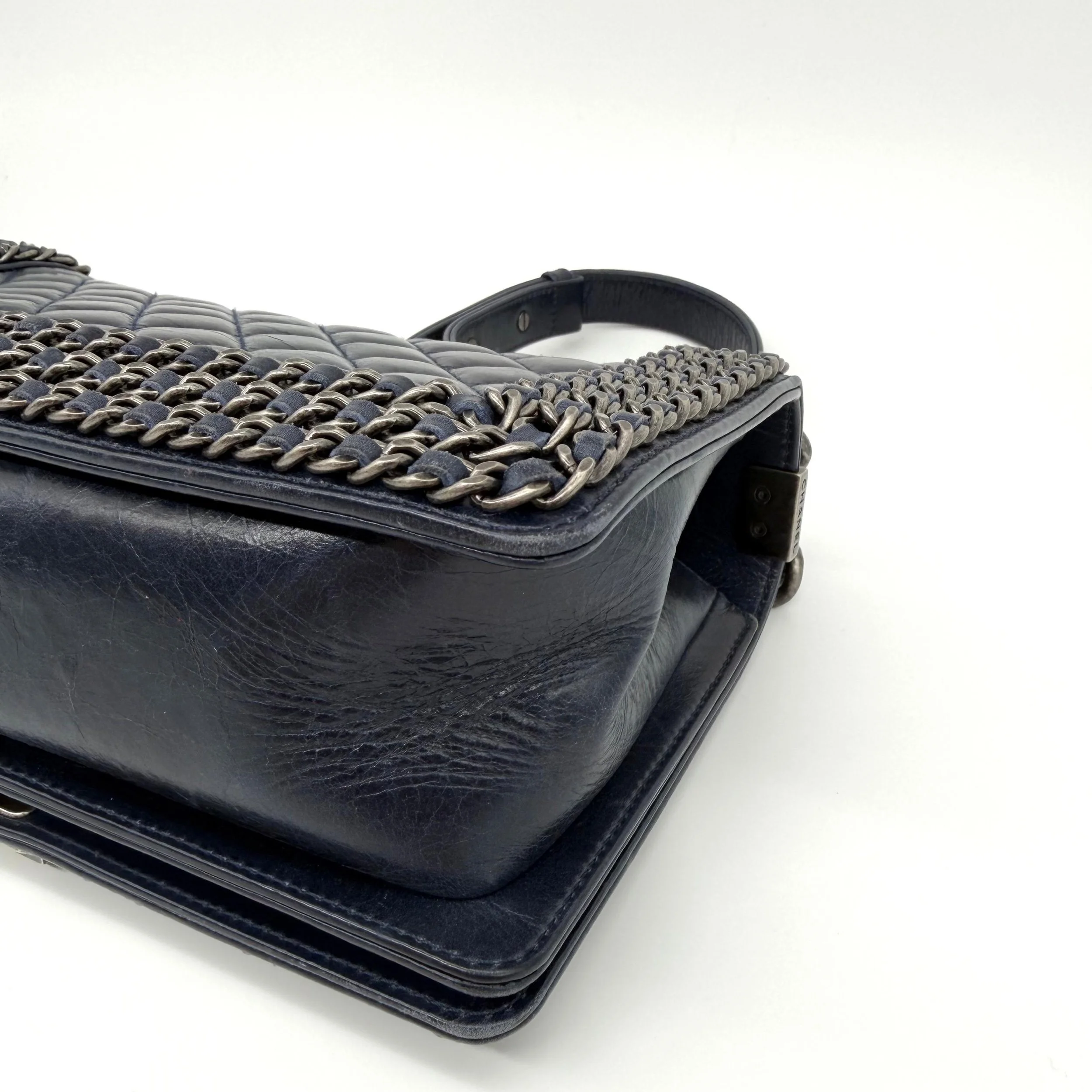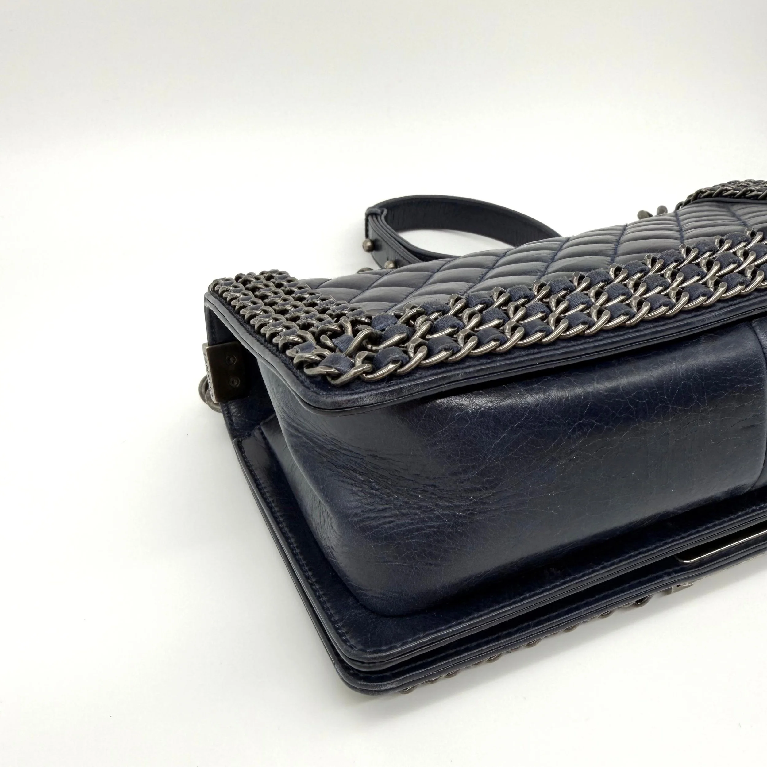 Item Description/Model: Chanel Medium Boy Chain Flap Bag in Quilted Navy Blue Crumpled Leather and Chain / Leather Trim Ruthenium (Silver/Gunmetal) Hardware