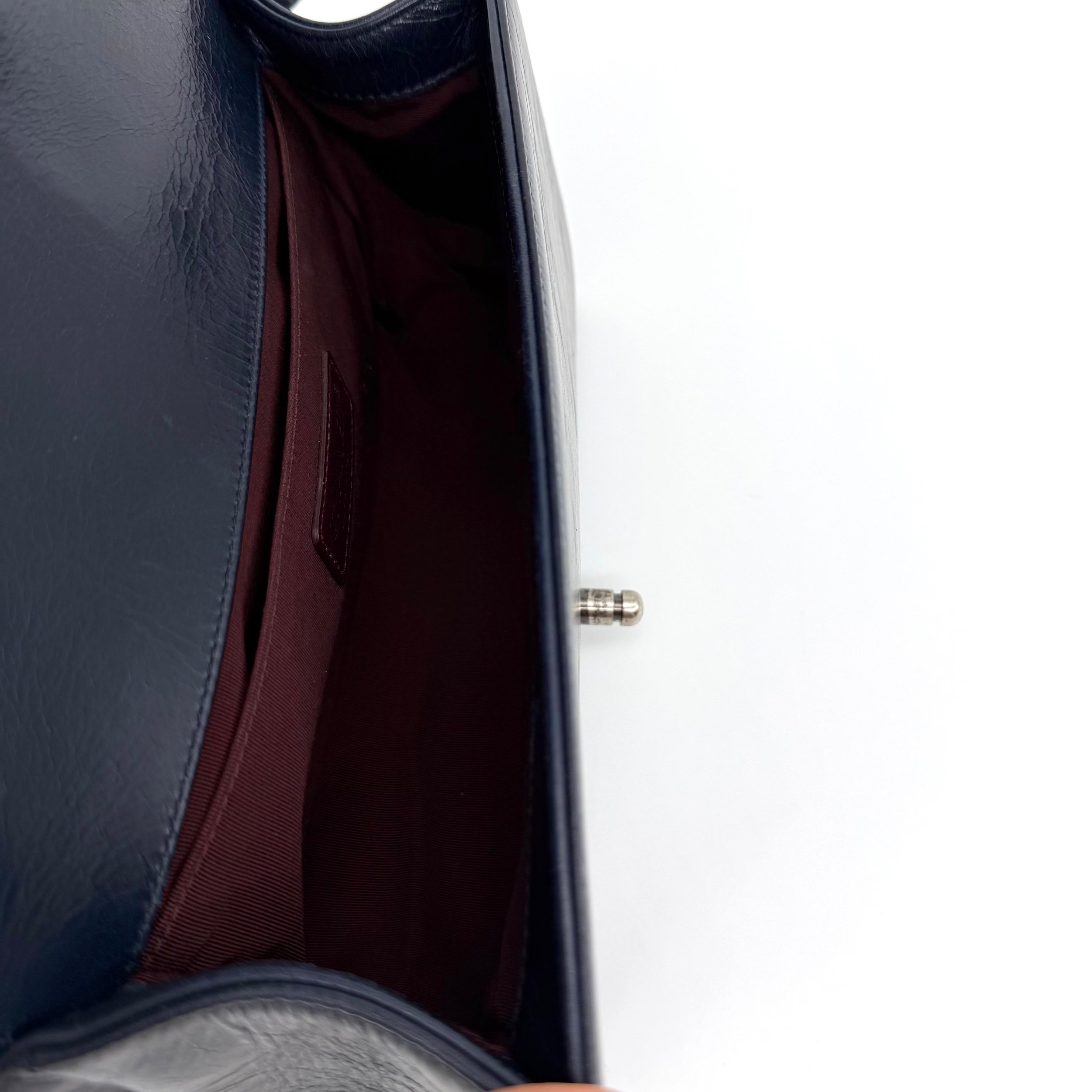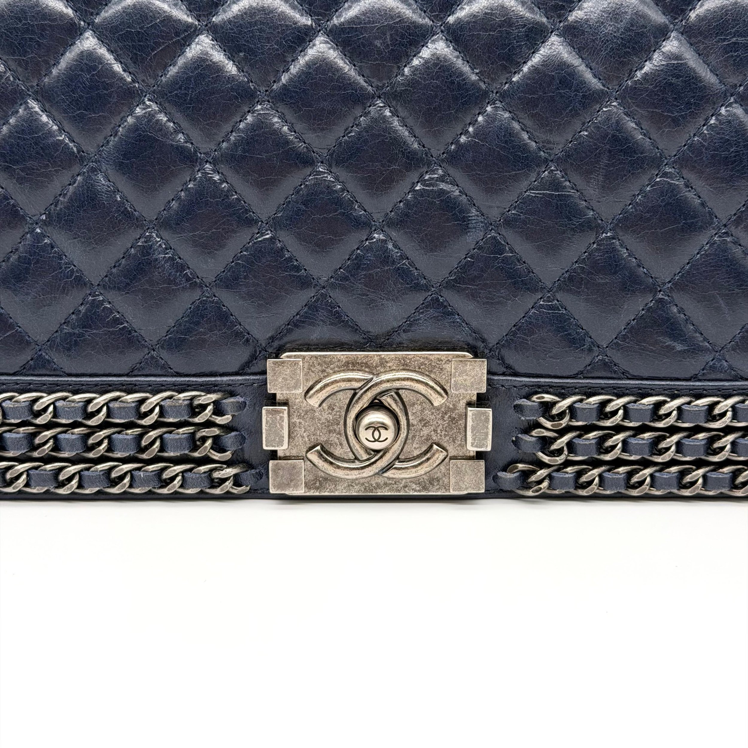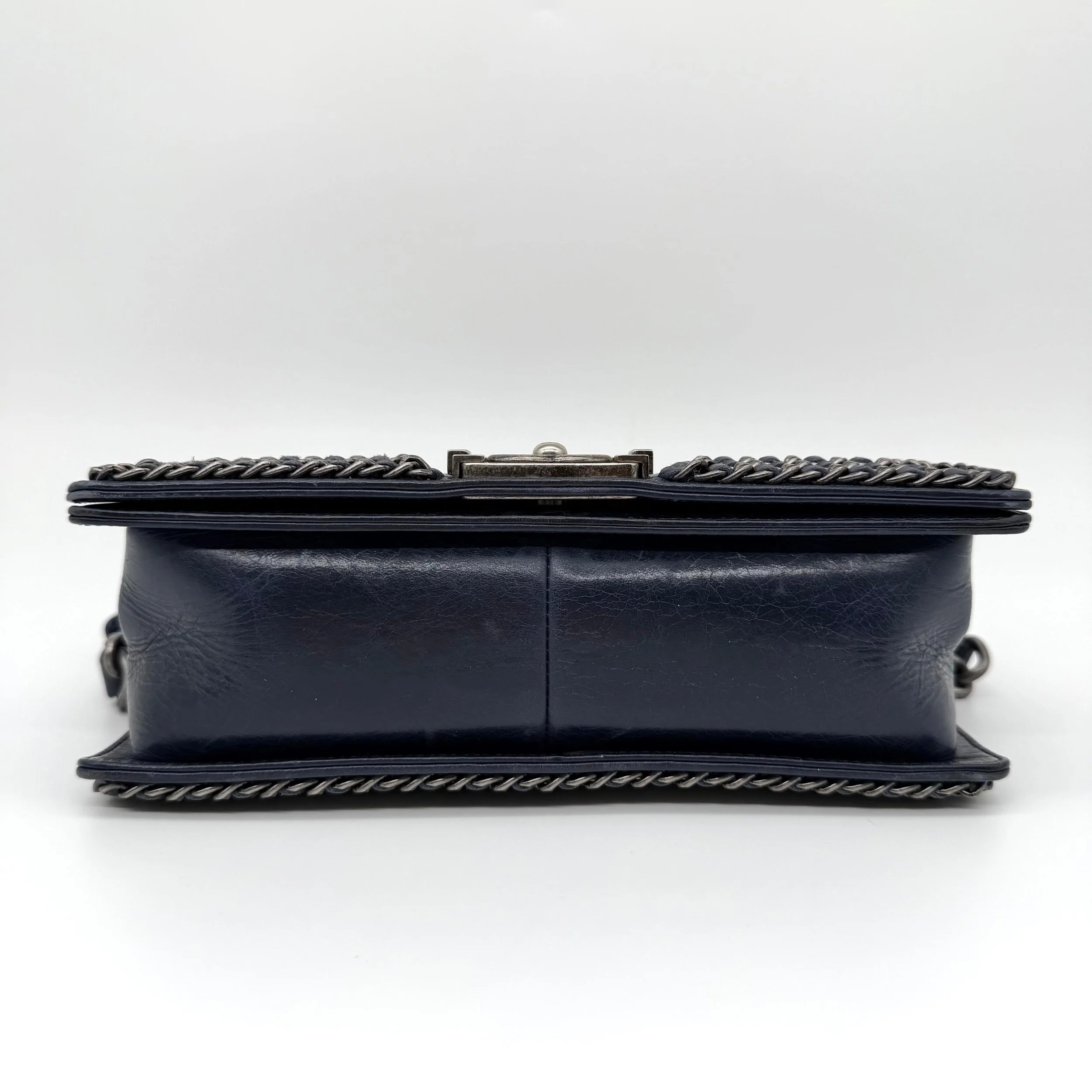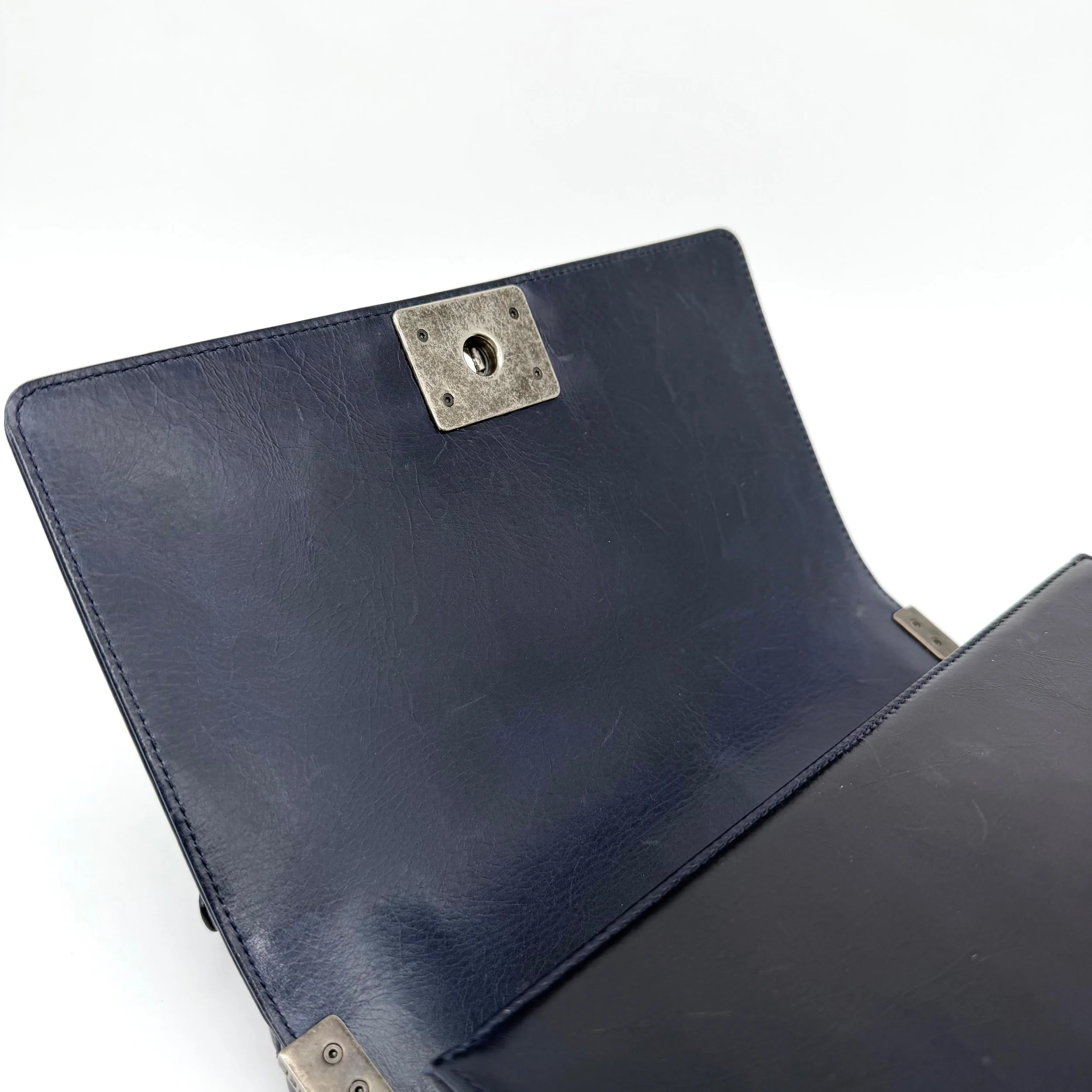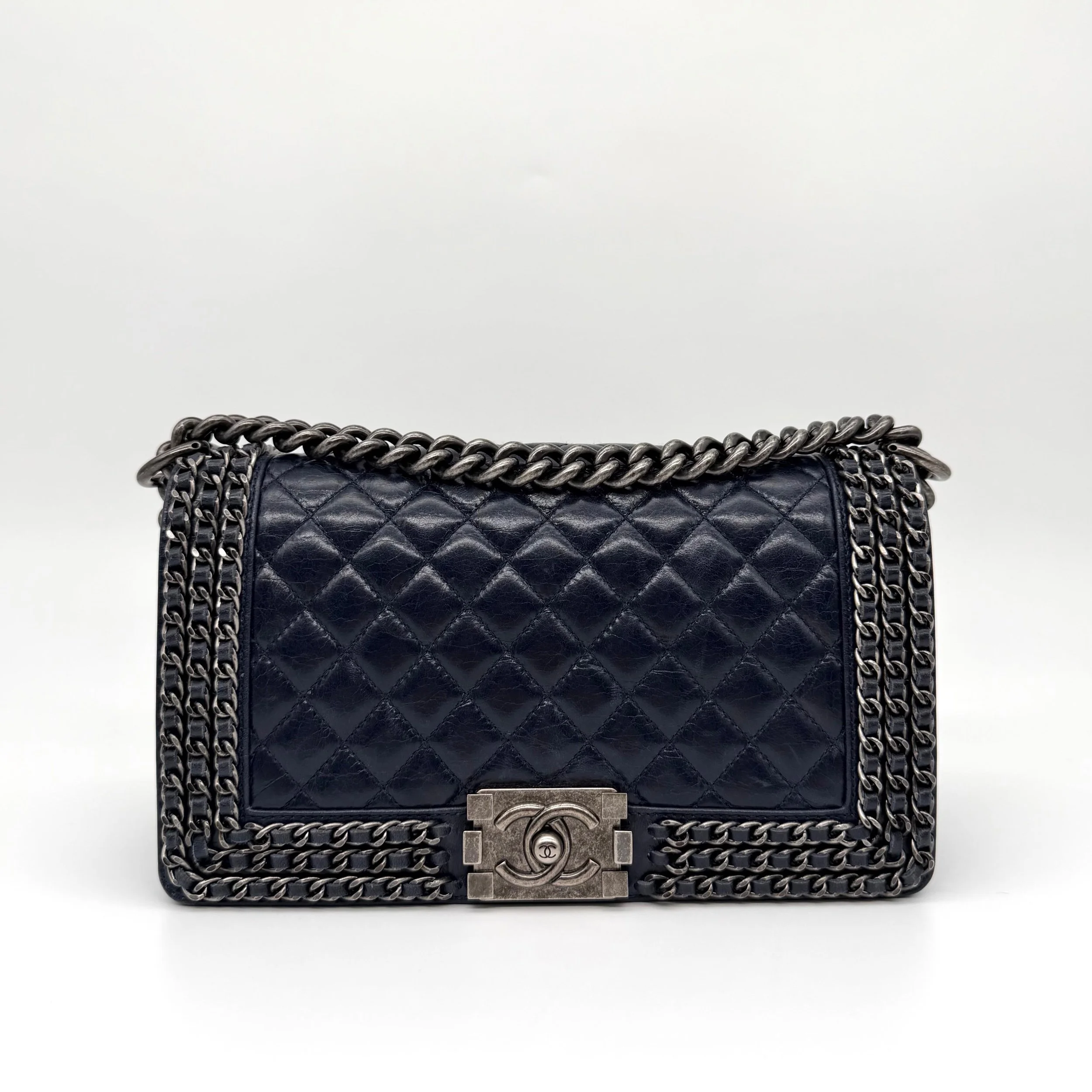 Item Description/Model: Chanel Medium Boy Chain Flap Bag in Quilted Navy Blue Crumpled Leather and Chain / Leather Trim Ruthenium (Silver/Gunmetal) Hardware