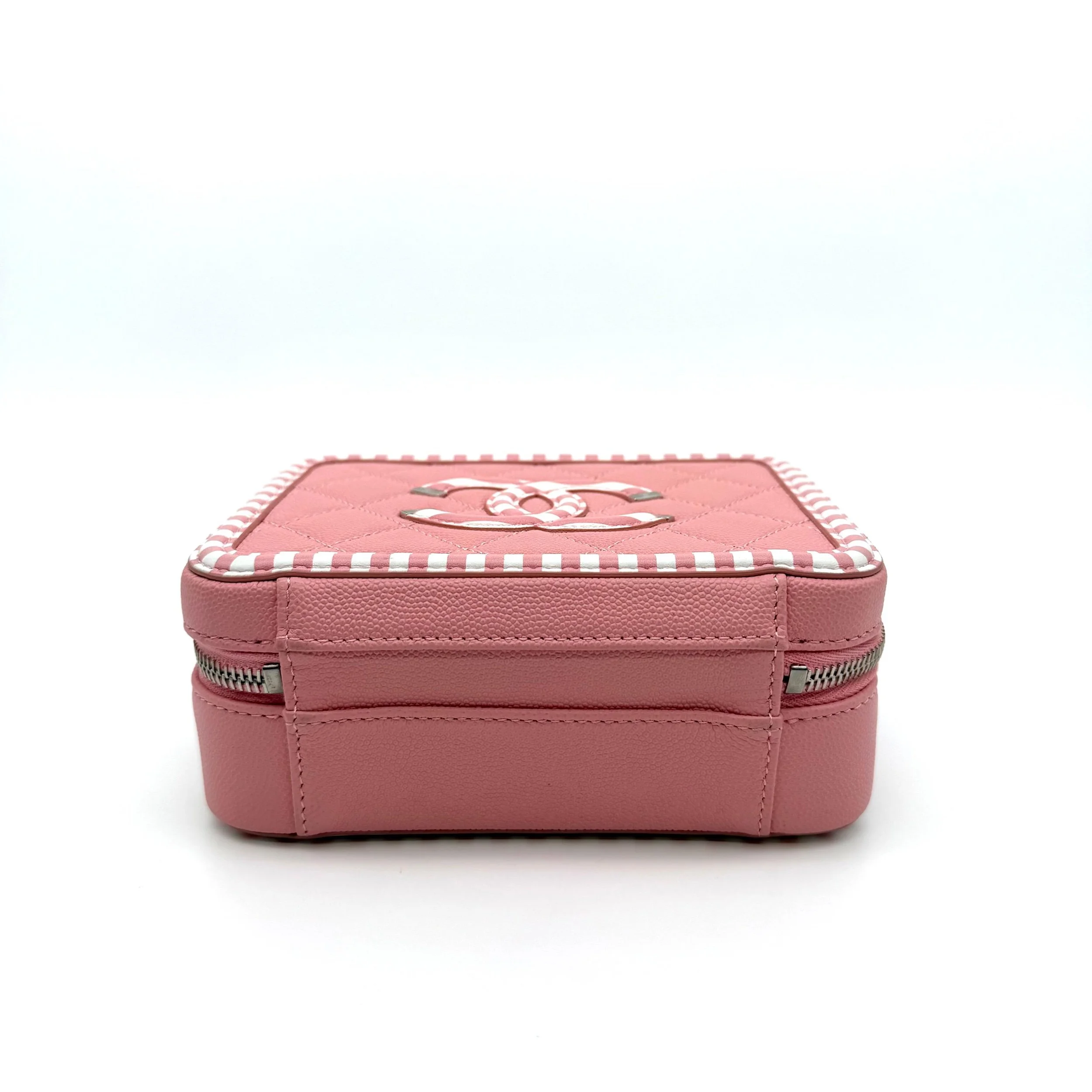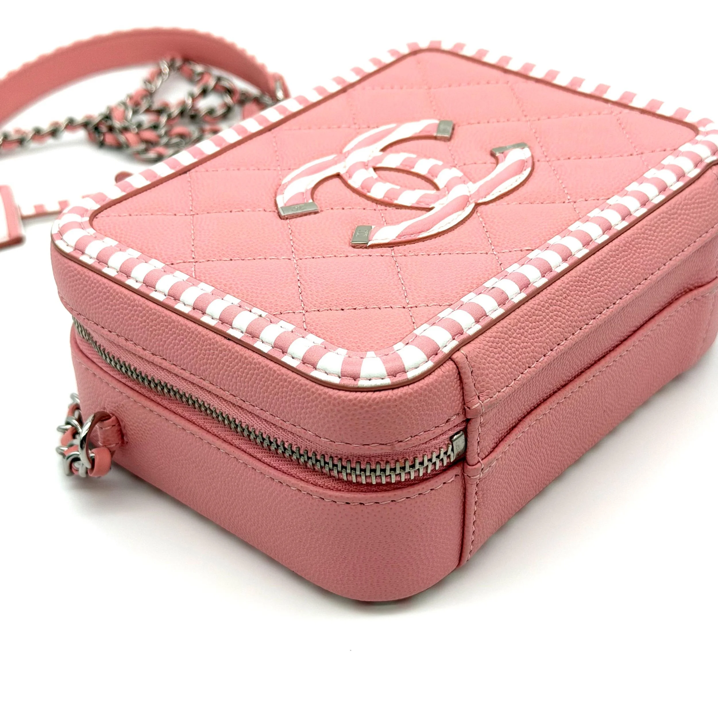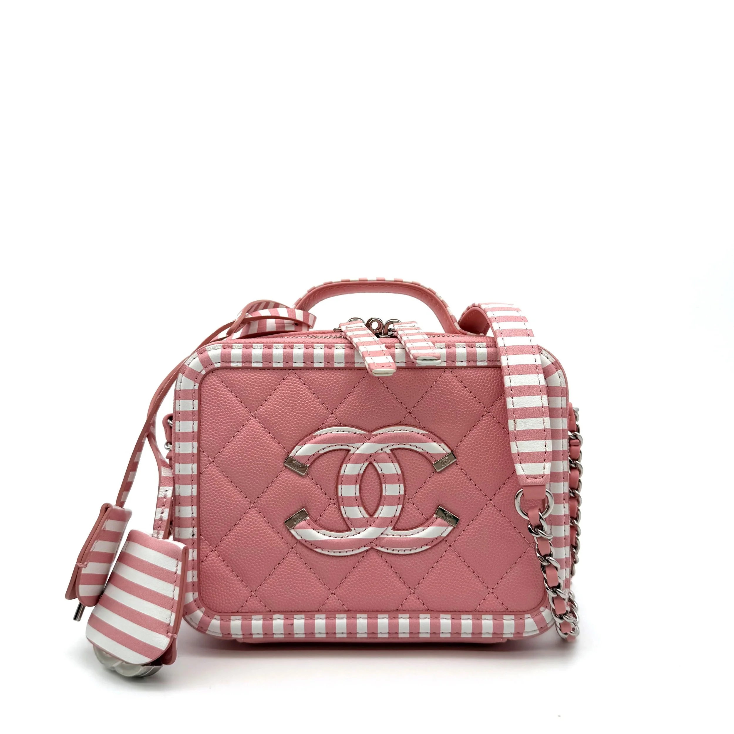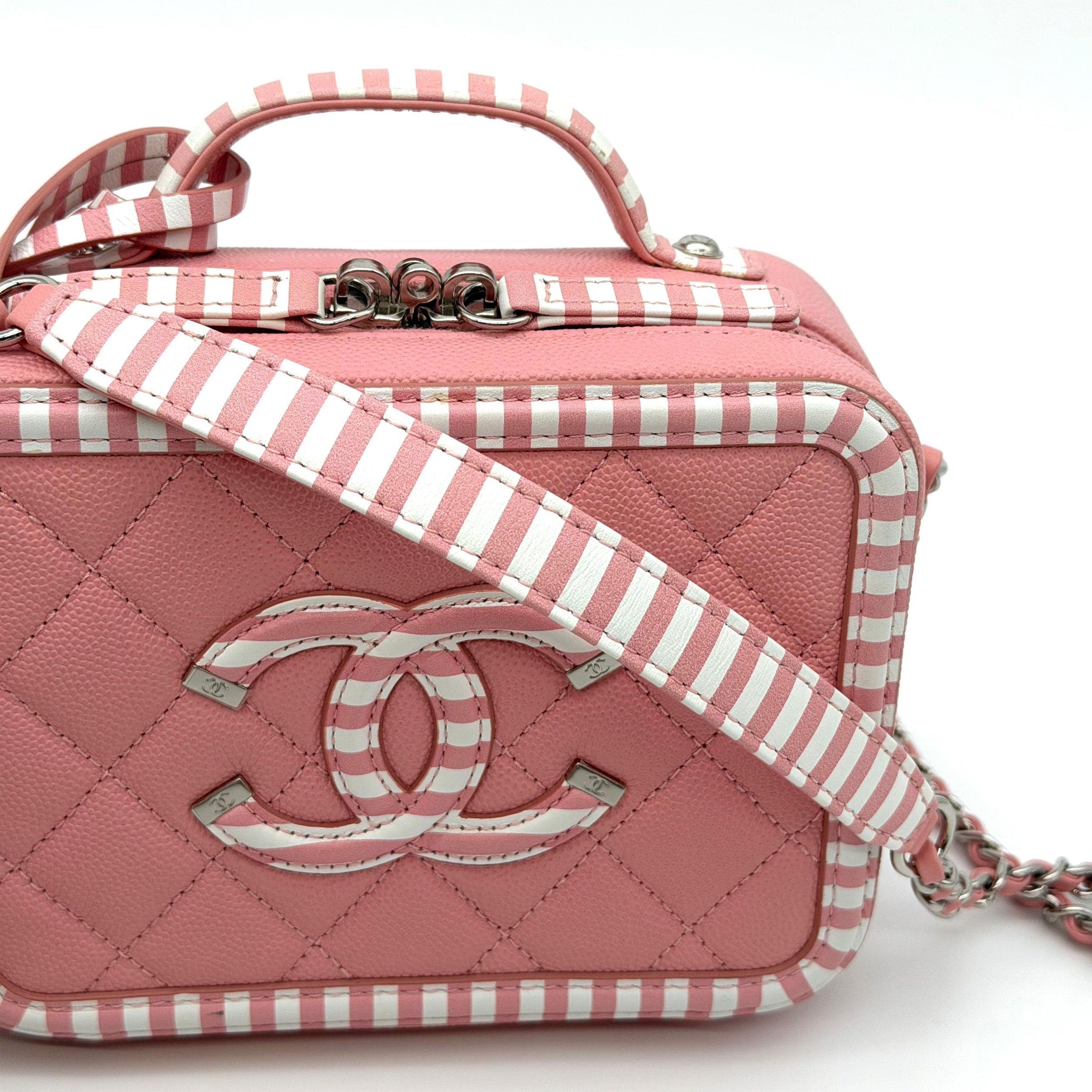 Item Description/Model: Chanel Small CC Filigree Vanity Case Bag in Striped White / Pink Caviar Leather Silver Hardware