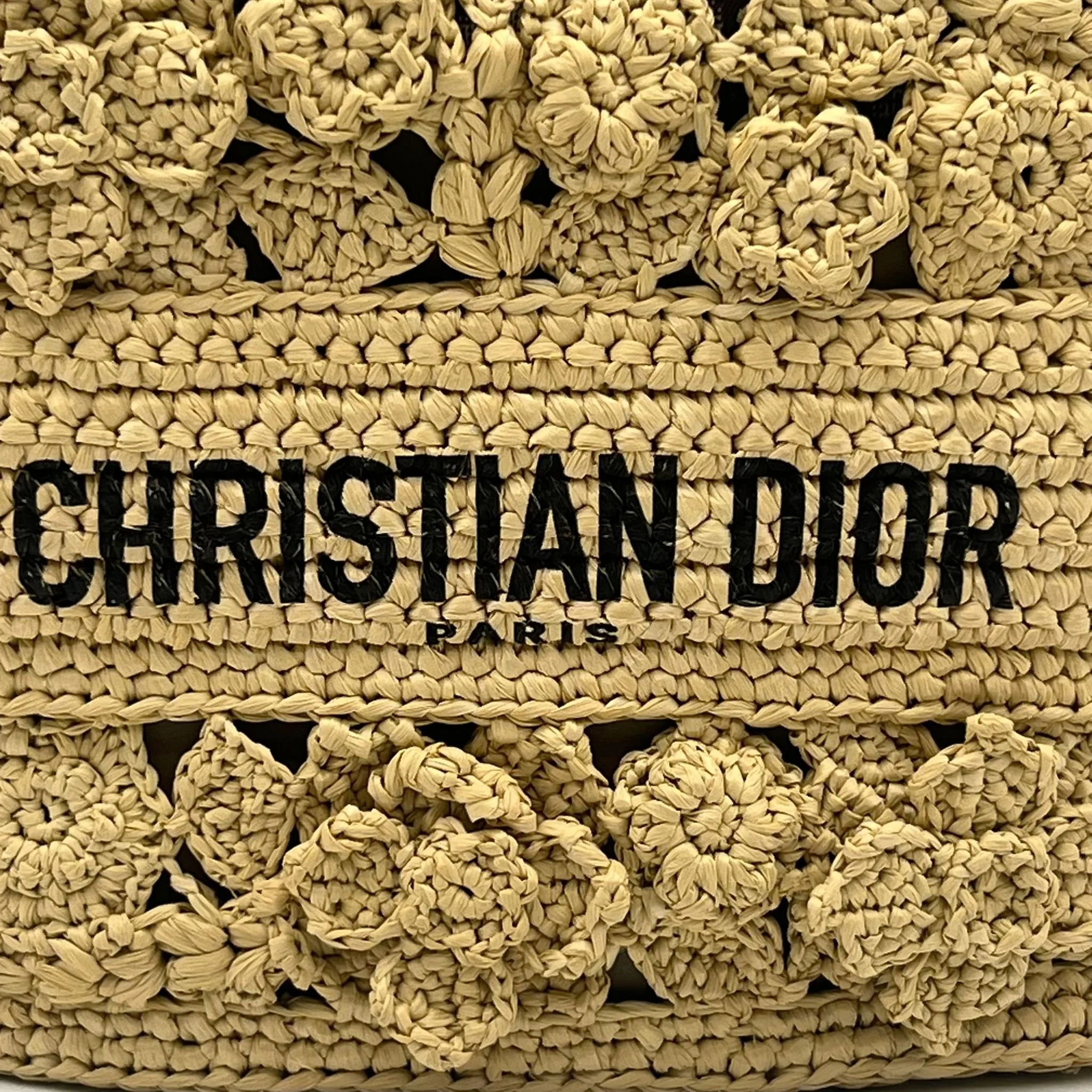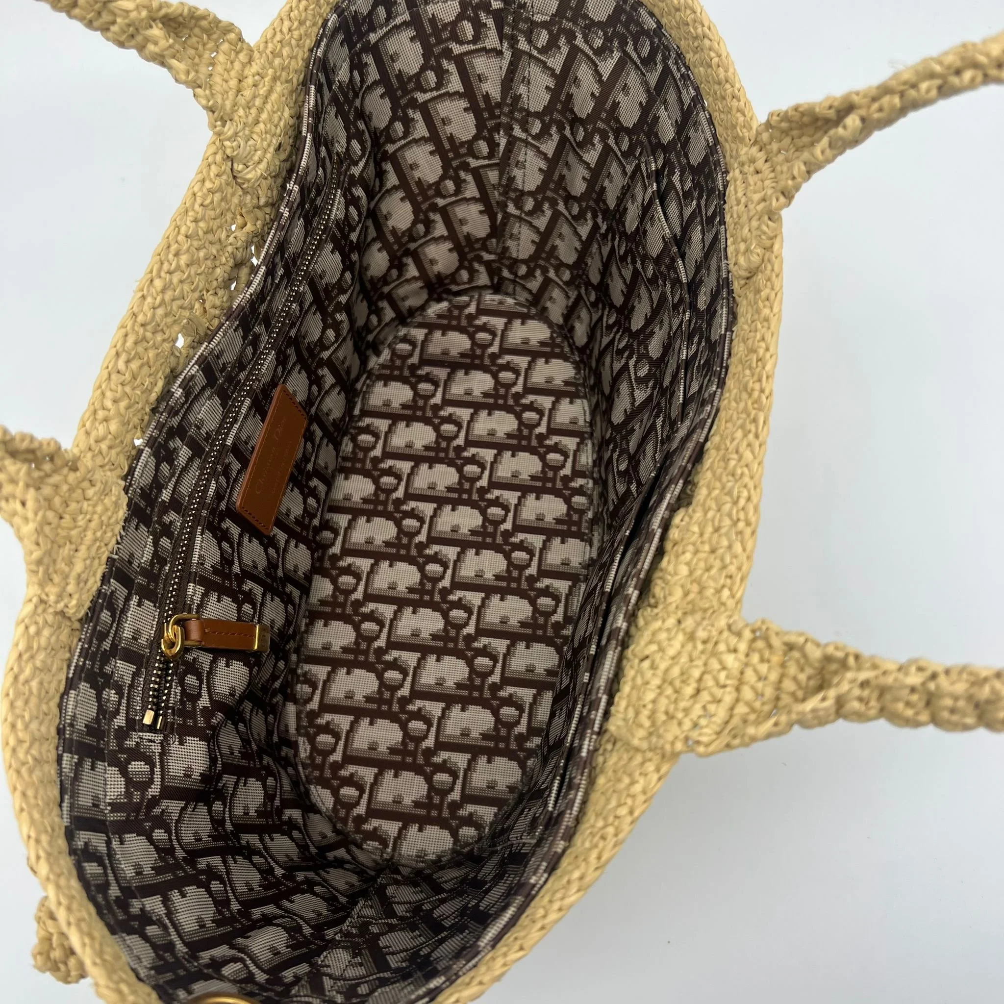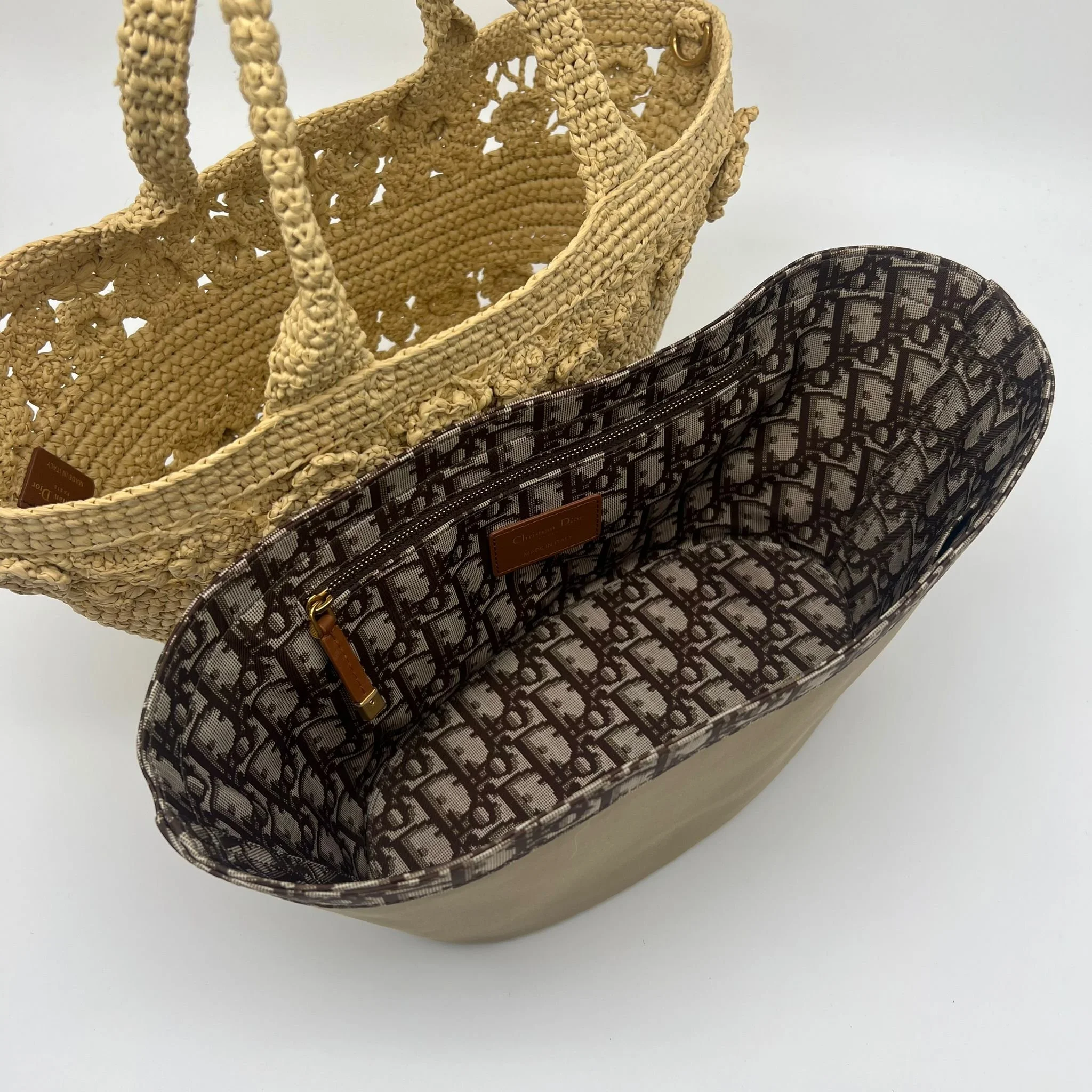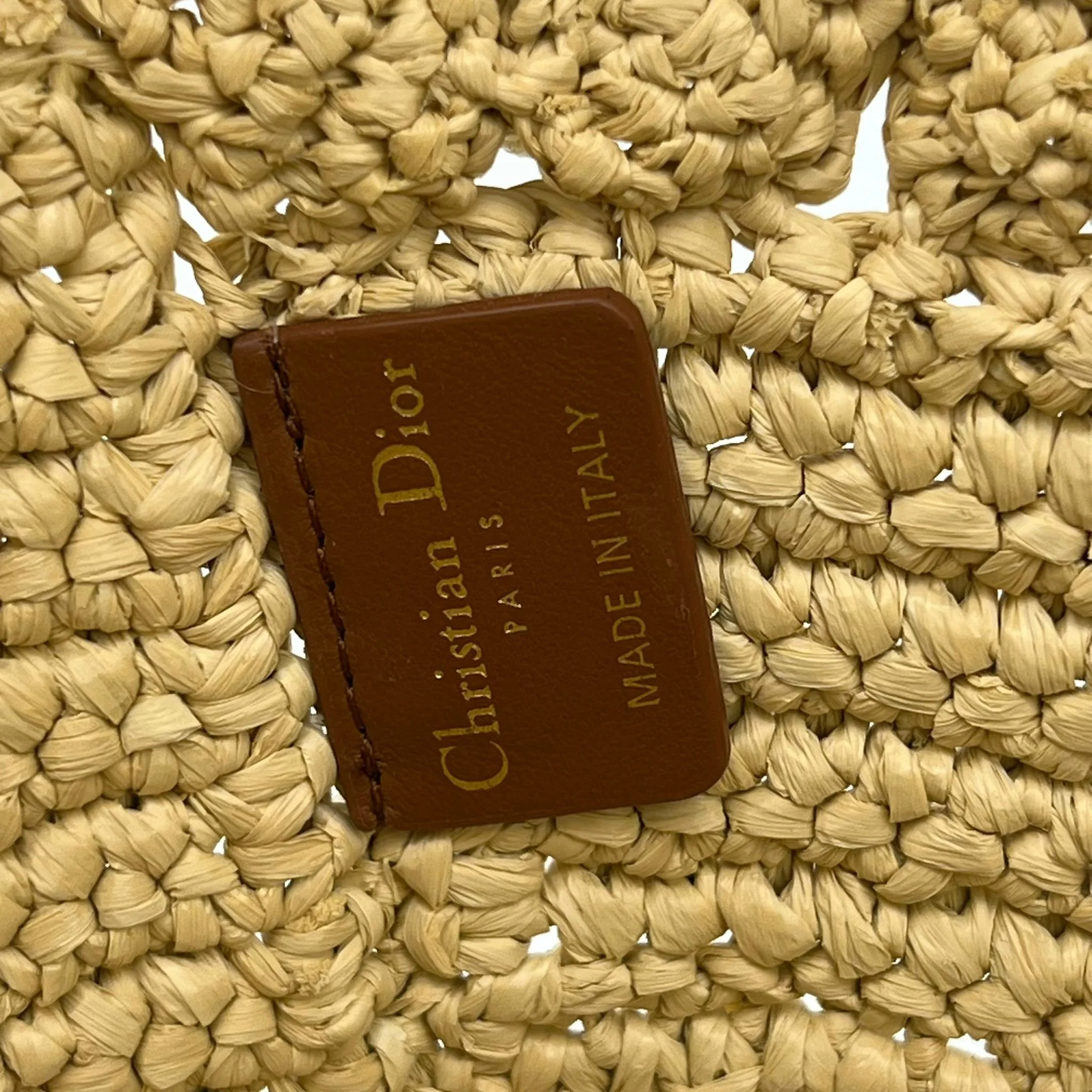 Item Description/Model: Christian Dior Woven Raffia Small Basket Book Tote Bag with Floral Embellished Detail Brown Oblique Canvas Lining
