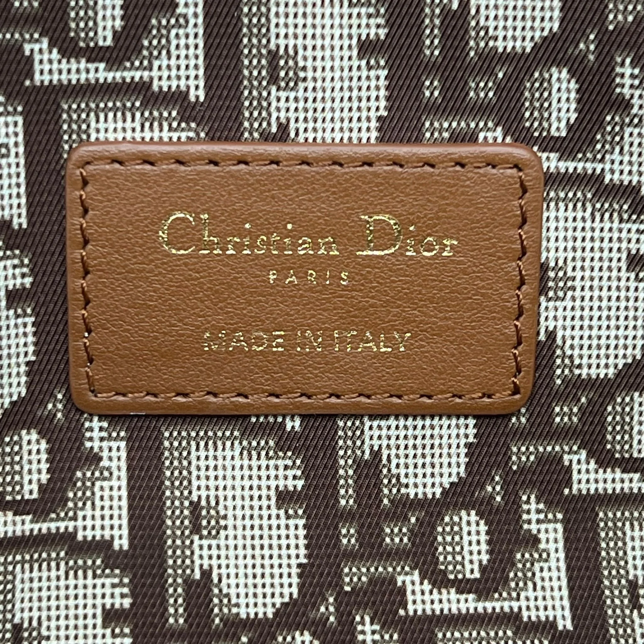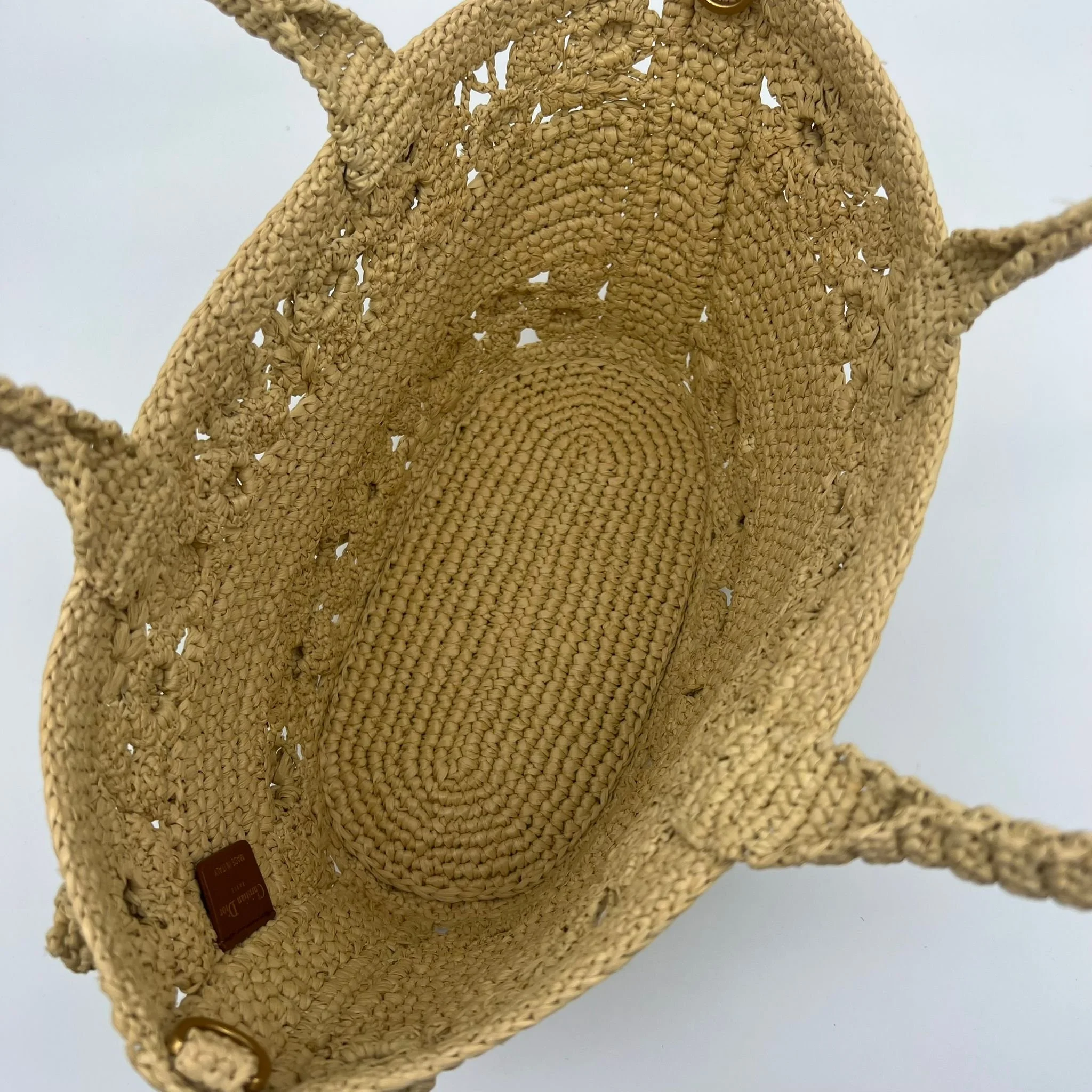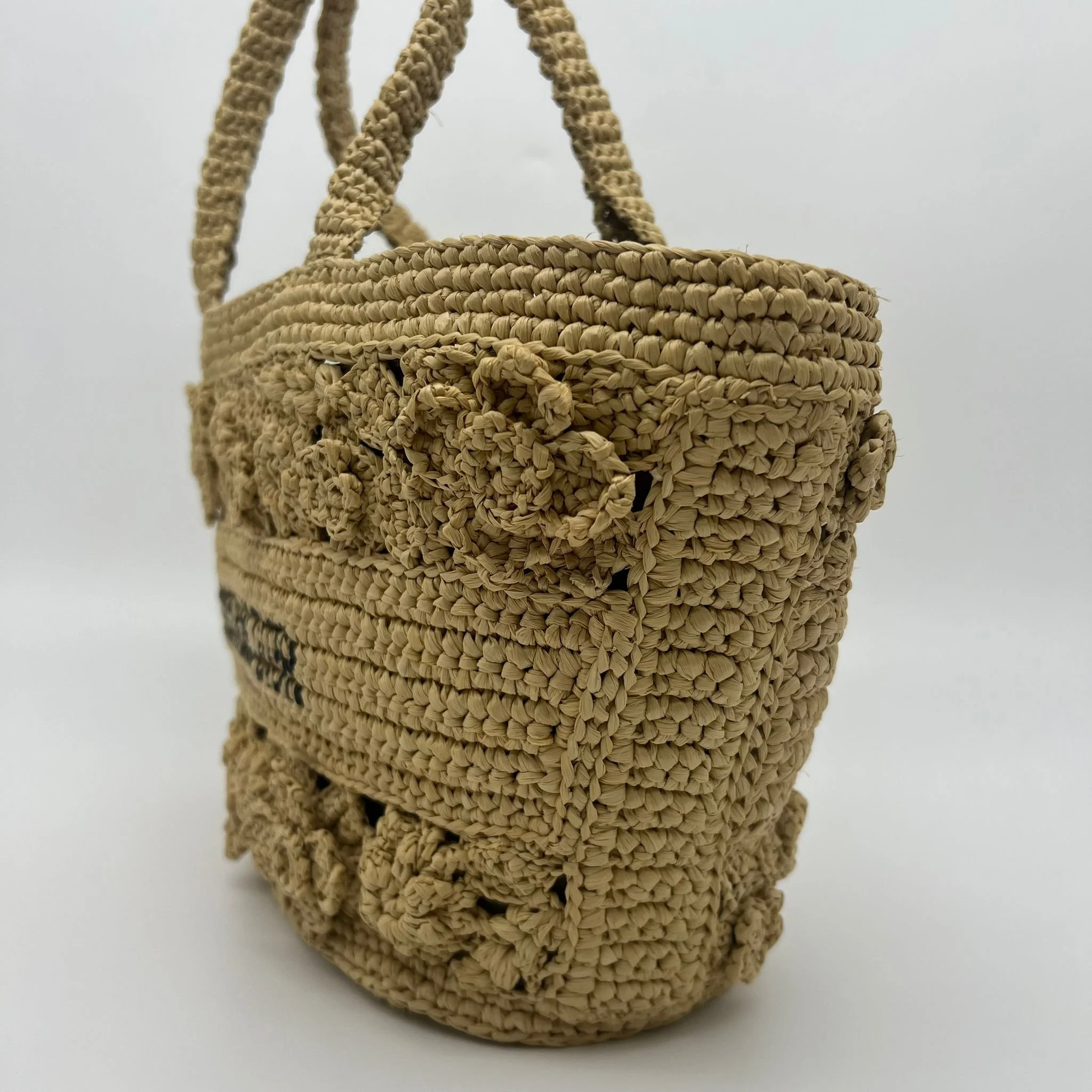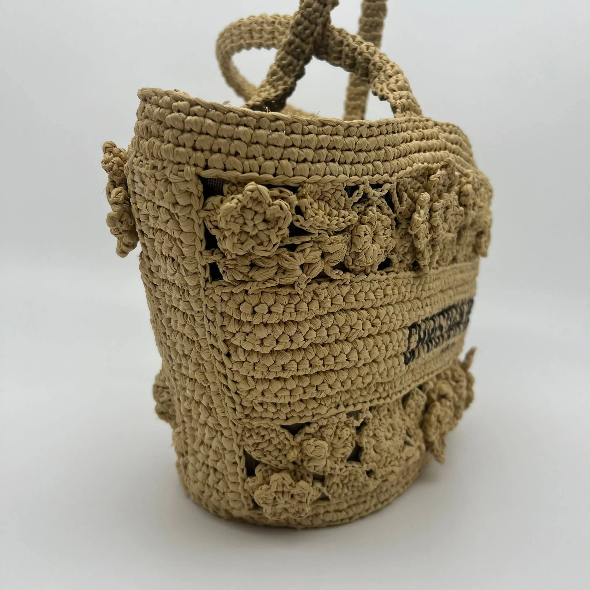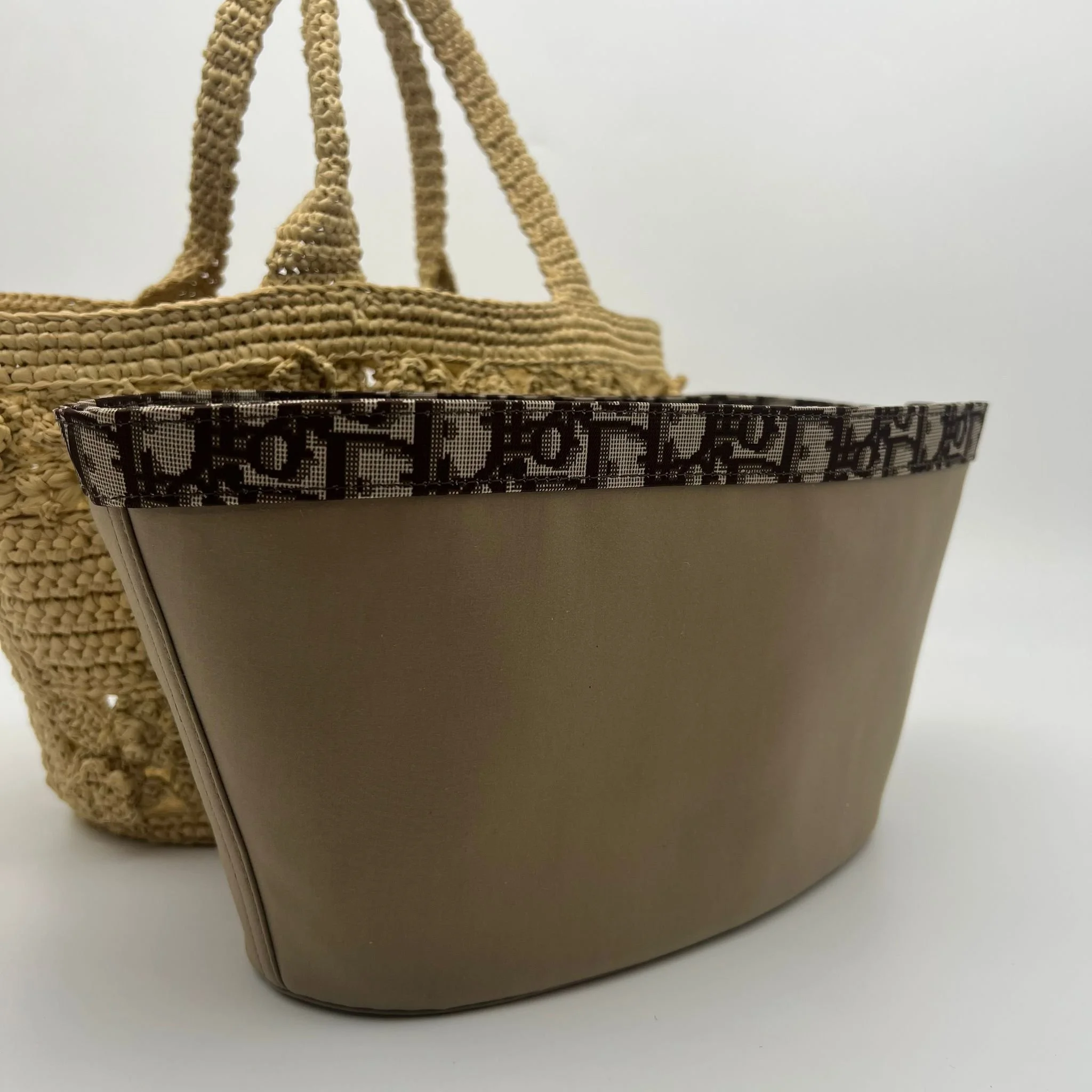 Item Description/Model: Christian Dior Woven Raffia Small Basket Book Tote Bag with Floral Embellished Detail Brown Oblique Canvas Lining
