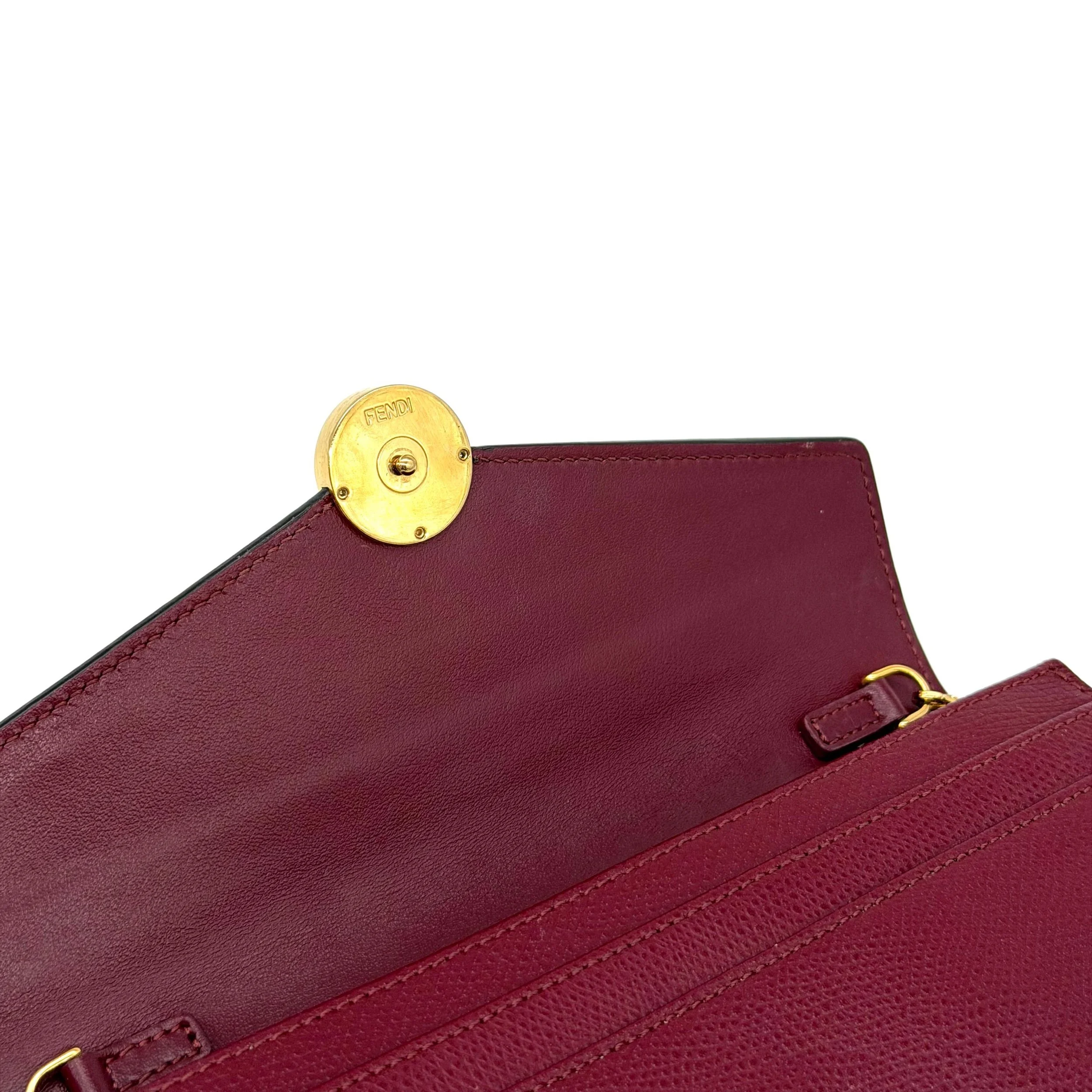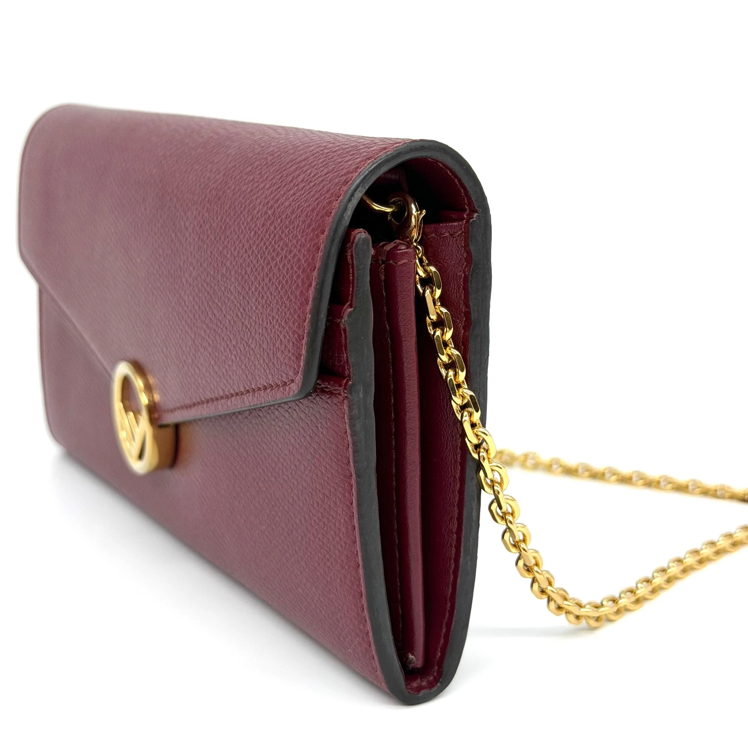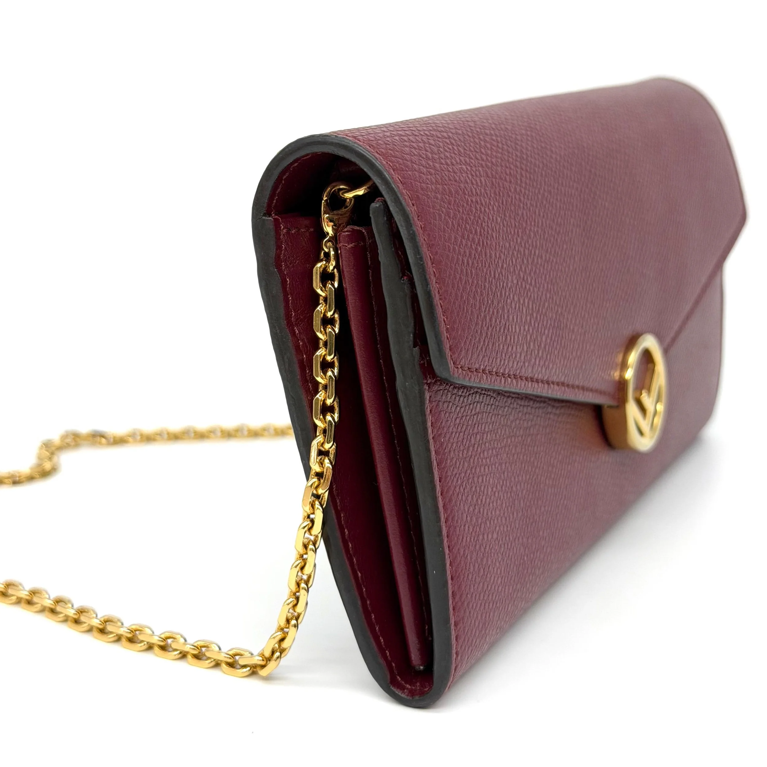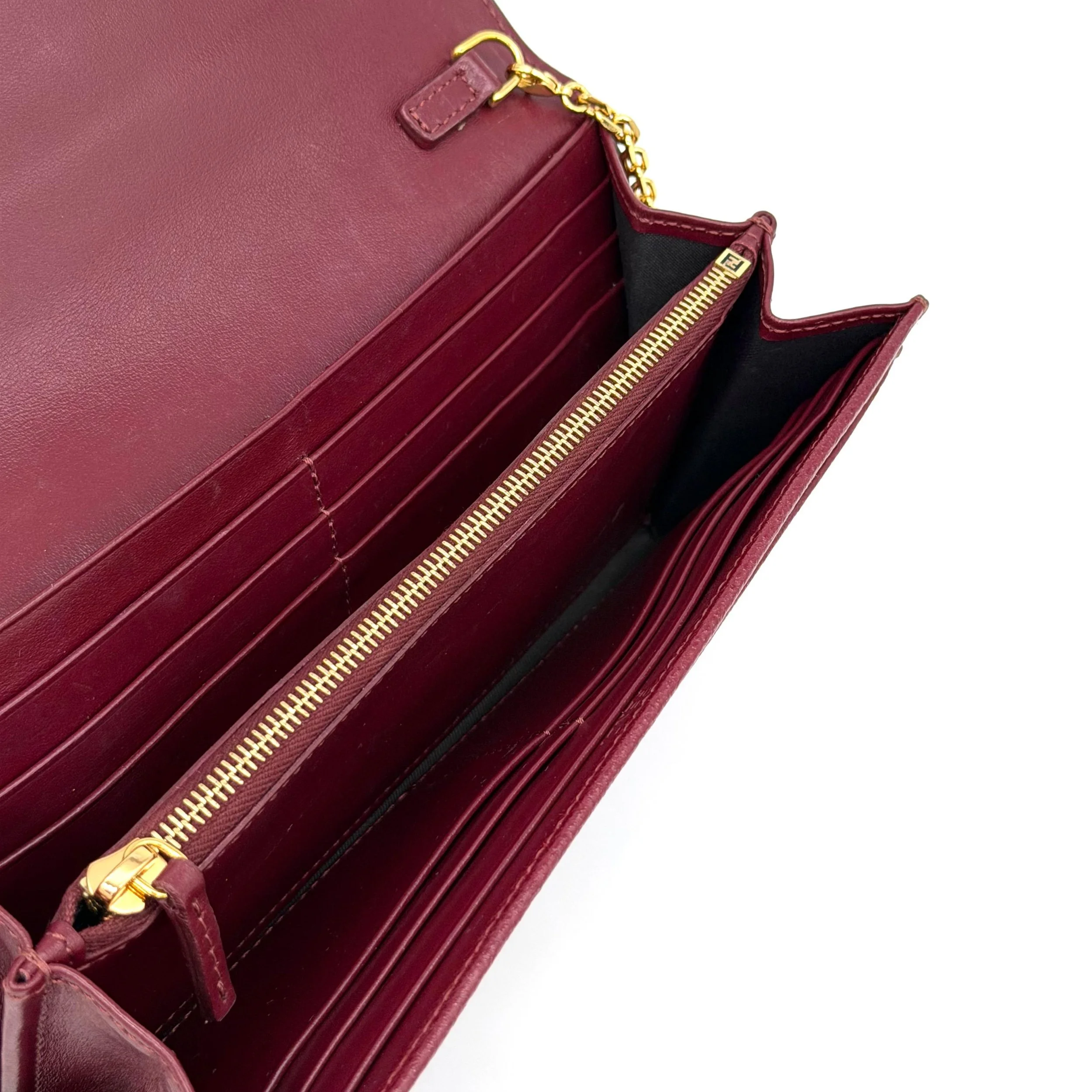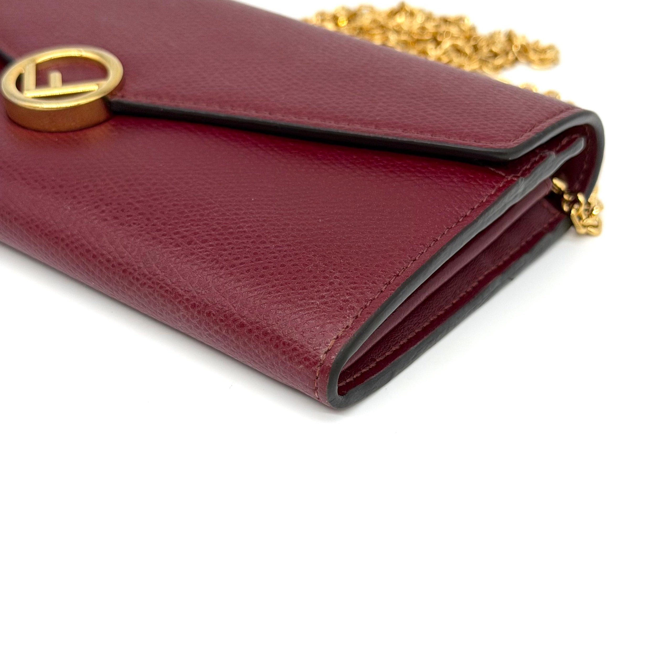 Item Description/Model: Fendi Continental Wallet on Chain Bag Burgundy Grained Leather with Gold Hardware