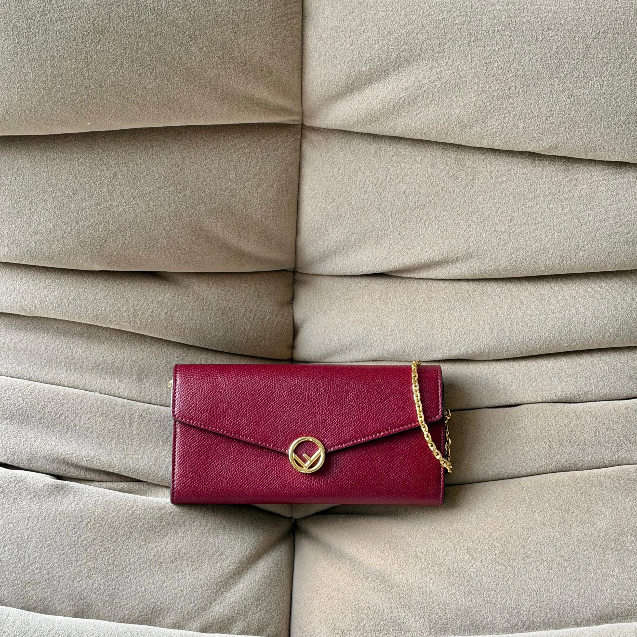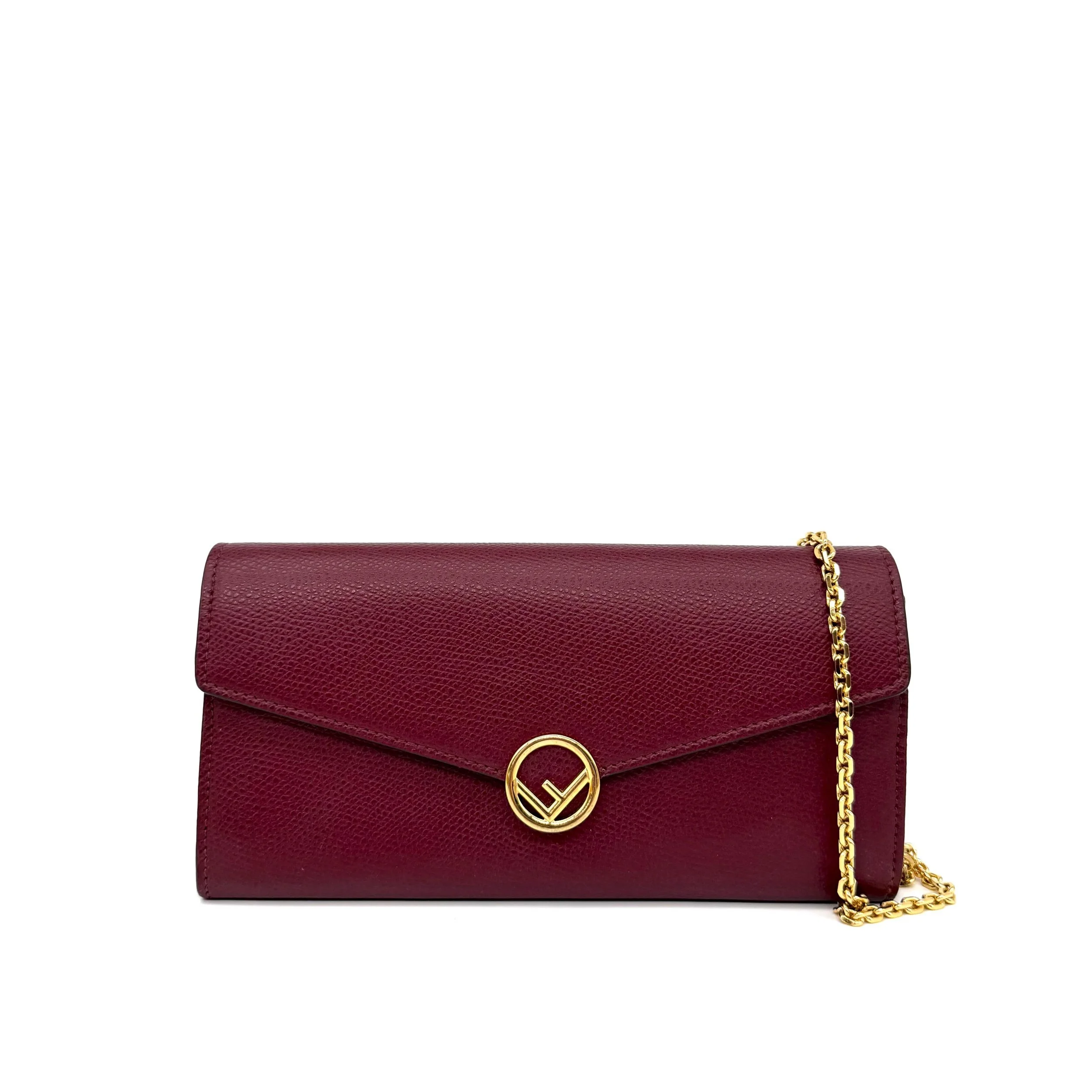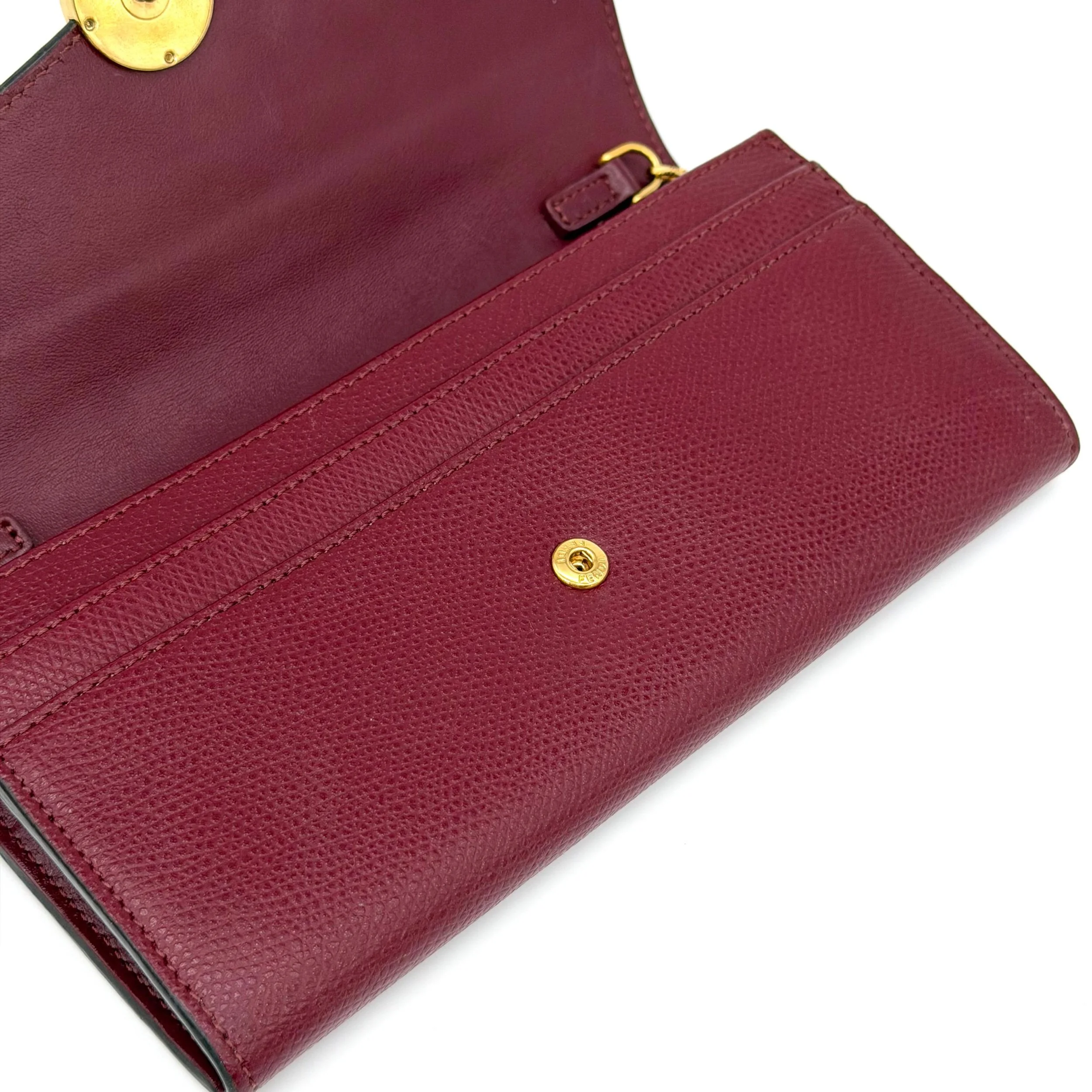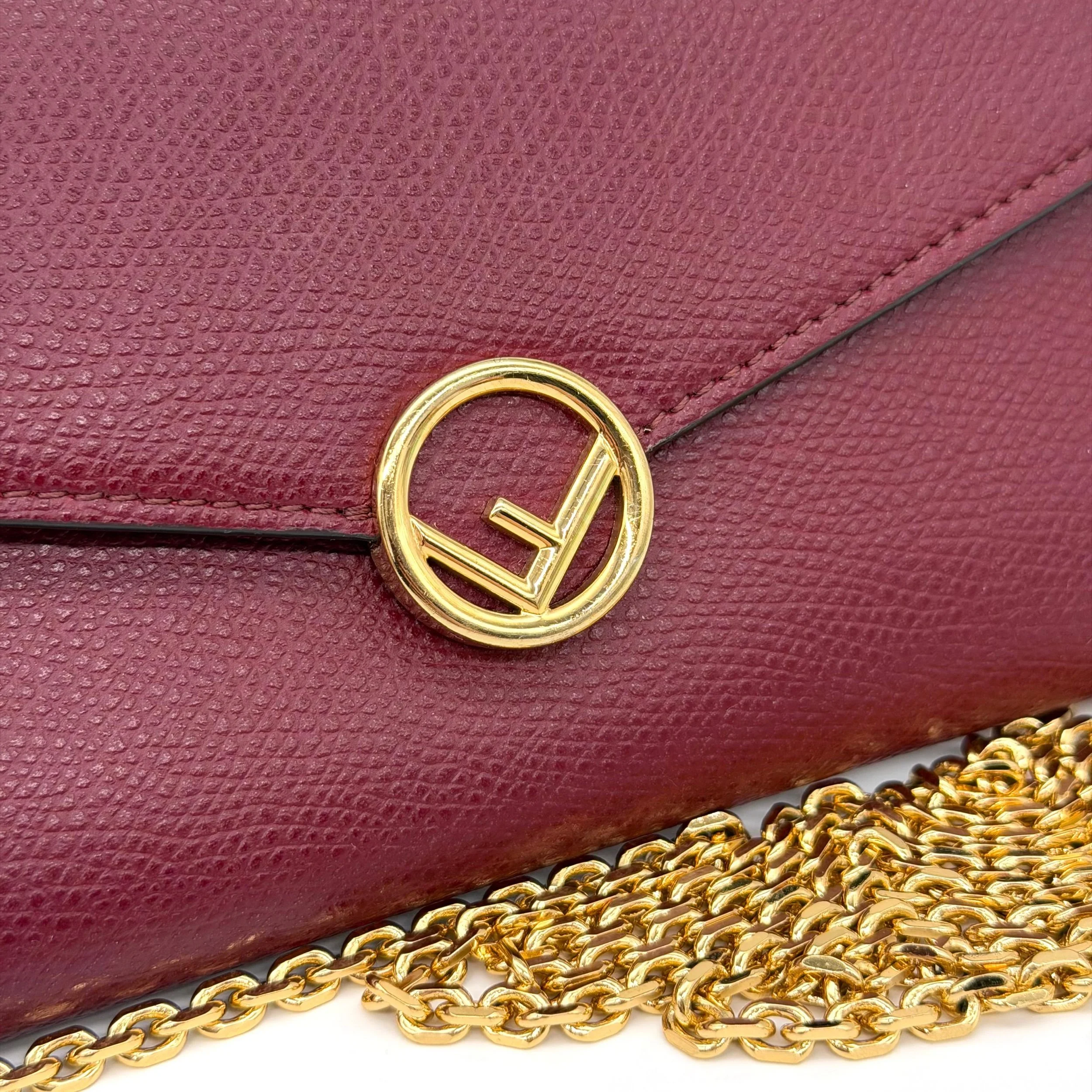 Item Description/Model: Fendi Continental Wallet on Chain Bag Burgundy Grained Leather with Gold Hardware