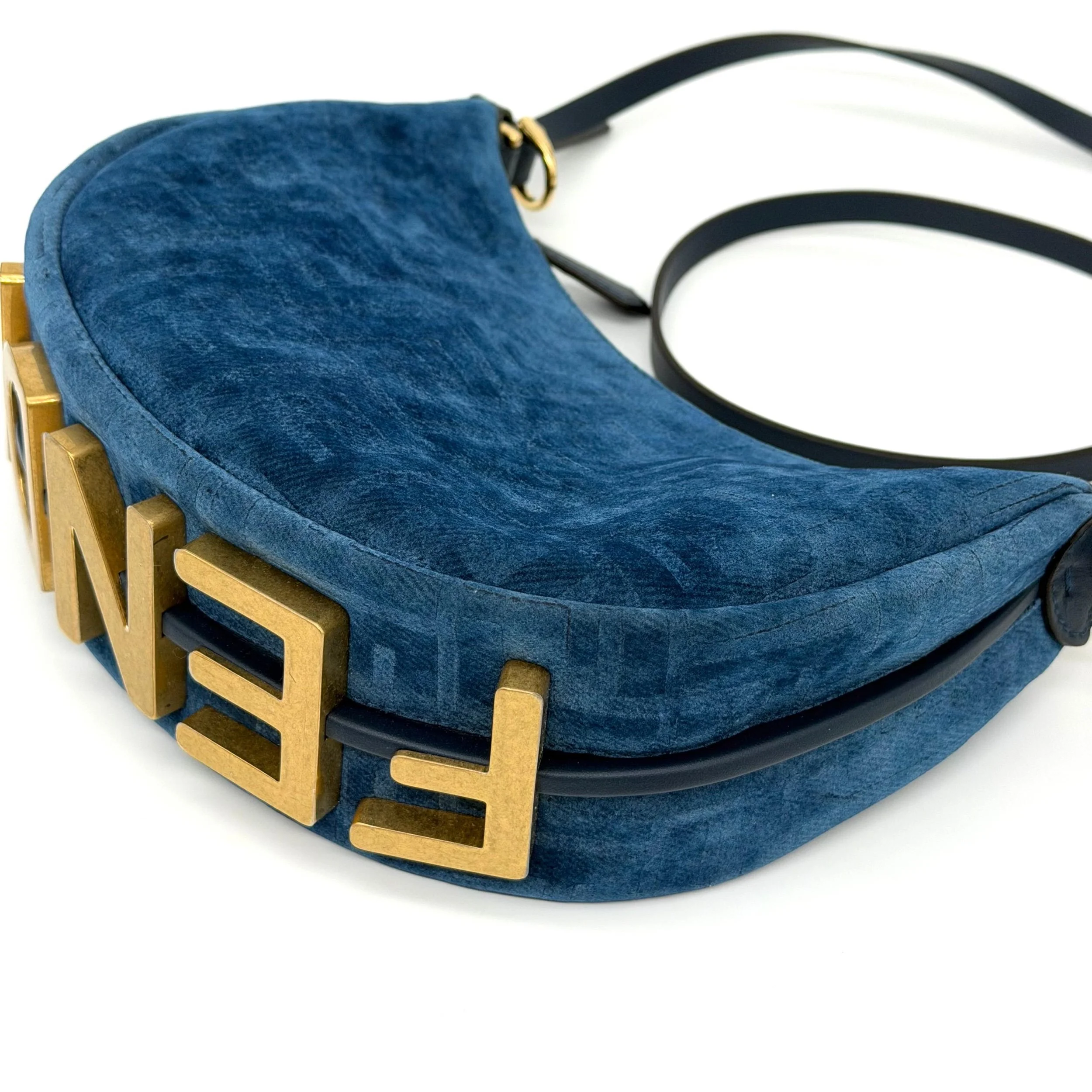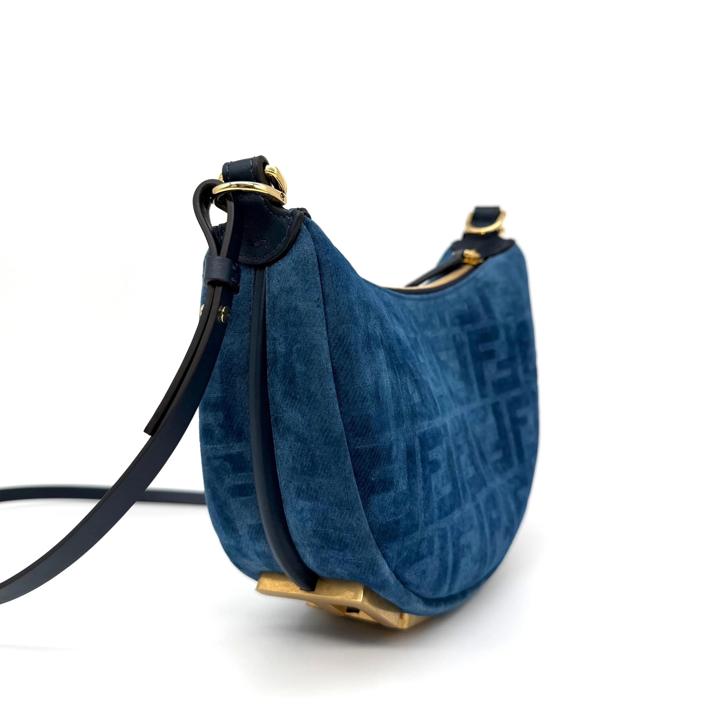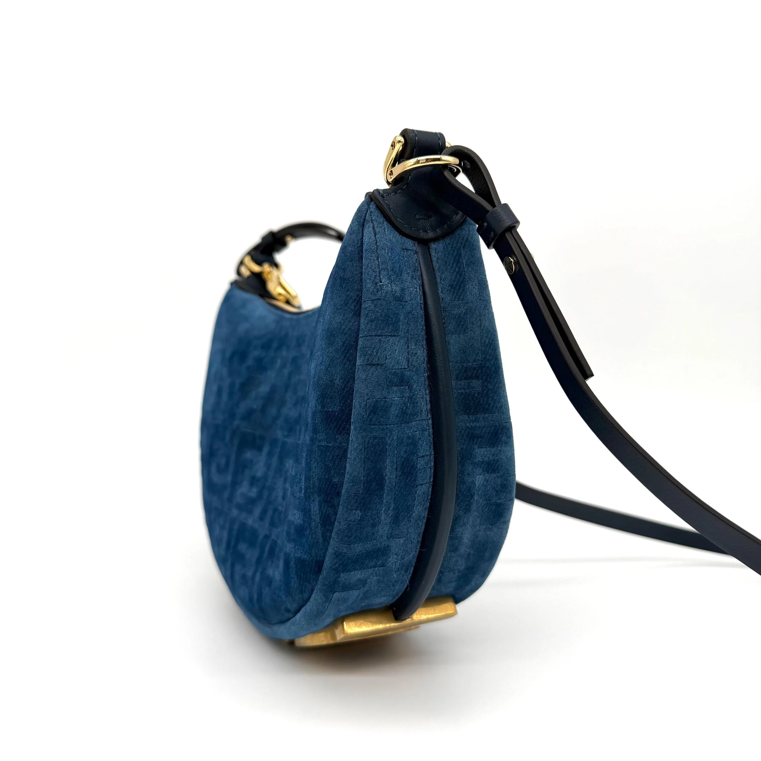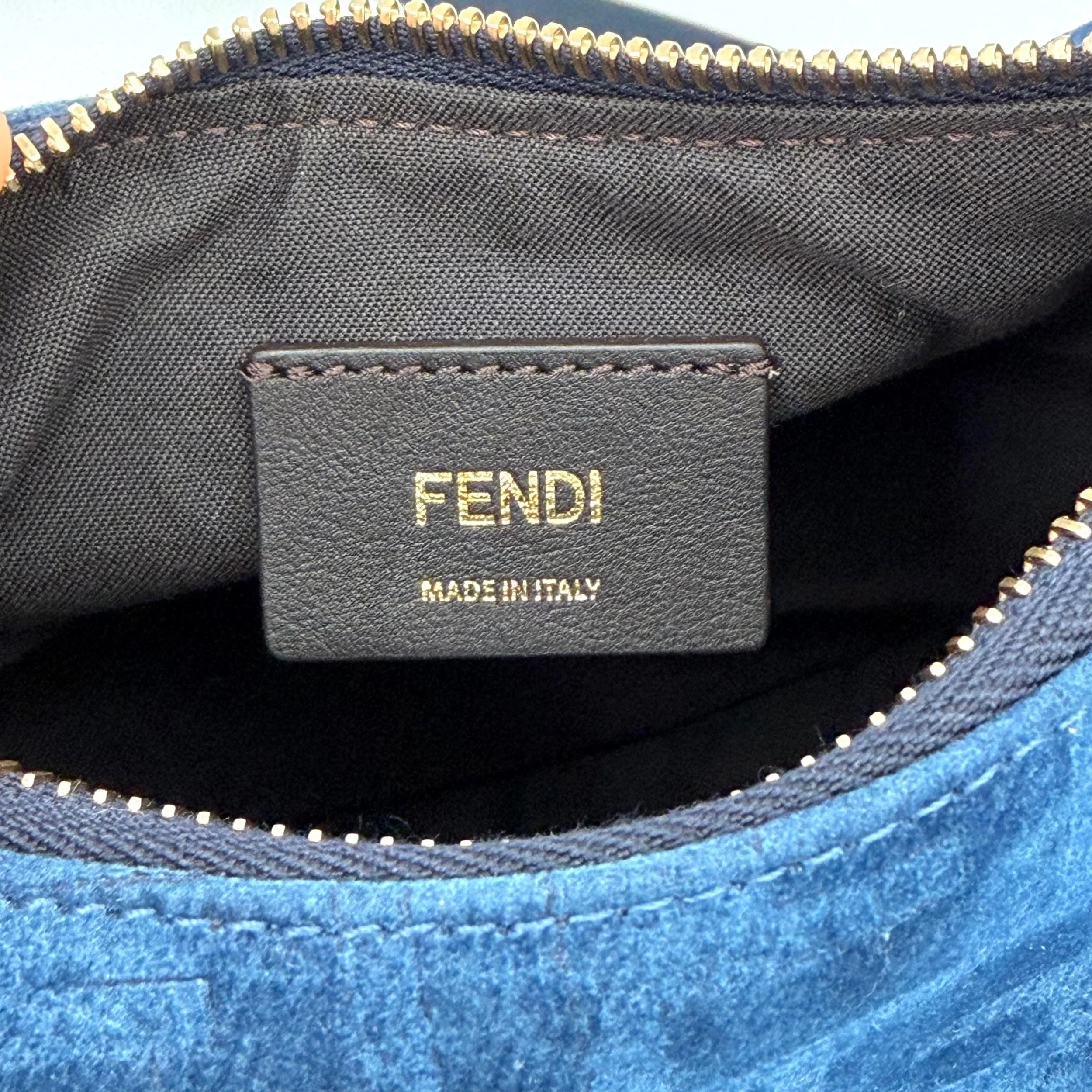 Item Description/Model: Fendi Fendigraphy FF Mini Denim Velvety Navy Blue Flocked Hobo Bag with Gold Hardware