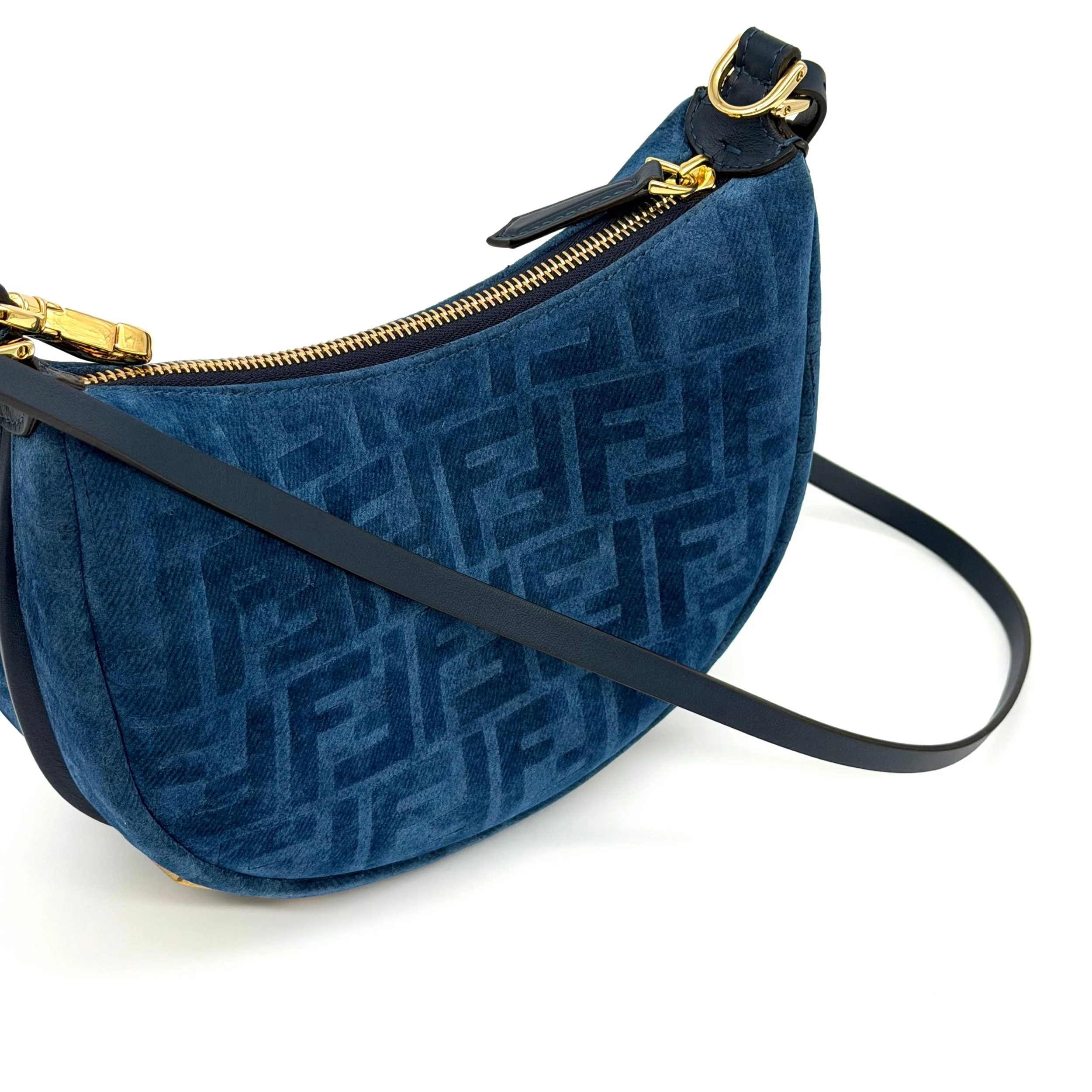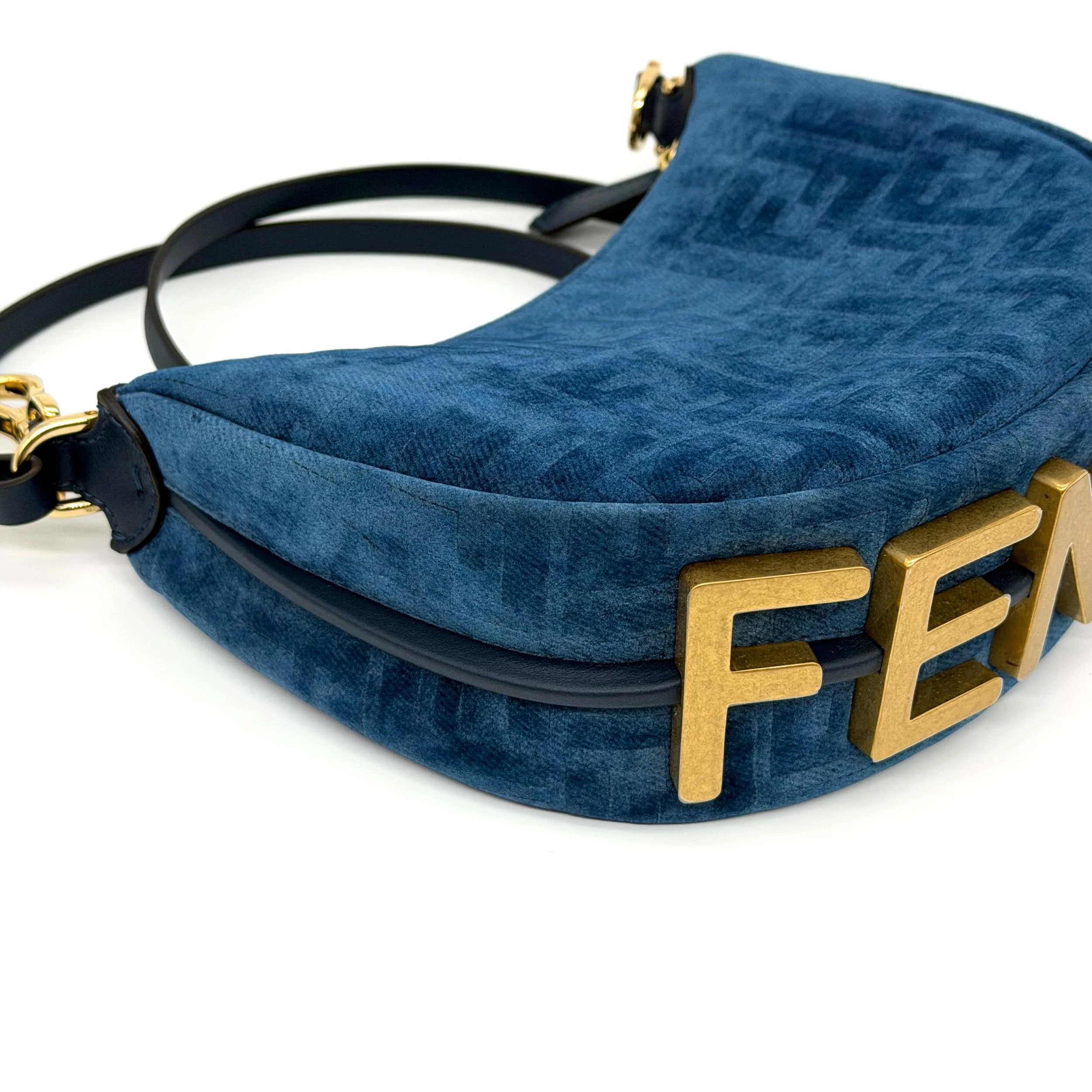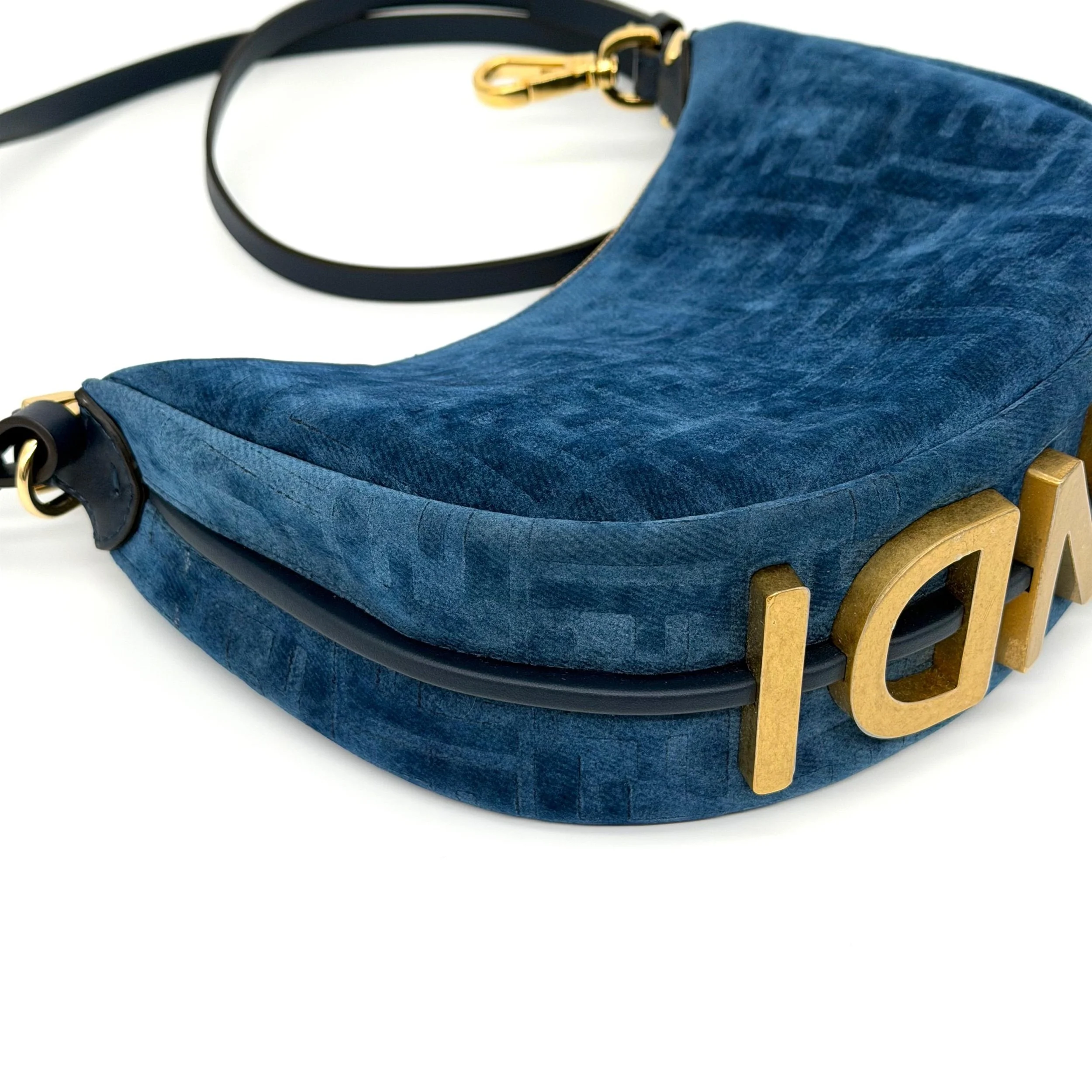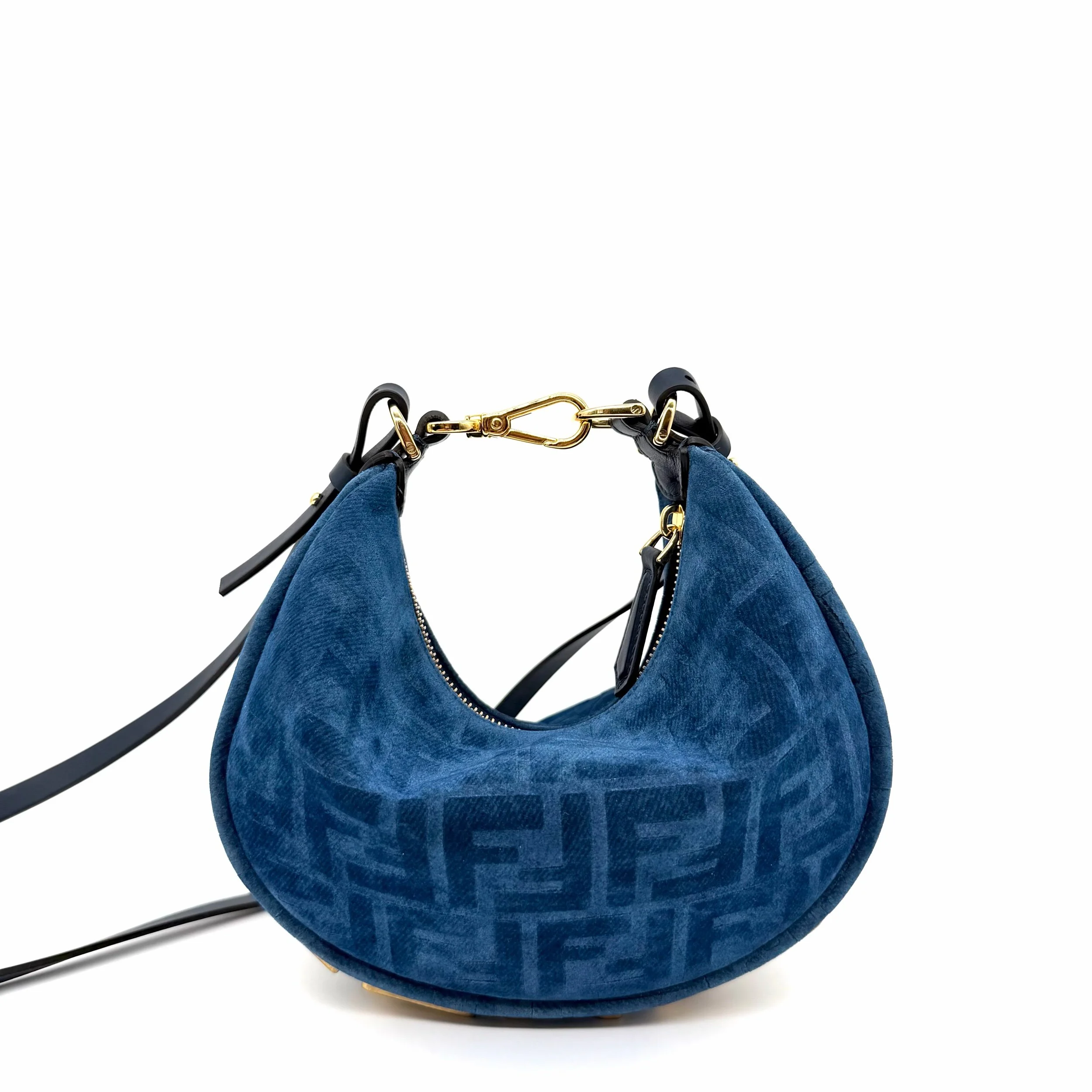Item Description/Model: Fendi Fendigraphy FF Mini Denim Velvety Navy Blue Flocked Hobo Bag with Gold Hardware