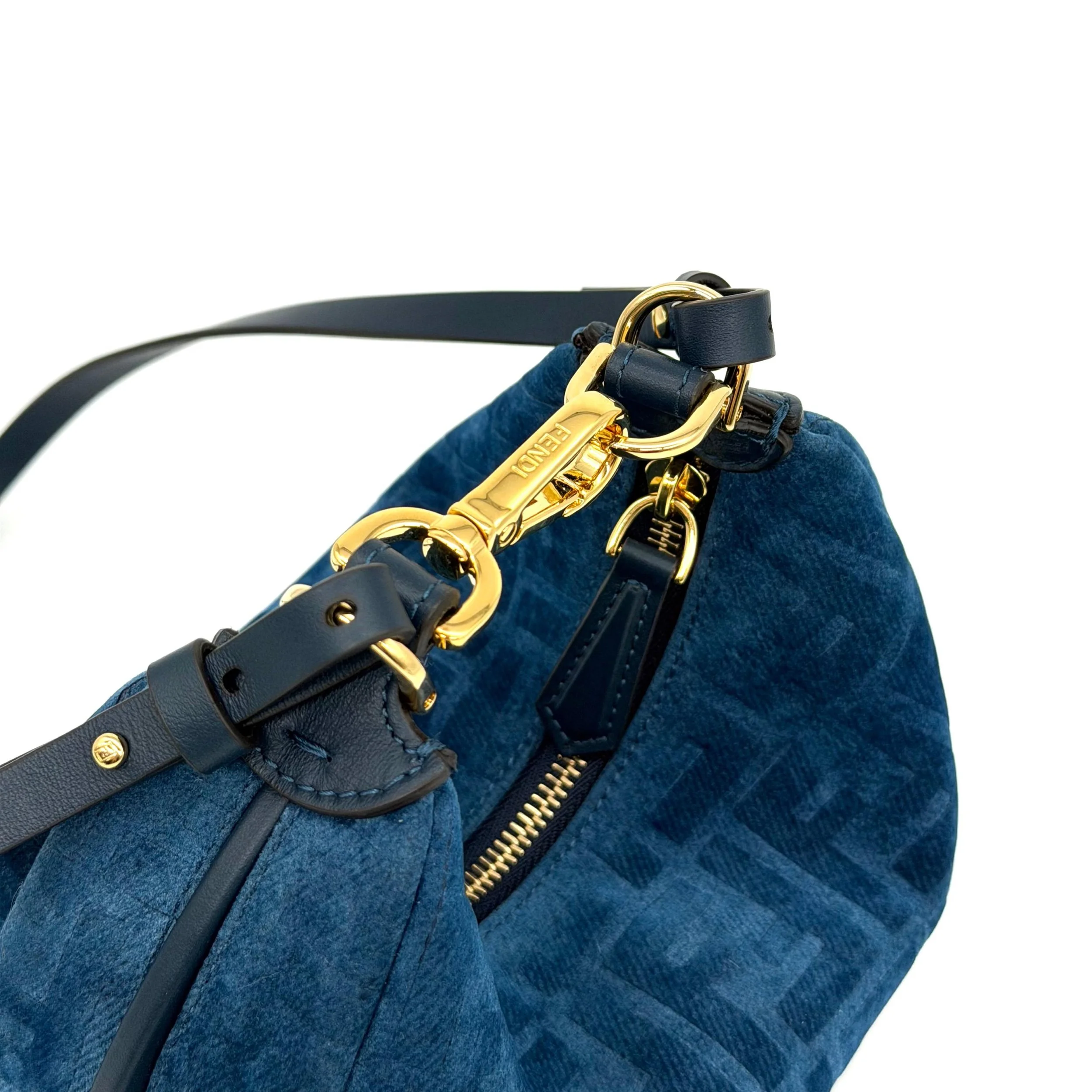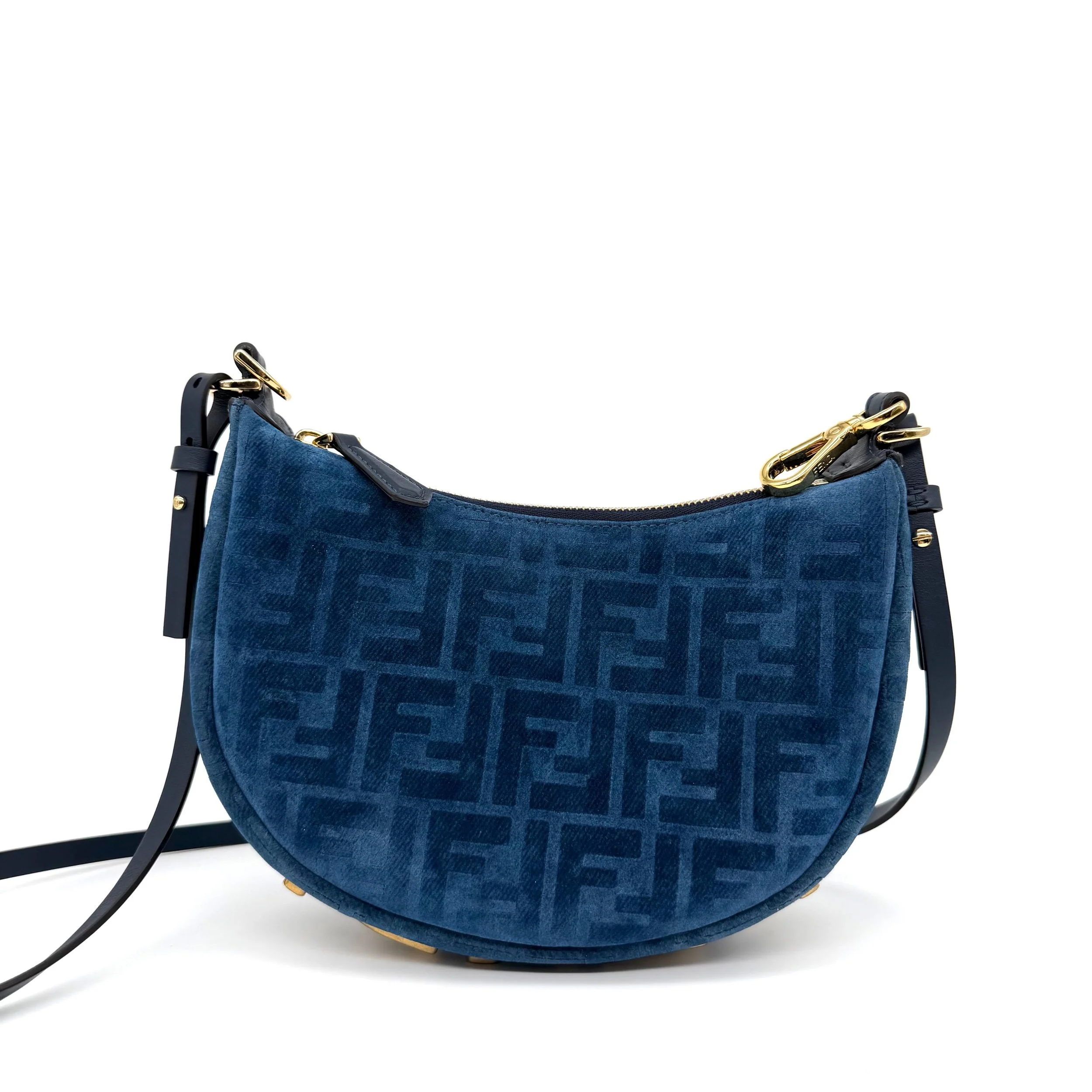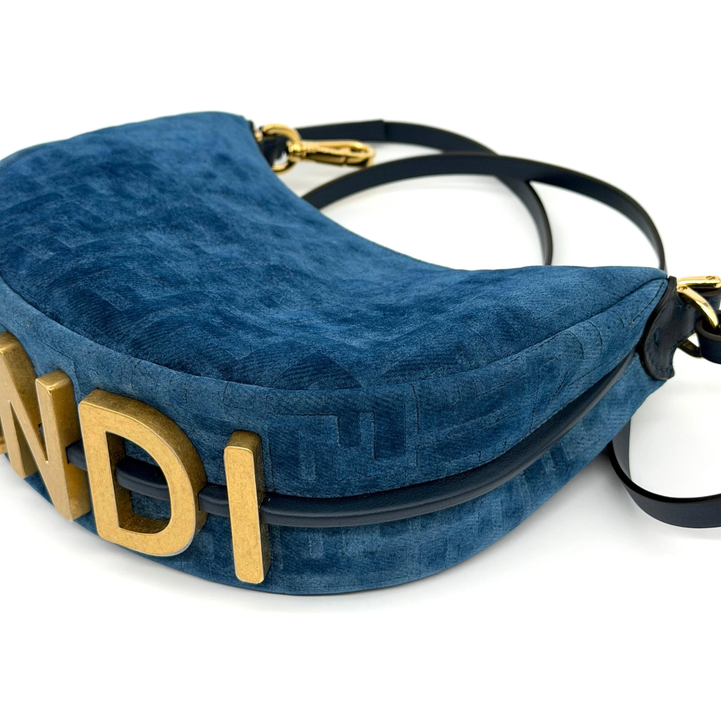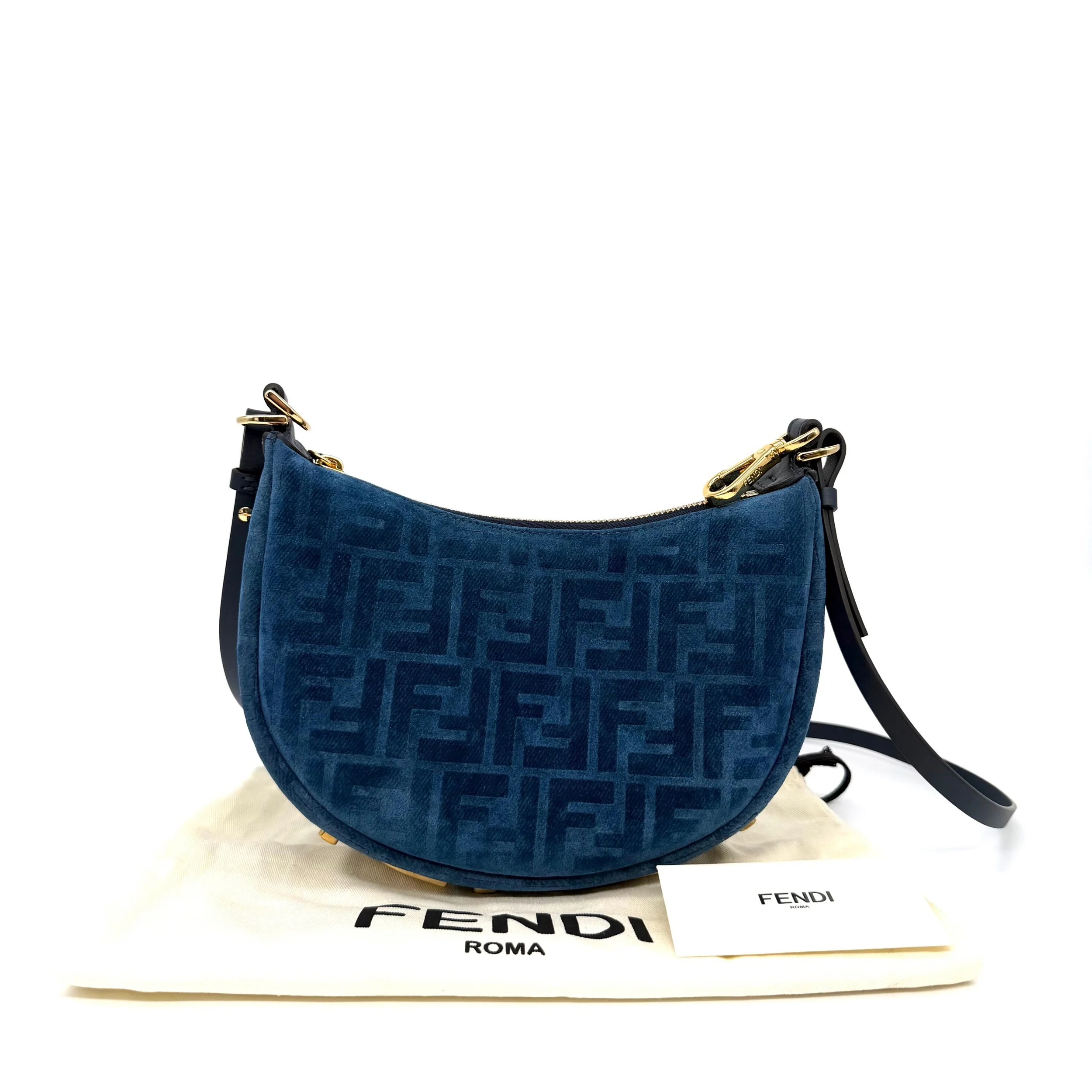 Item Description/Model: Fendi Fendigraphy FF Mini Denim Velvety Navy Blue Flocked Hobo Bag with Gold Hardware