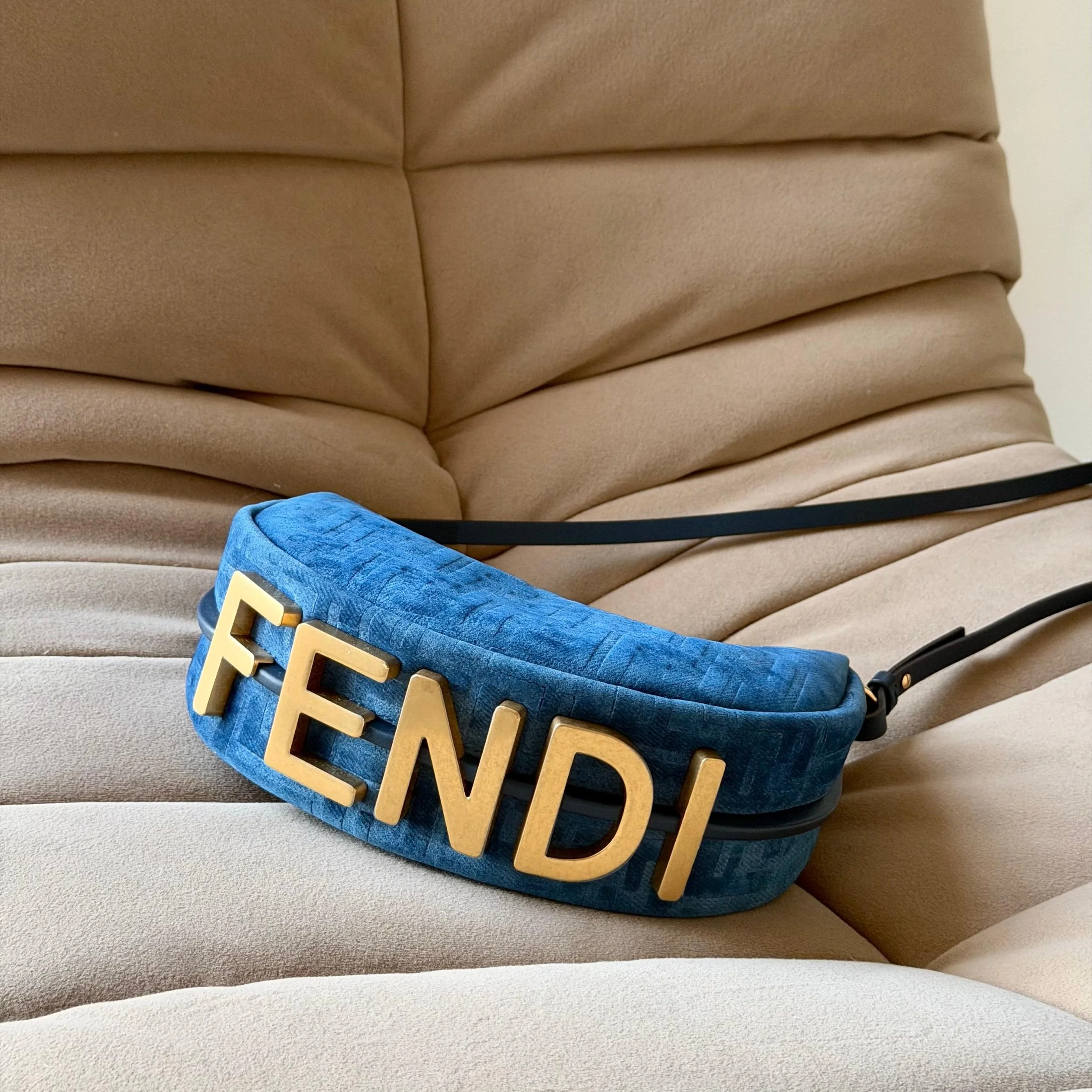 Incredible soft velvety material with the classic FF Monogram and Fendigraphy Hardware, stand out piece.