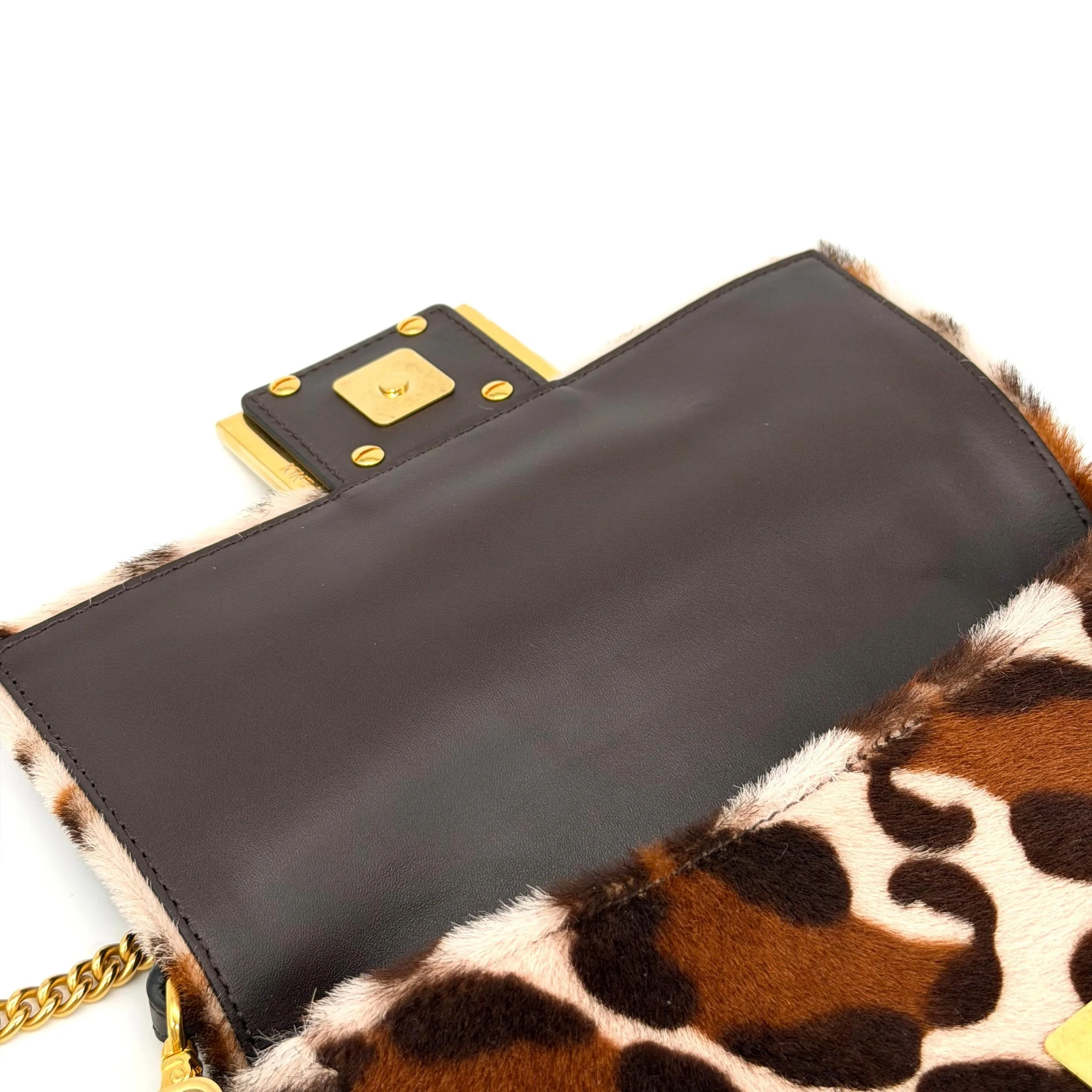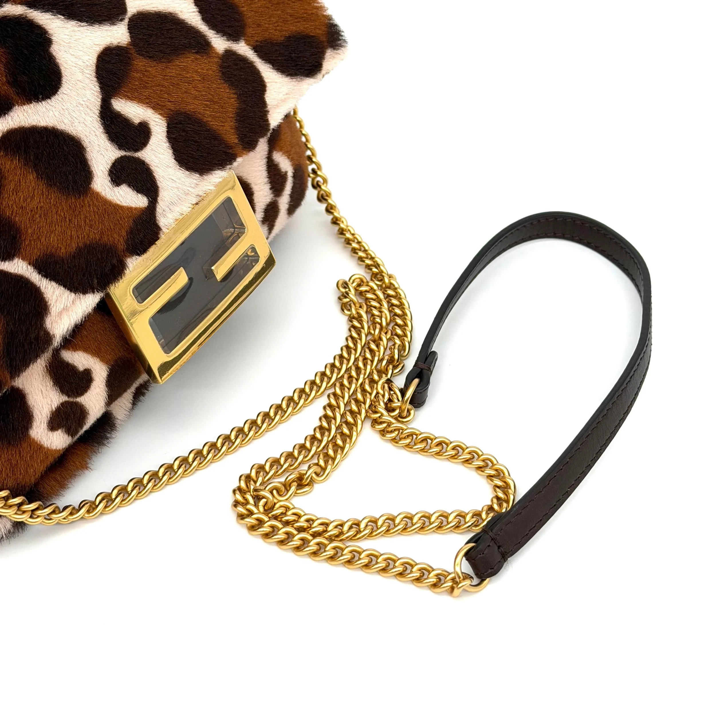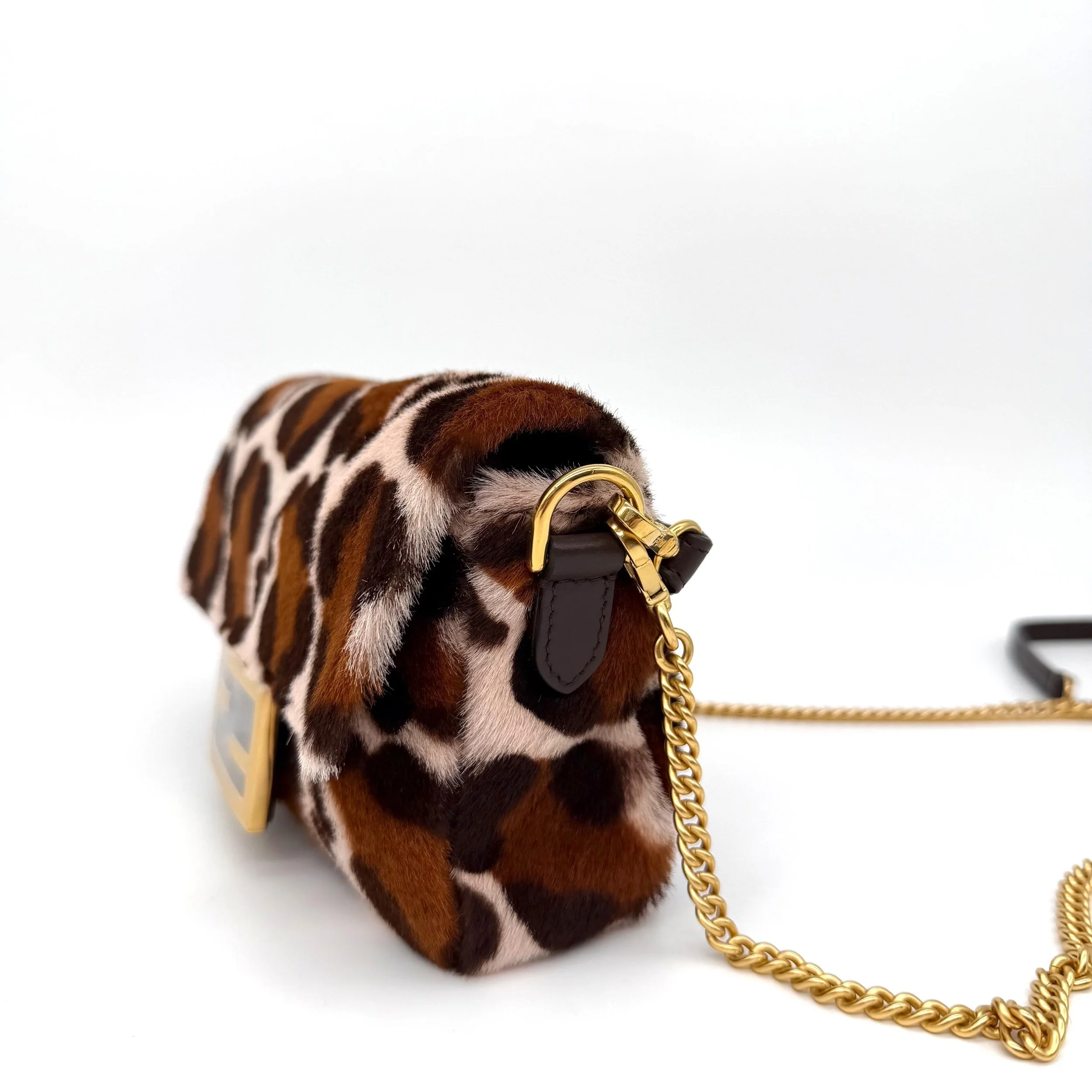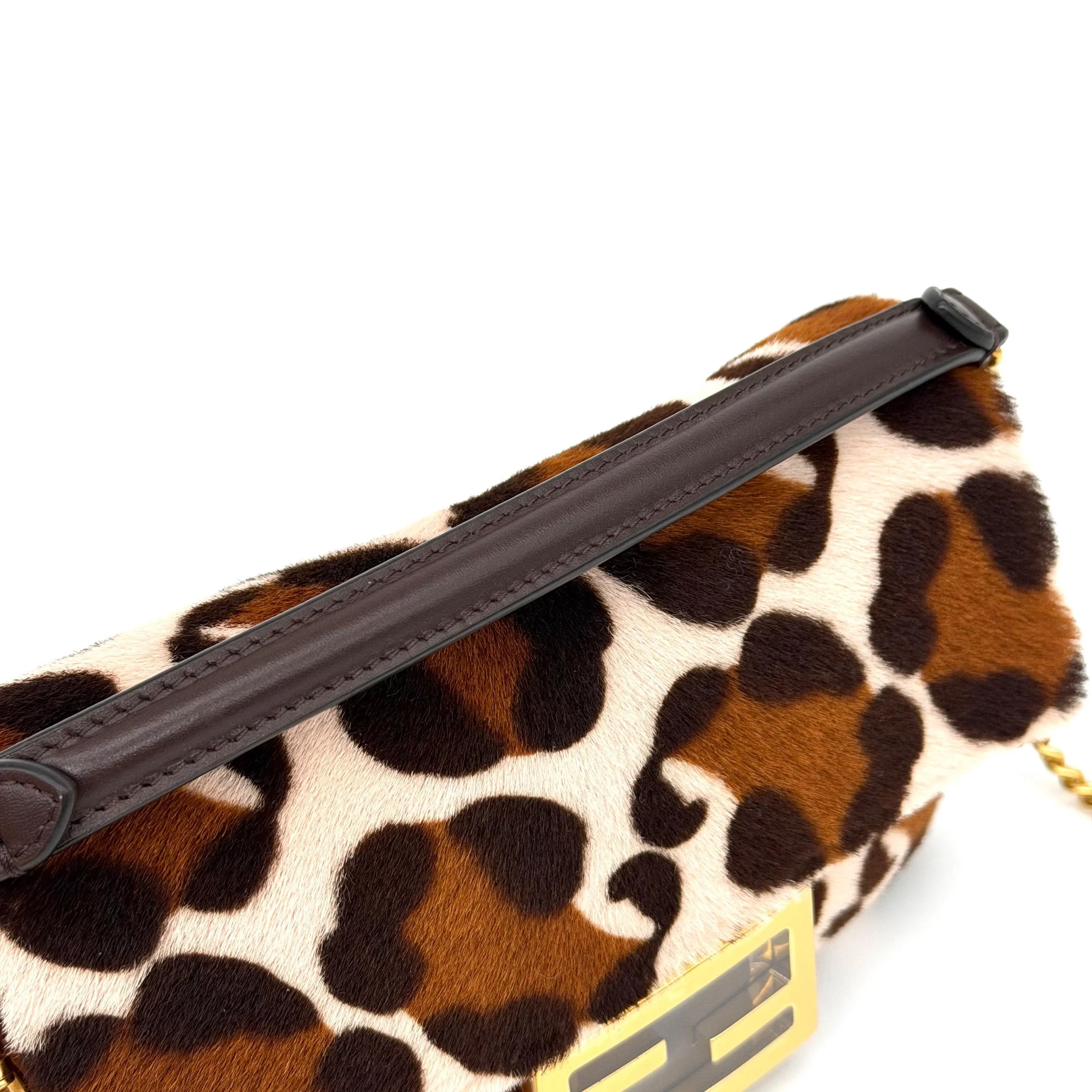 Item Description/Model: Fendi Mini Baguette Chain Bag in Brown Leopard Print Pony Hair with Gold Hardware