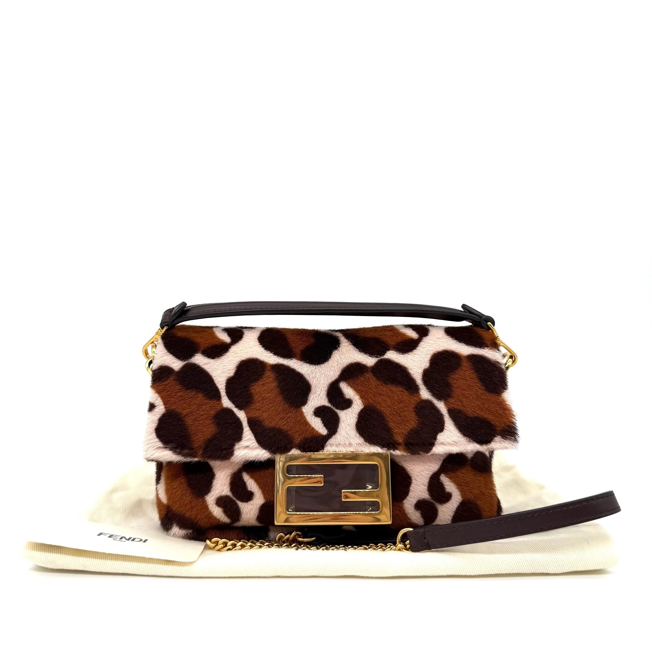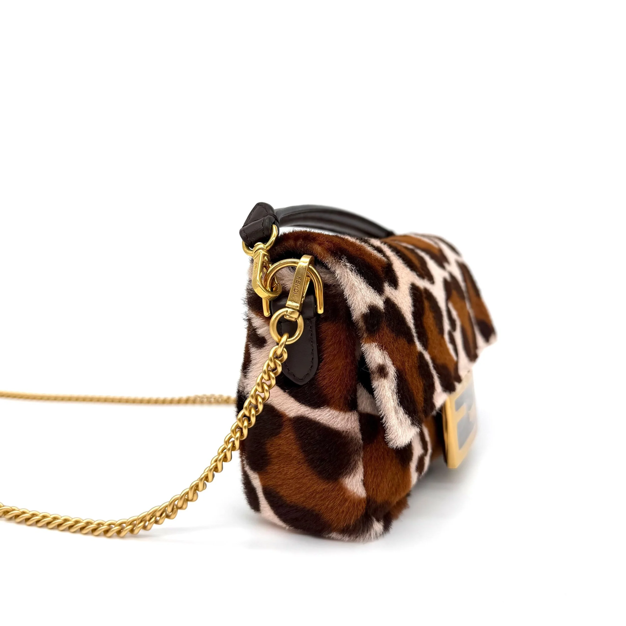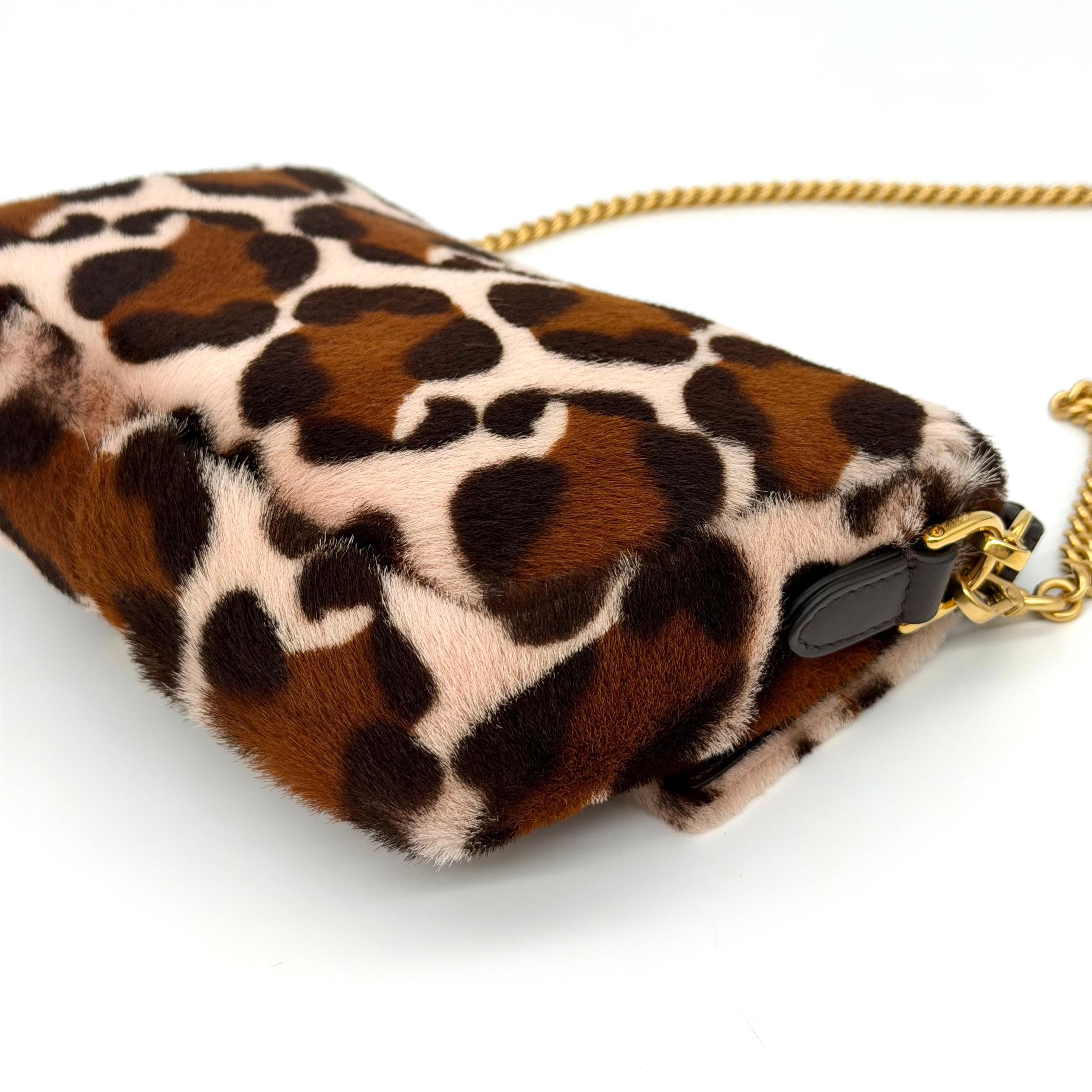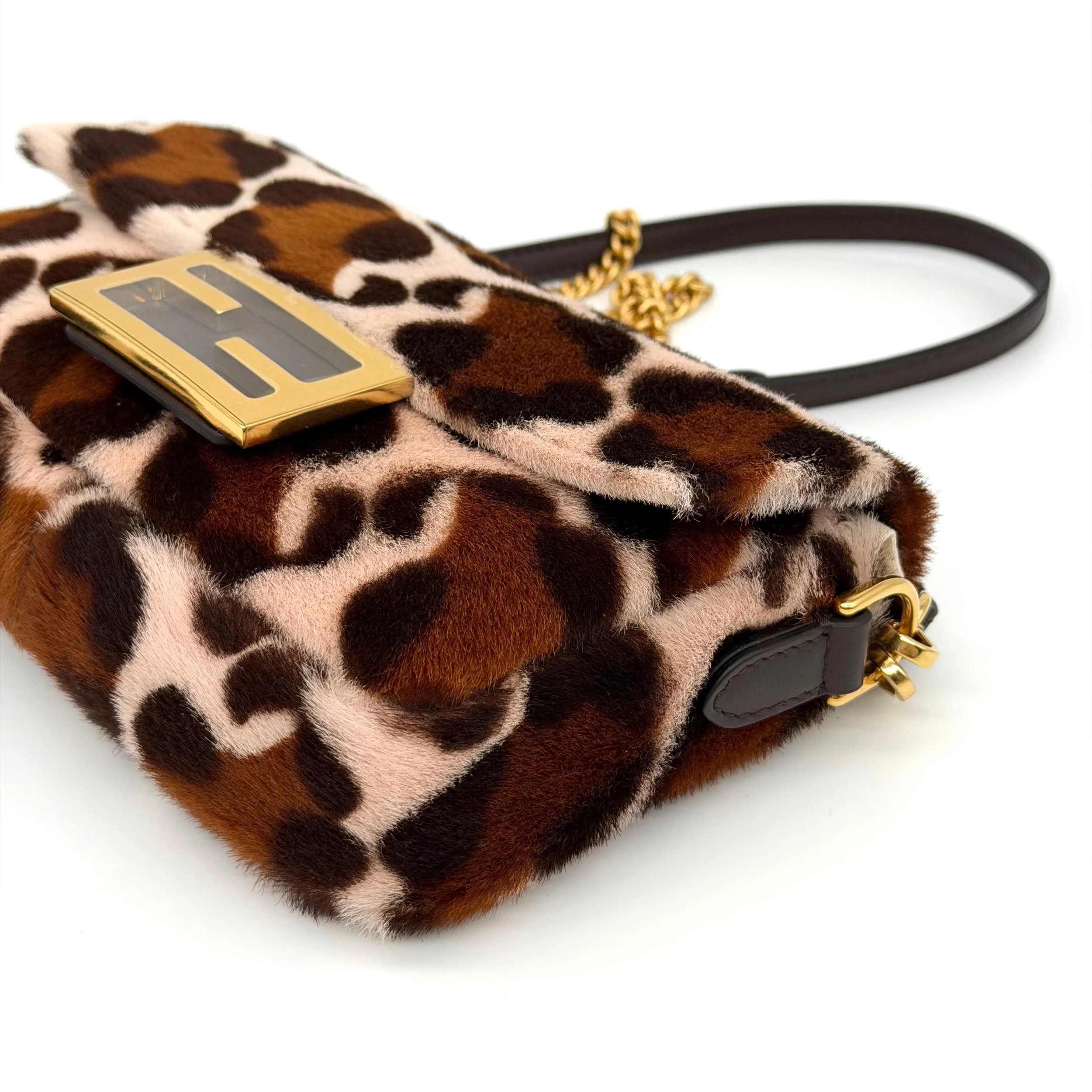 Item Description/Model: Fendi Mini Baguette Chain Bag in Brown Leopard Print Pony Hair with Gold Hardware