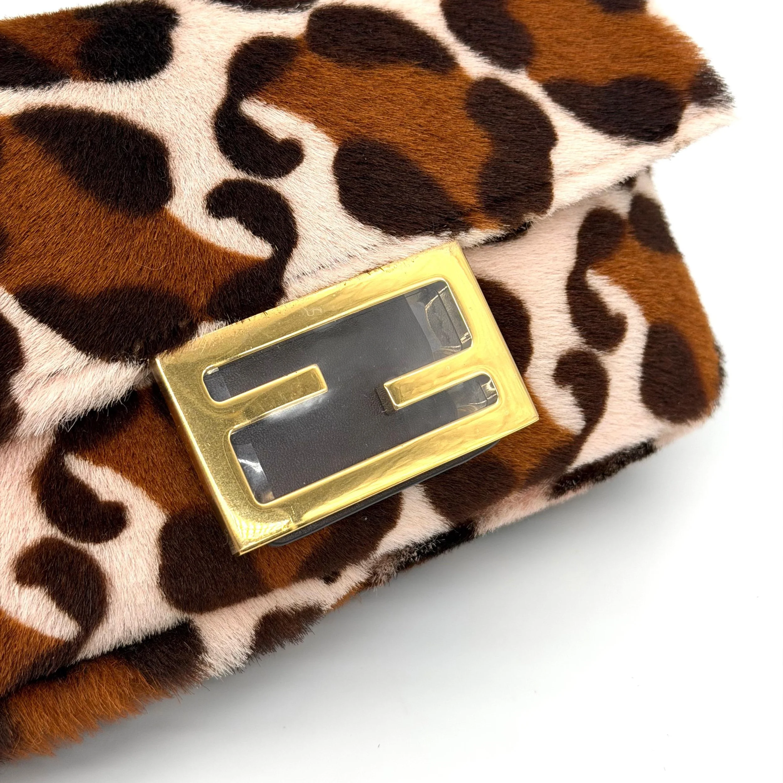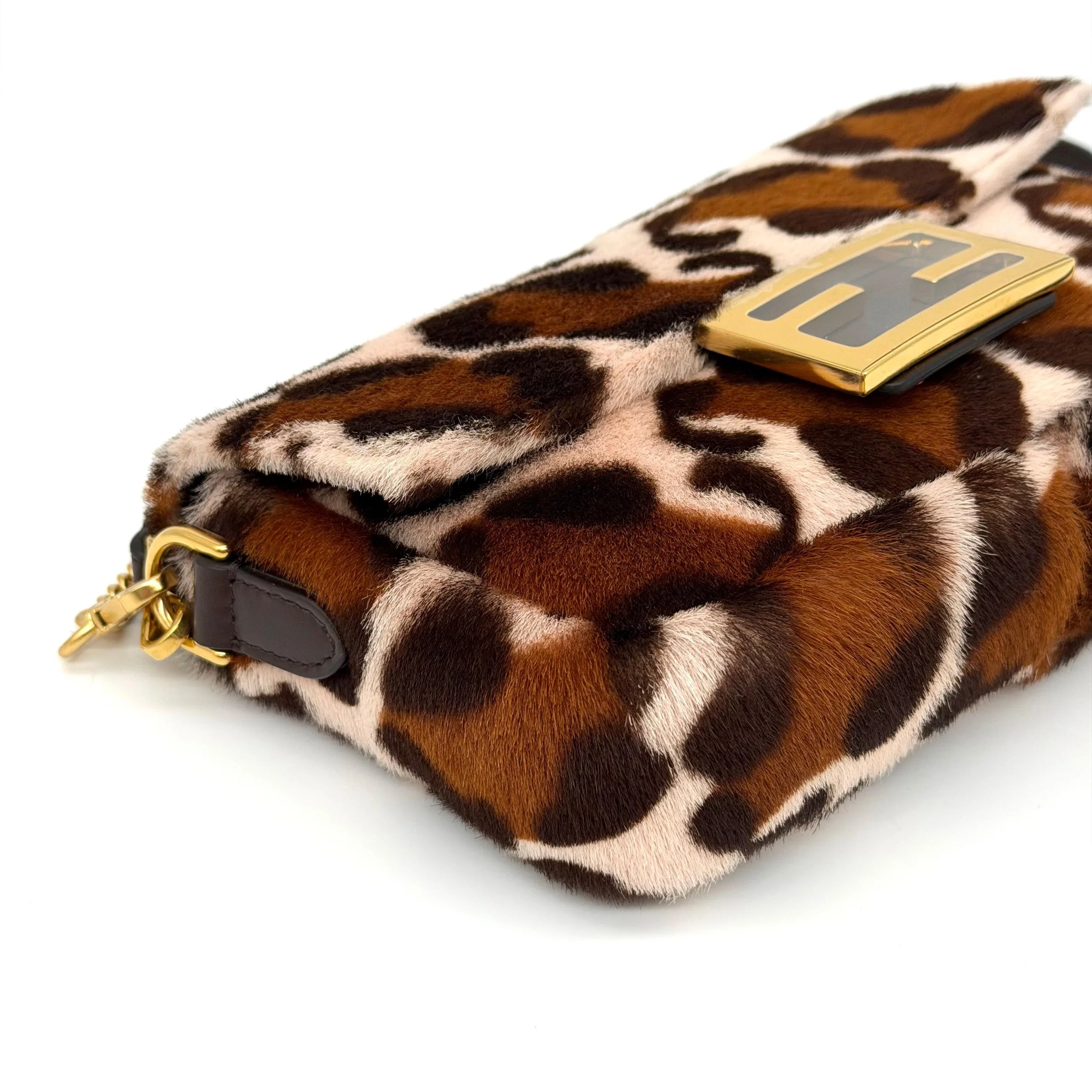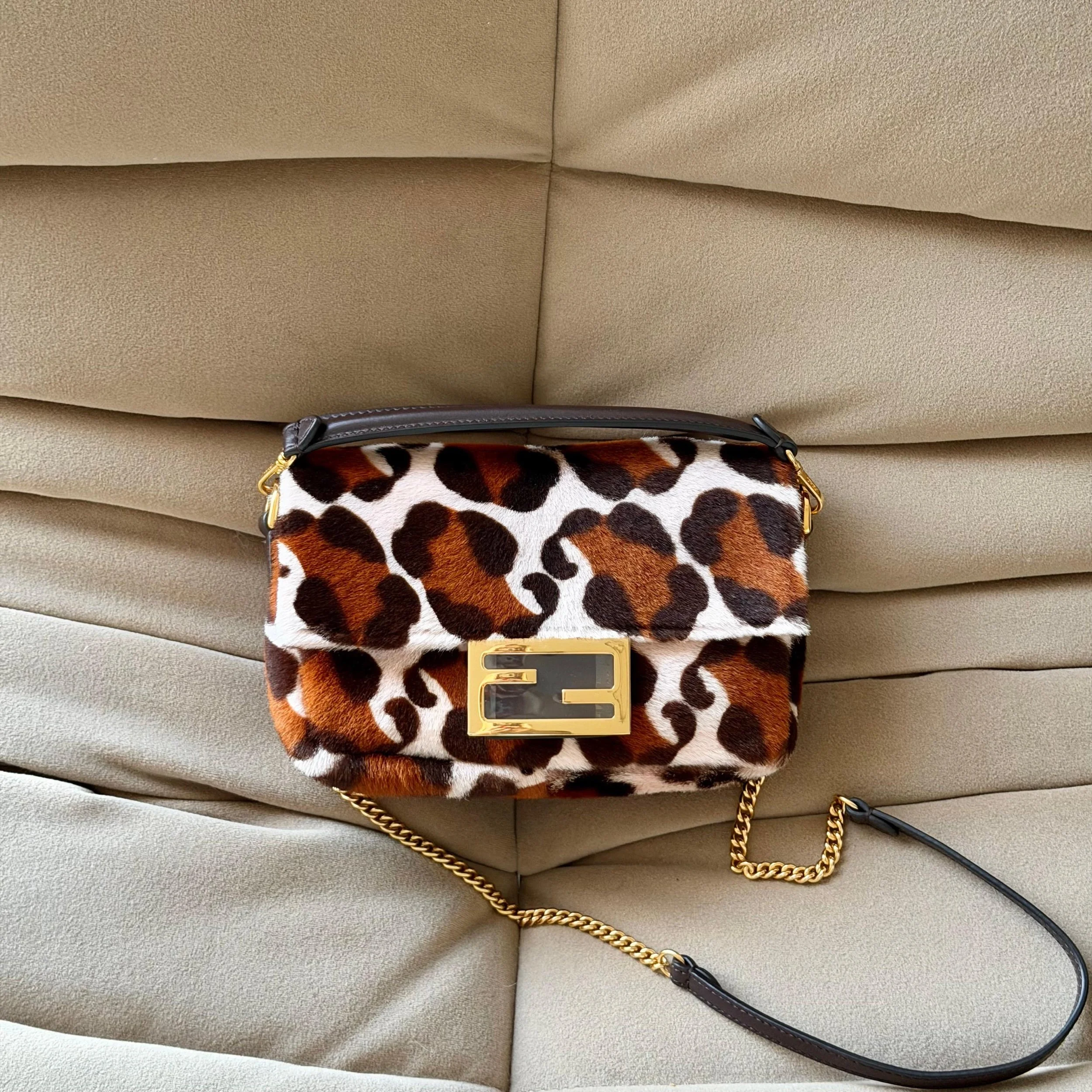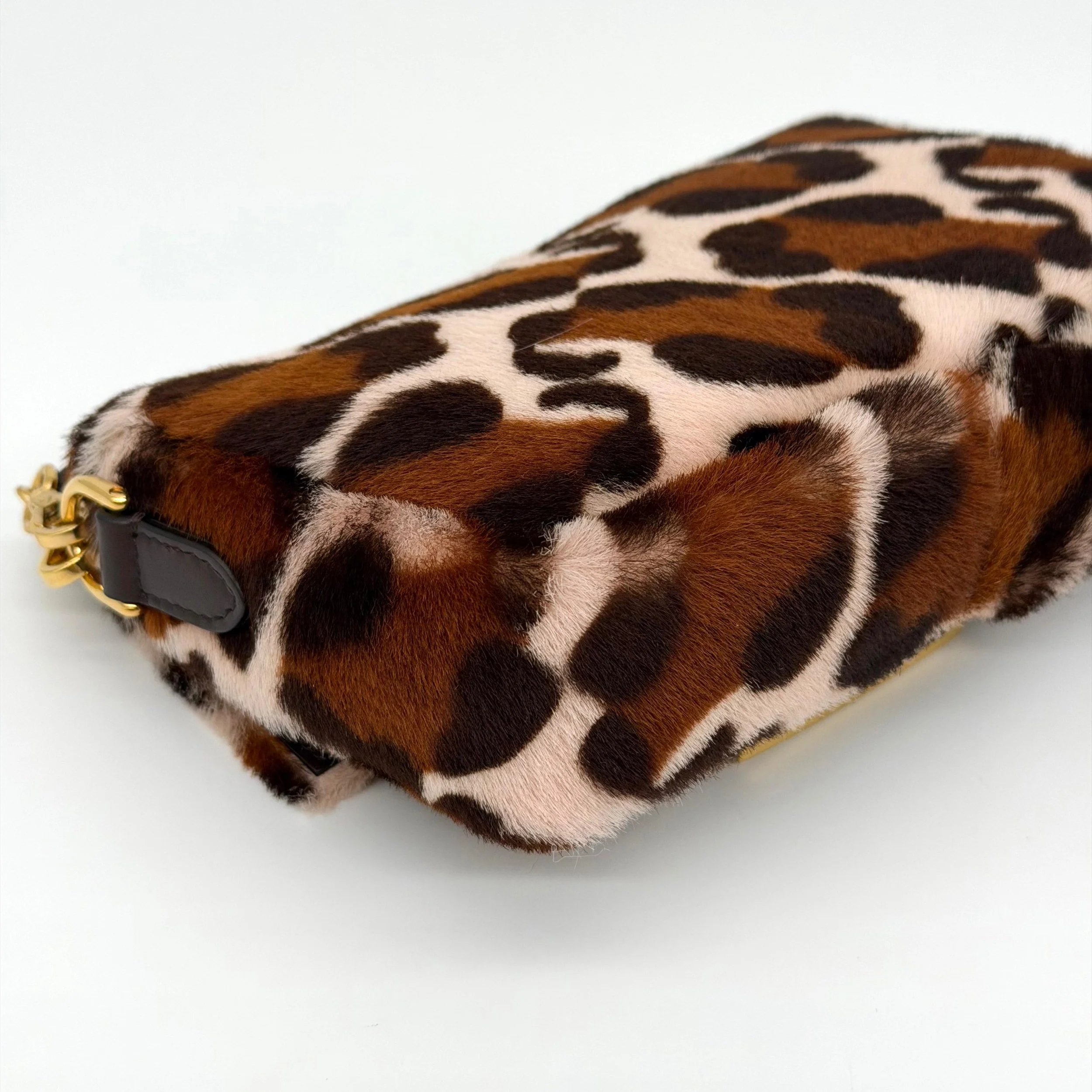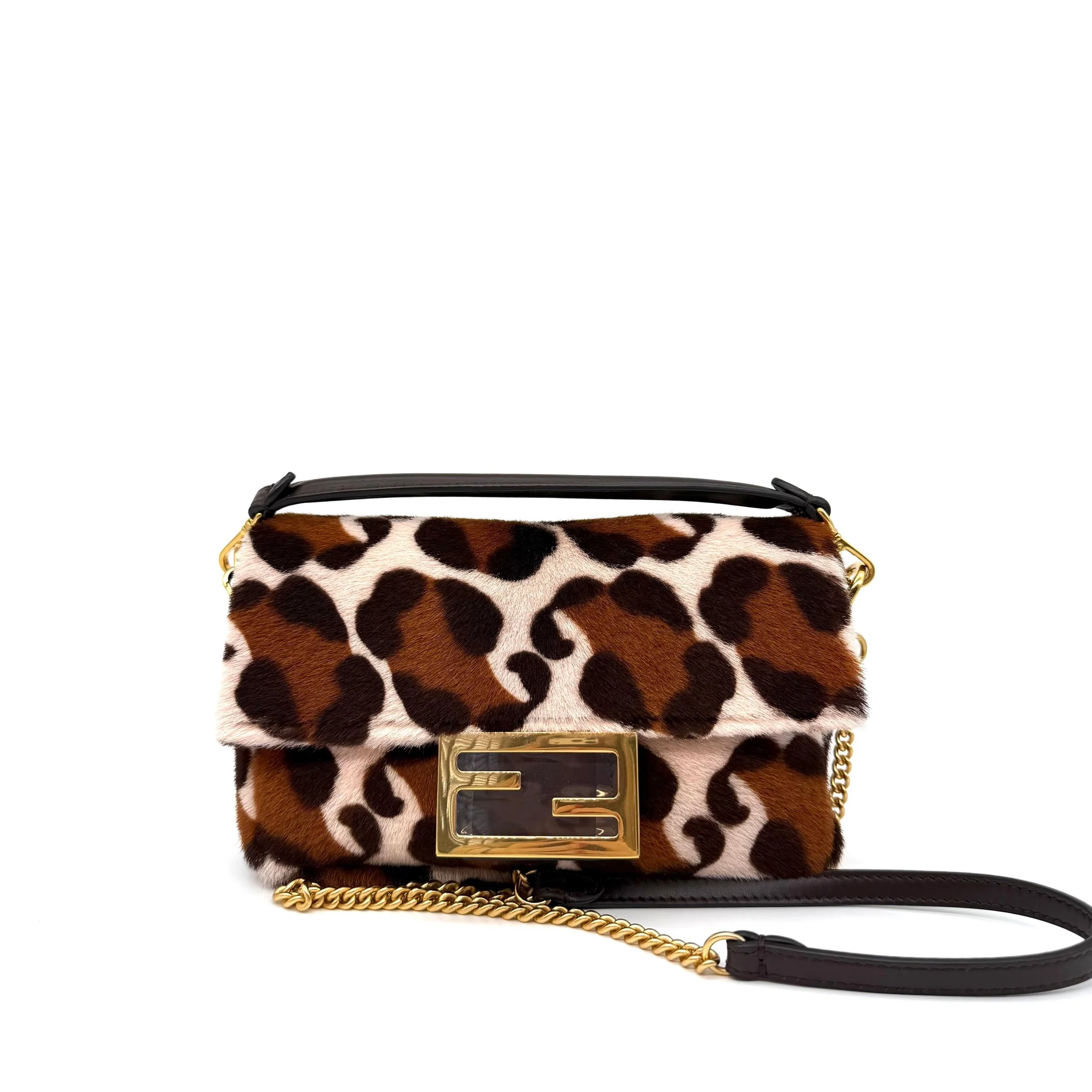 Item Description/Model: Fendi Mini Baguette Chain Bag in Brown Leopard Print Pony Hair with Gold Hardware