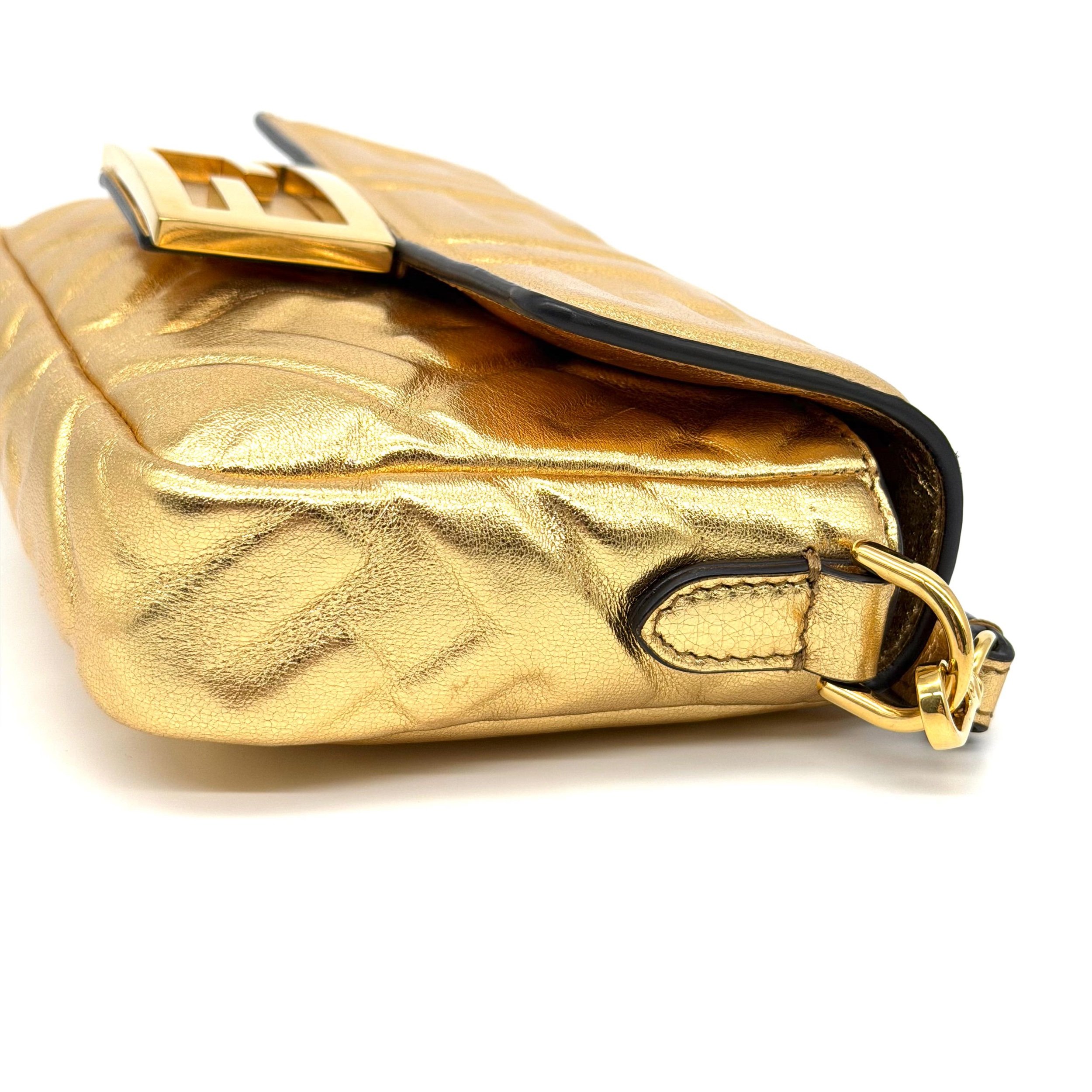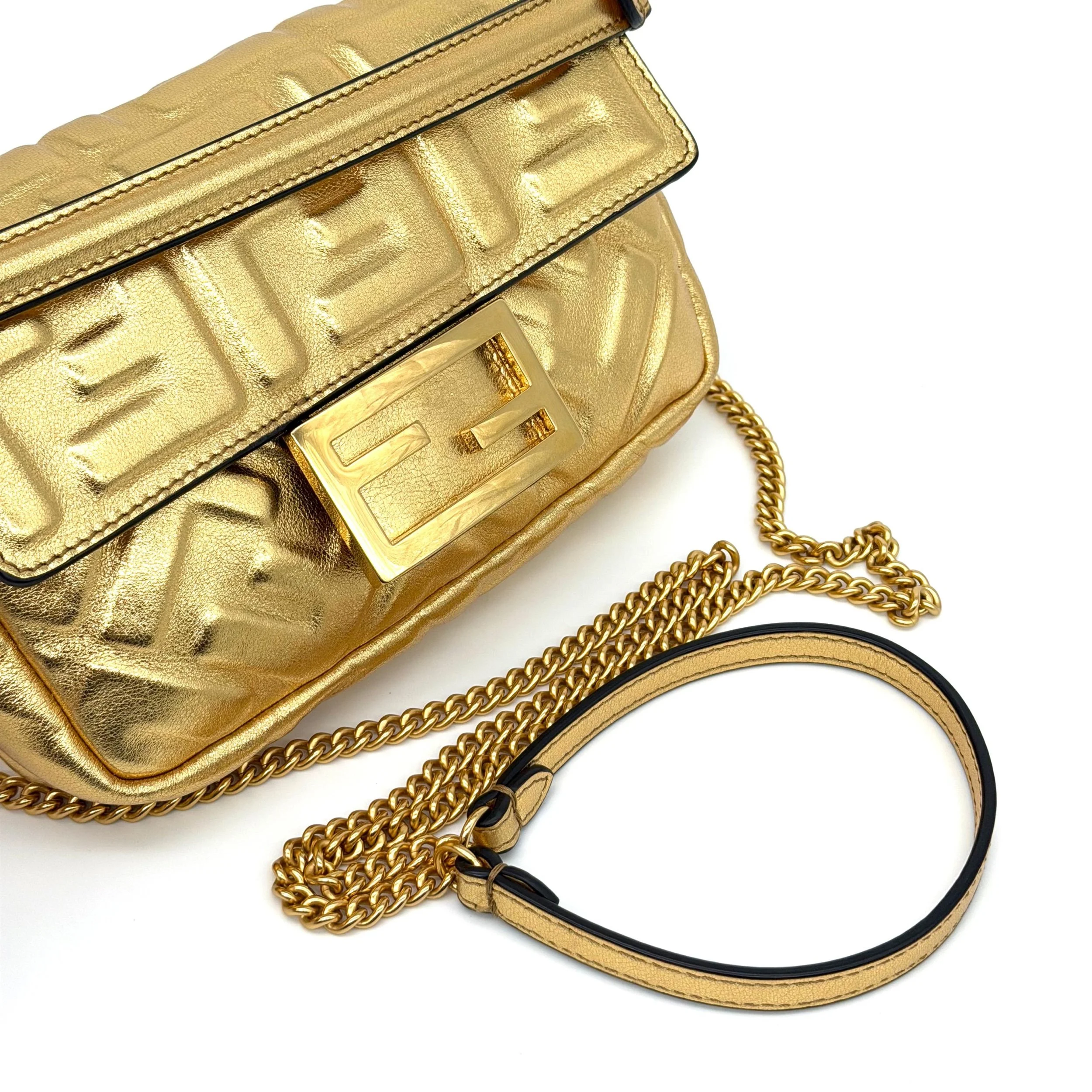 Item Description/Model: Fendi Mini Baguette Chain Bag in Gold FF Embossed Leather Gold Hardware