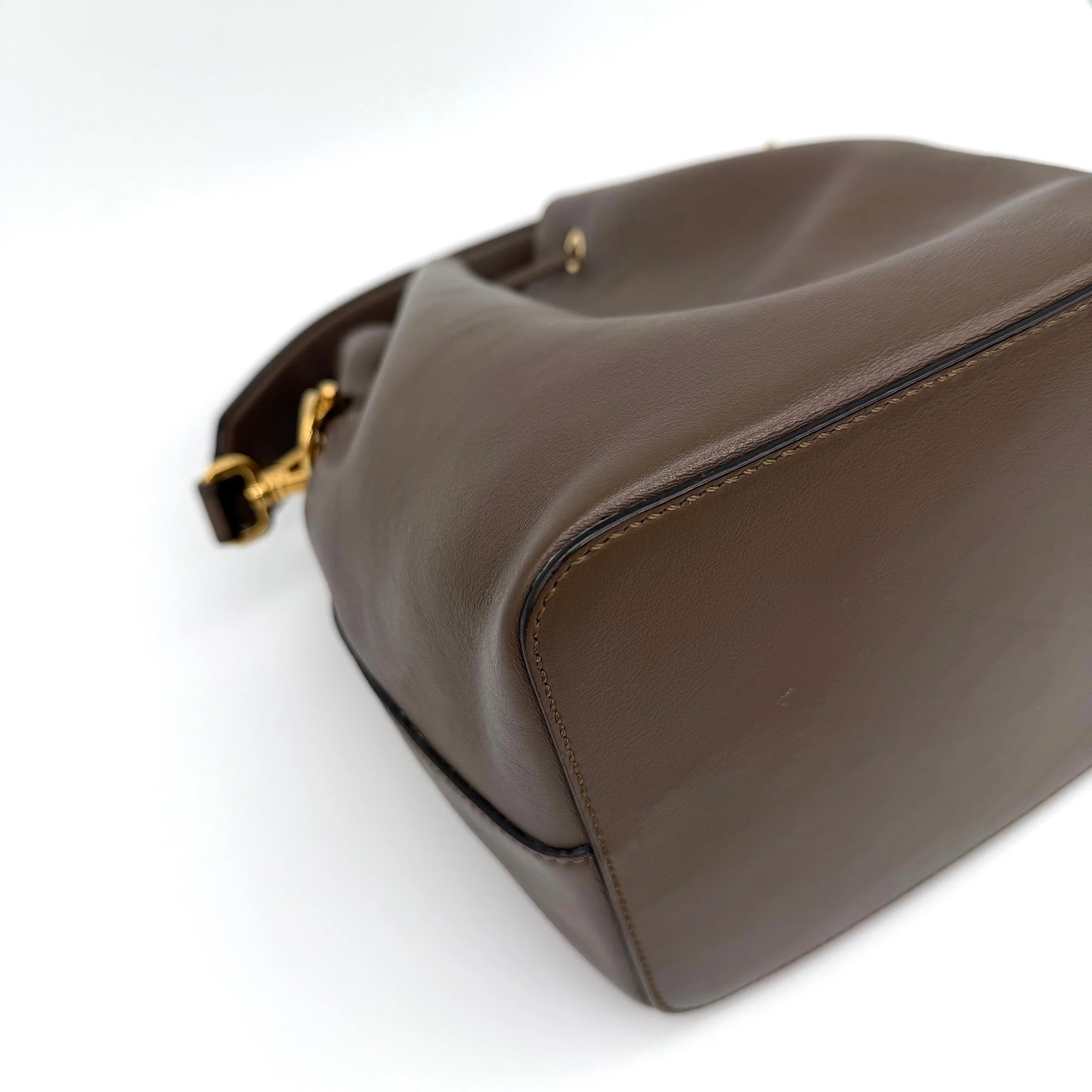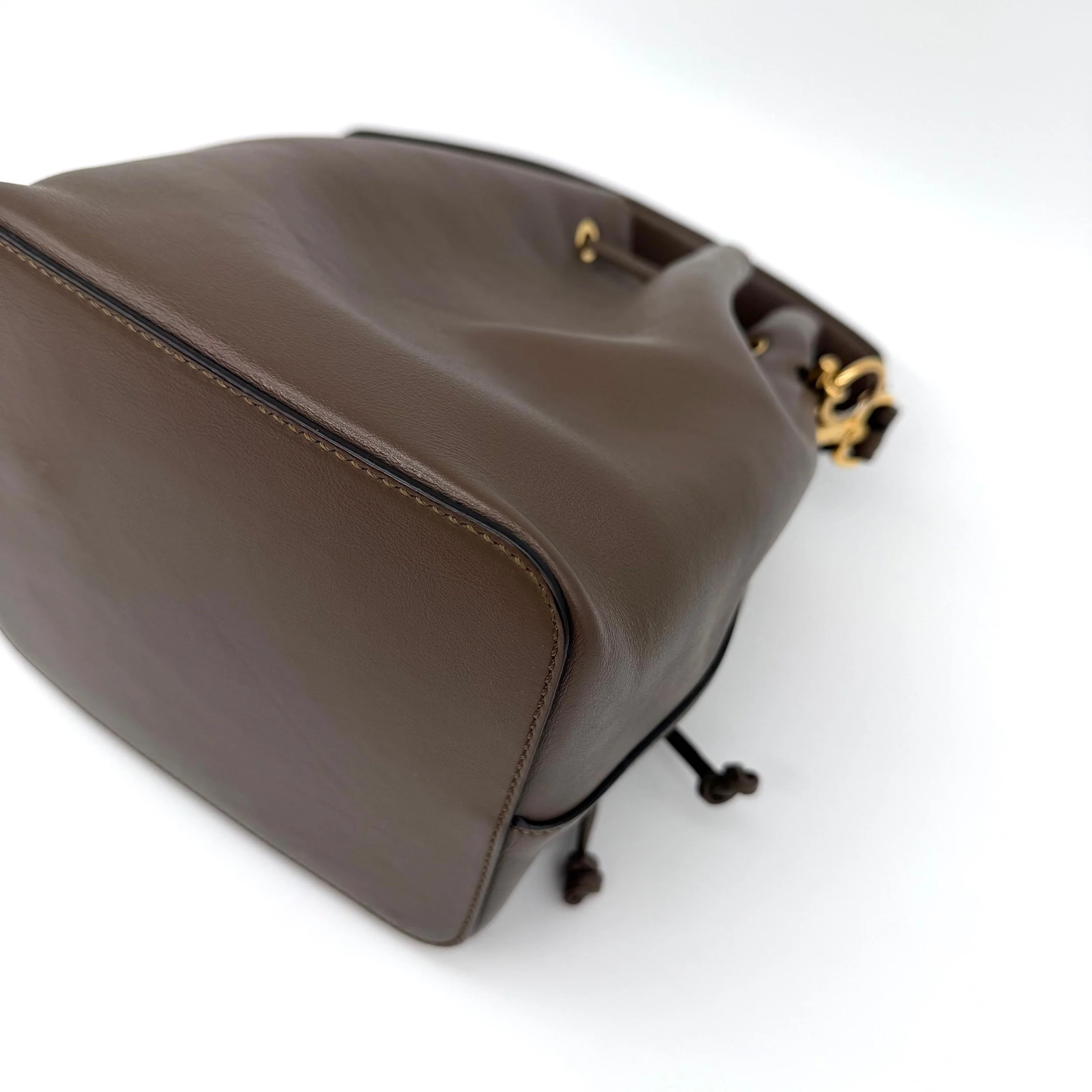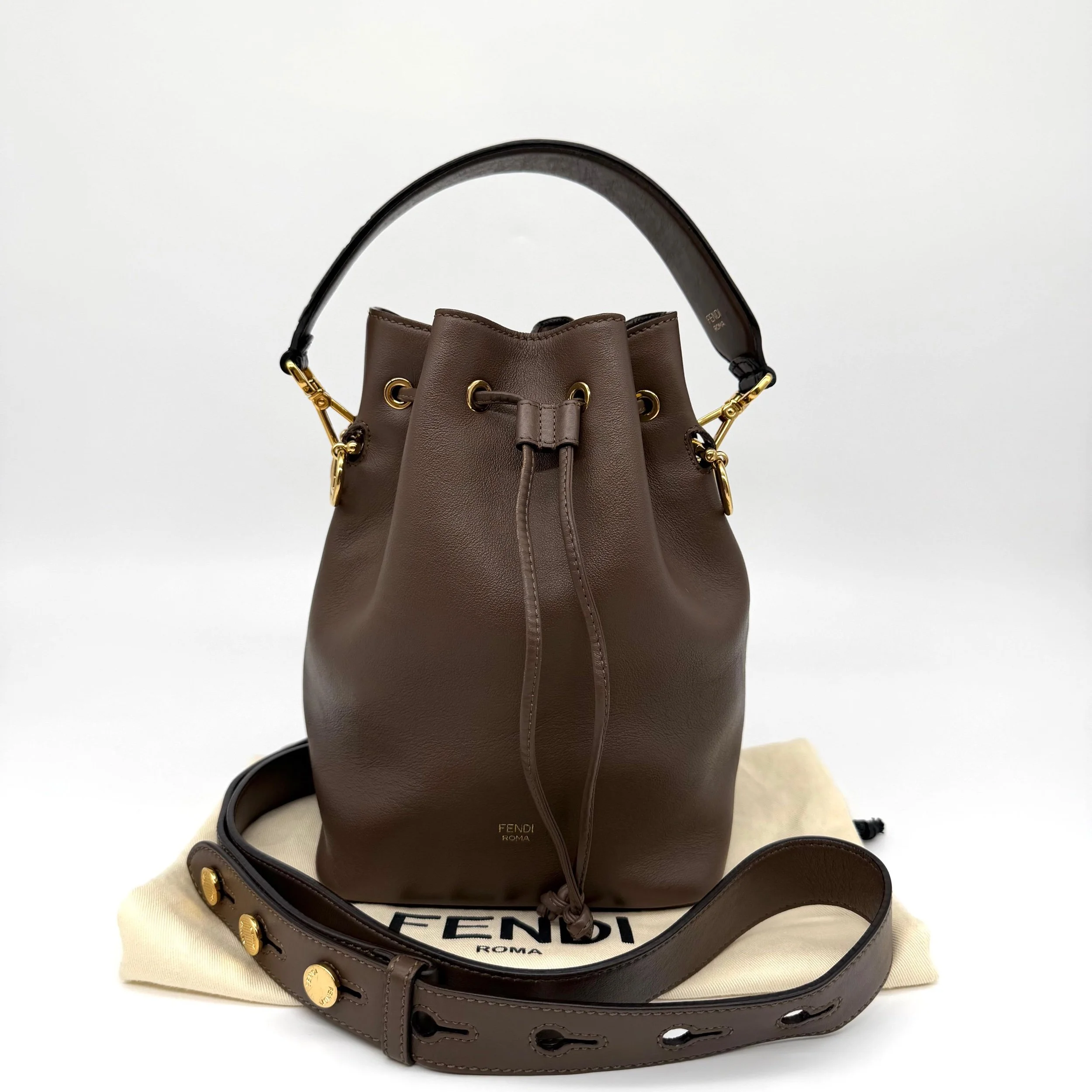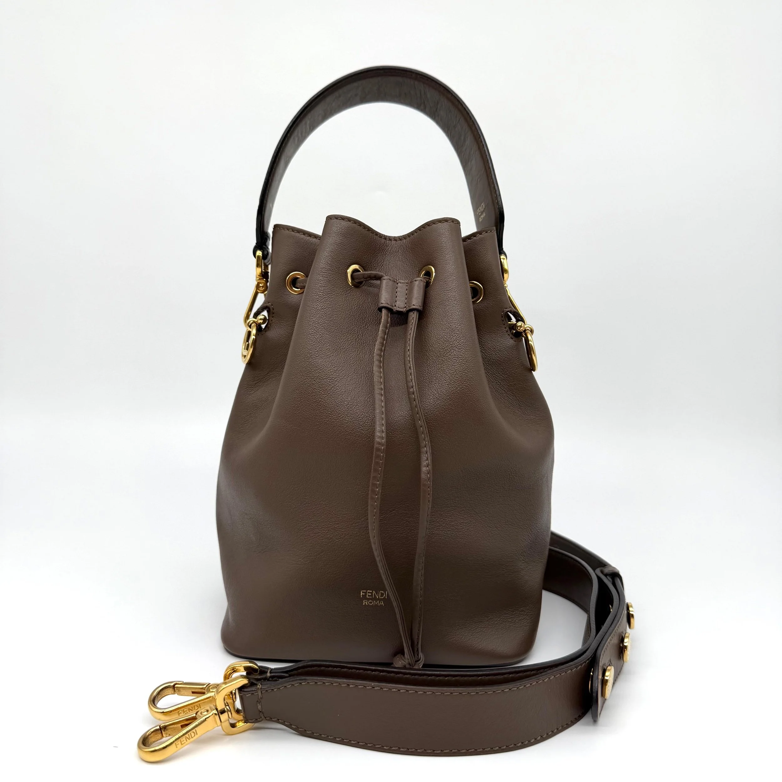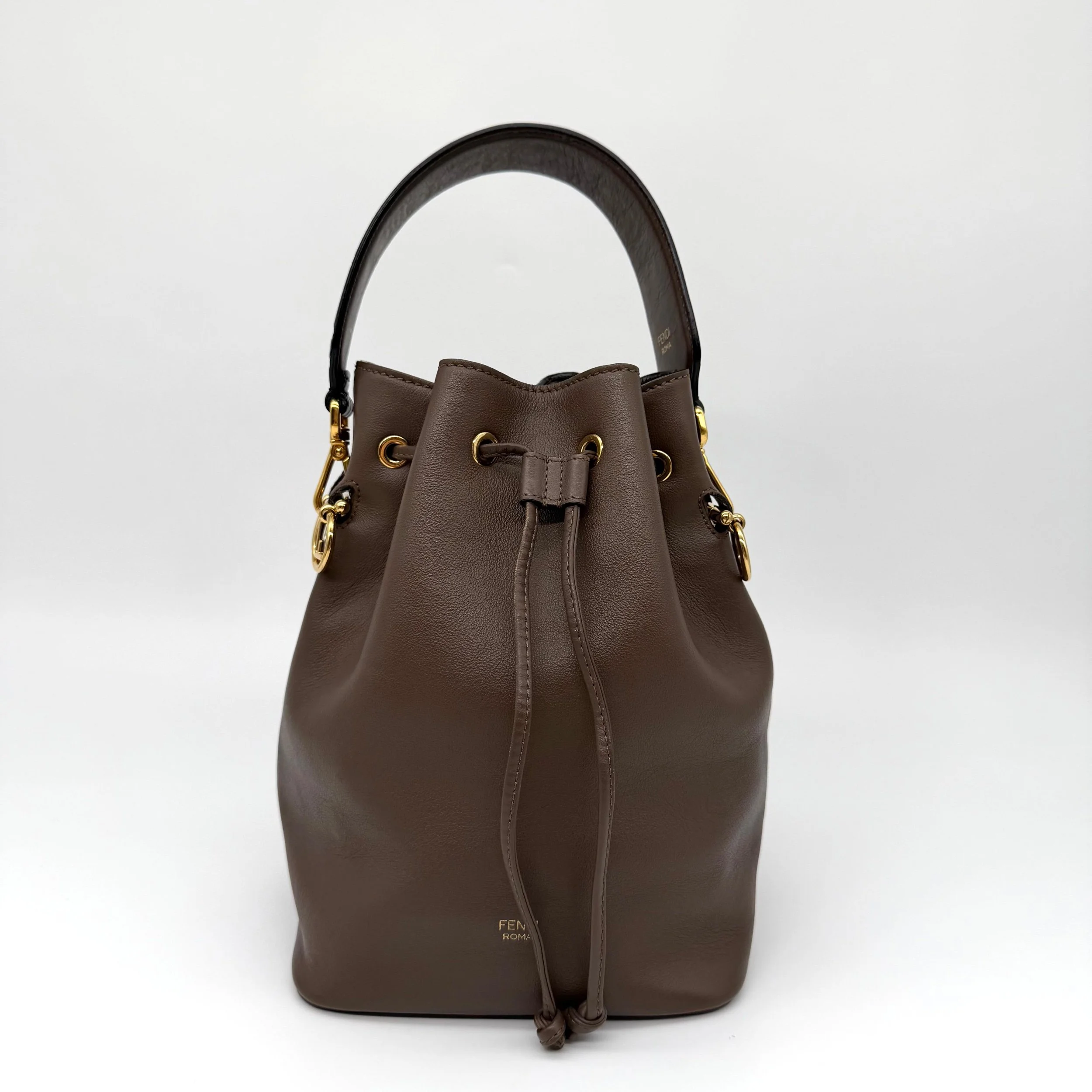 Item Description/Model: Fendi Mon Tresor Bucket Bag in Brown / Taupe Smooth Leather with FF Monogram Top handle with Gold Hardware