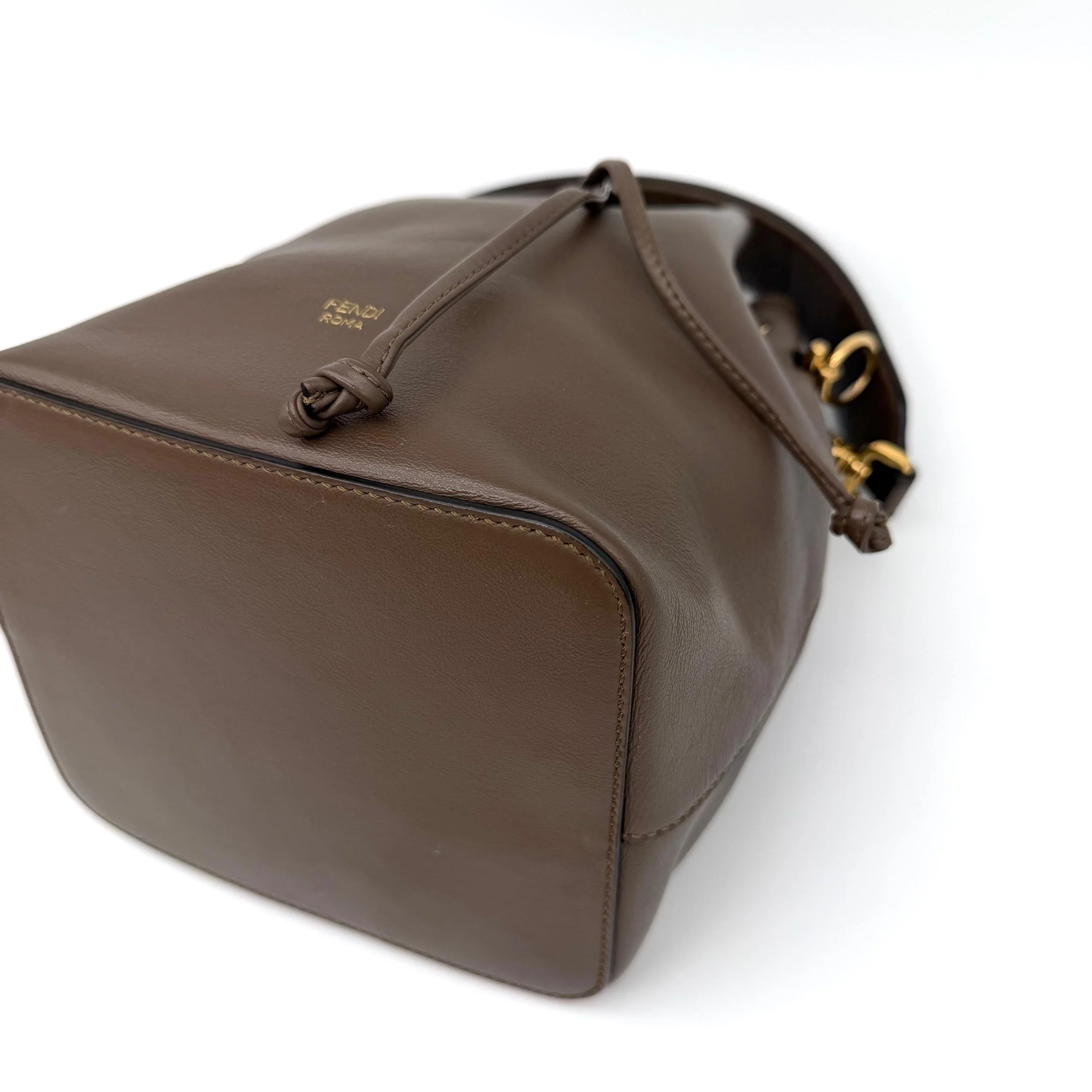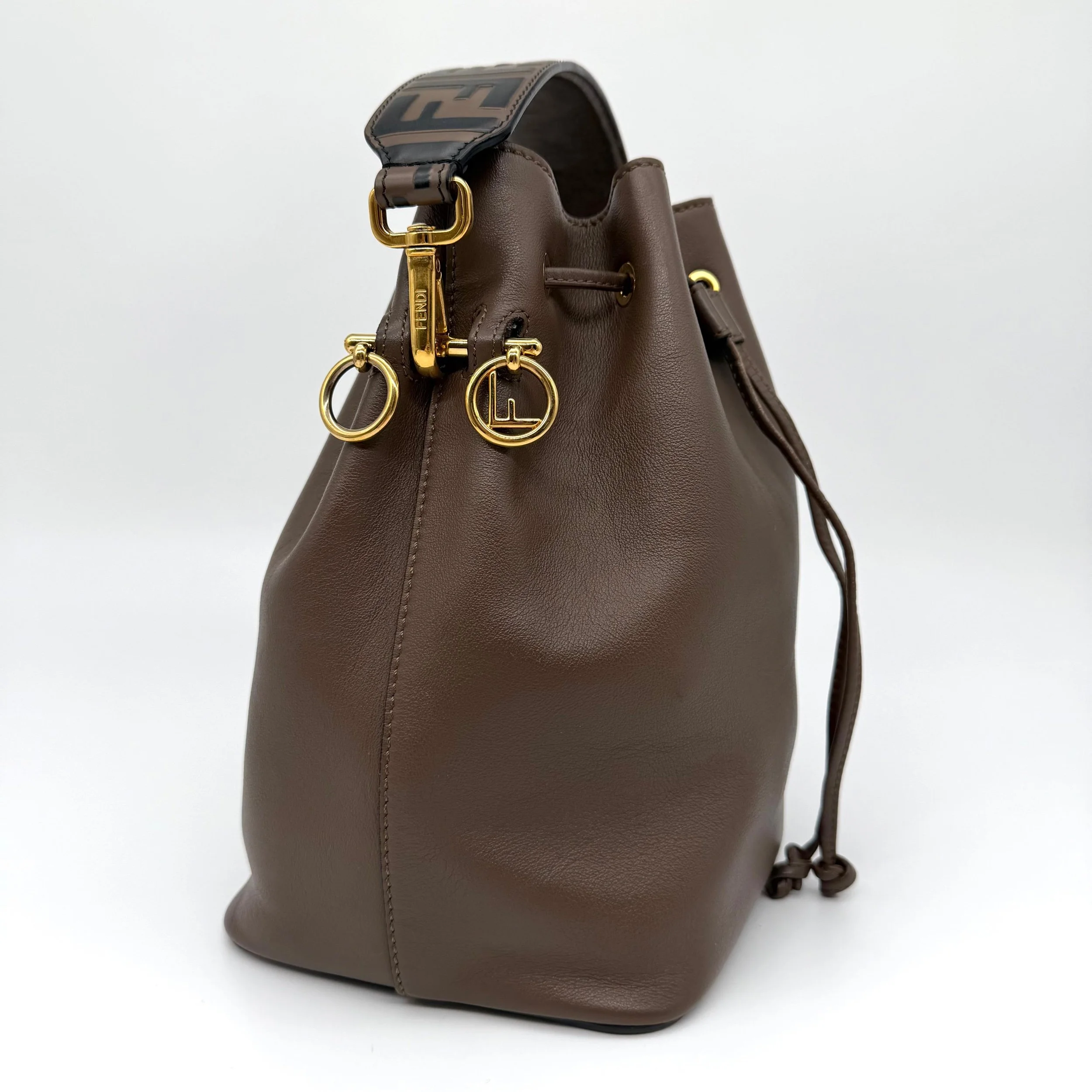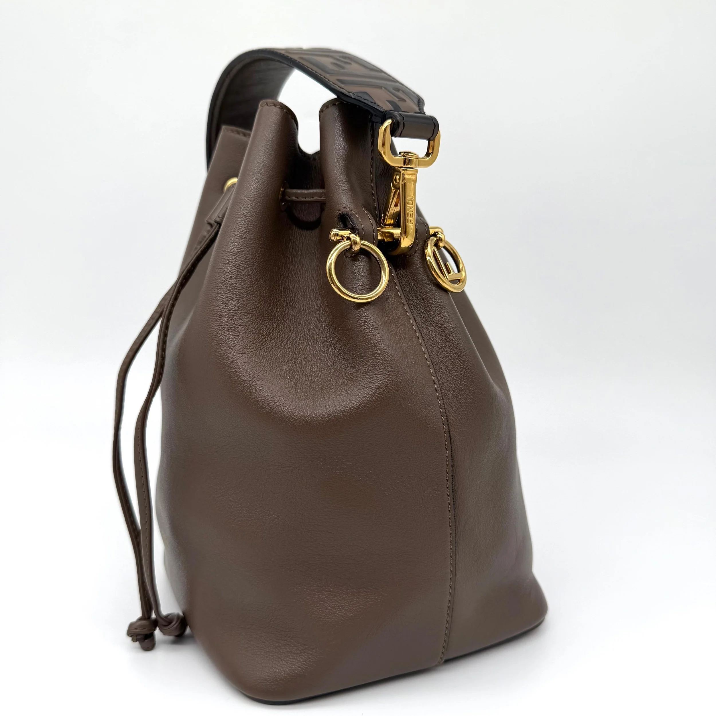 Fendi Mon Tresor Bucket Bag Brown Leather FF Monogram Top Handle Gold Hardware