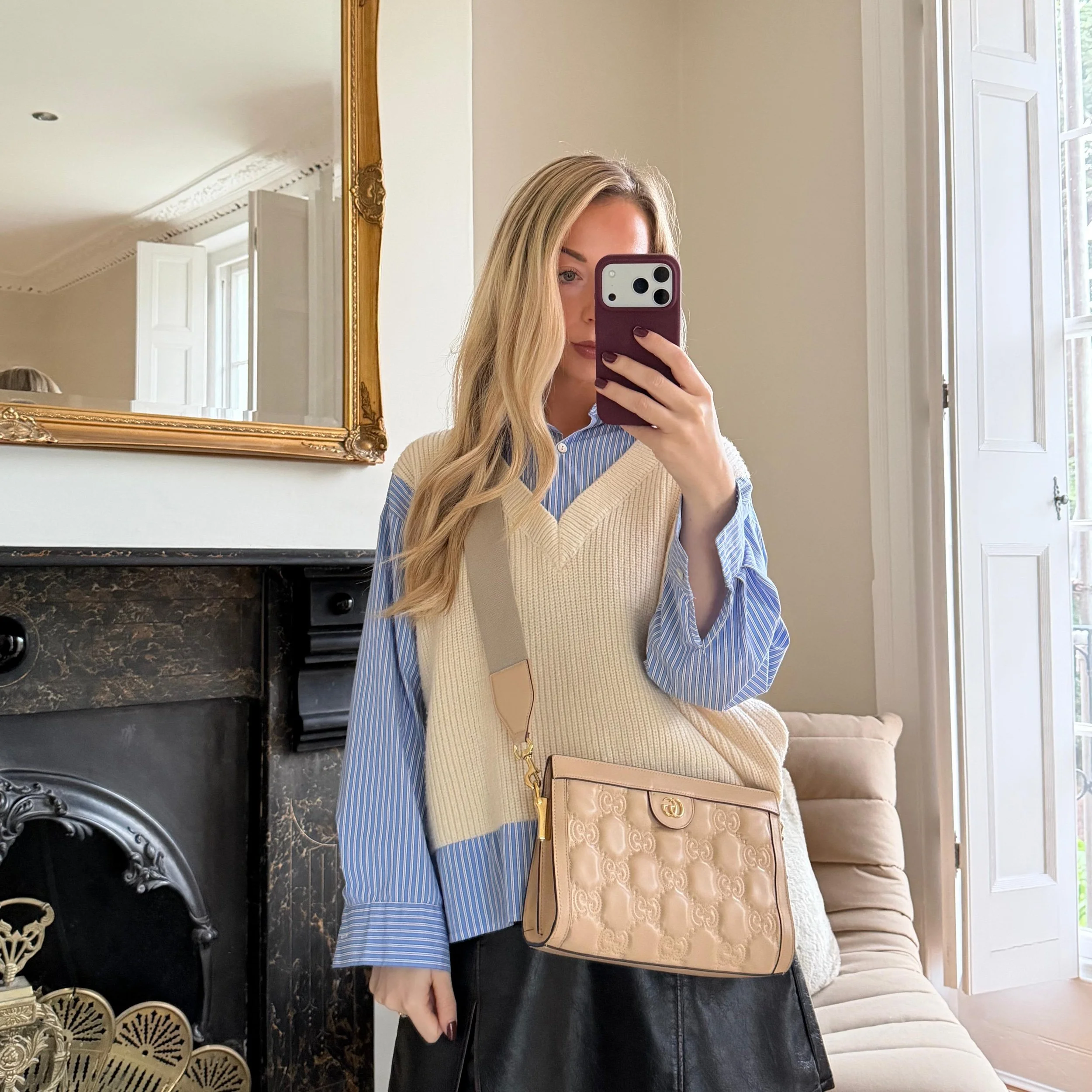 Gucci GG Matelasse Small Monogram Shoulder Bag in Beige Embossed Leather