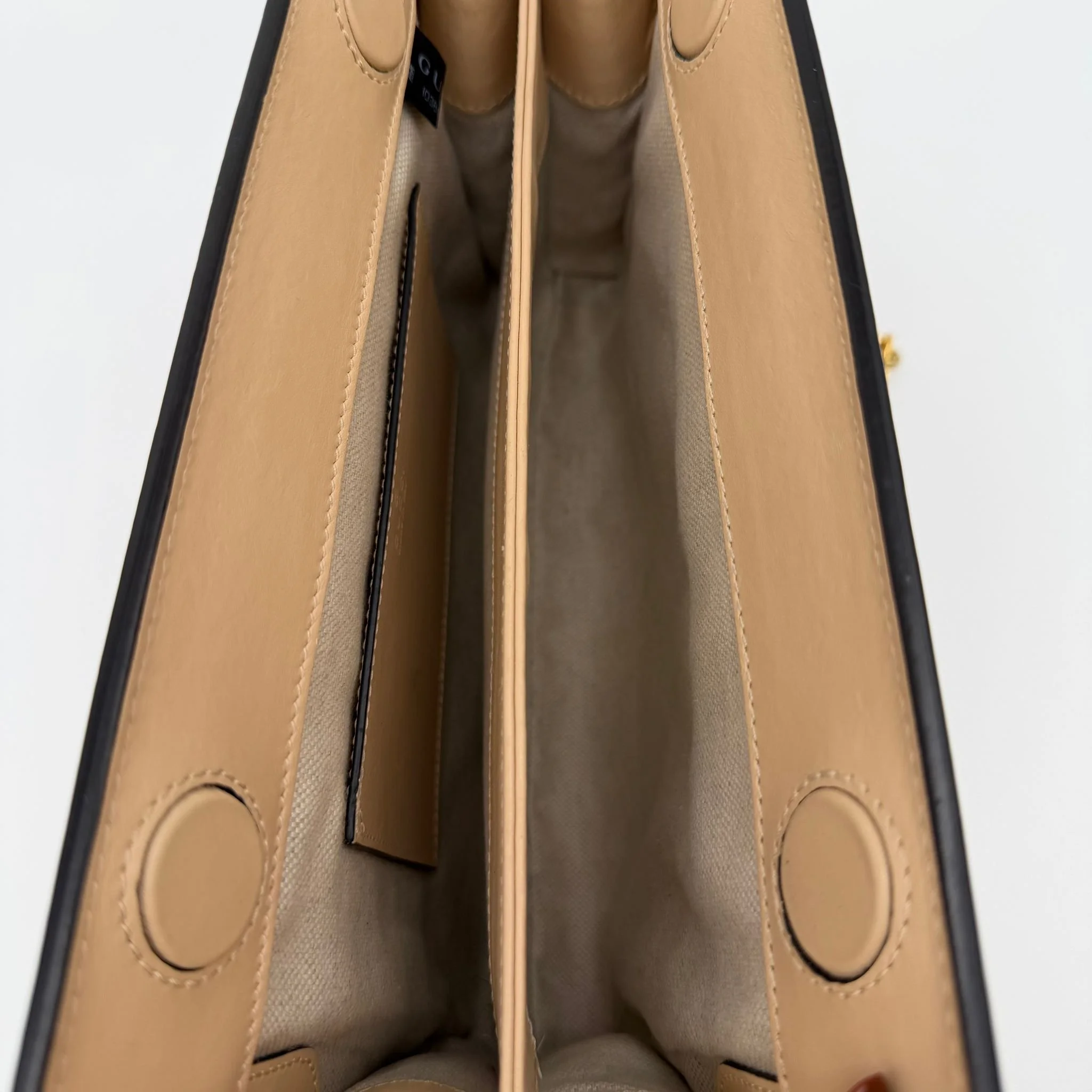 Condition: Very good used condition, light scratches to hardware. Light mark/wear to corners. One light mark to inner fabric strap.