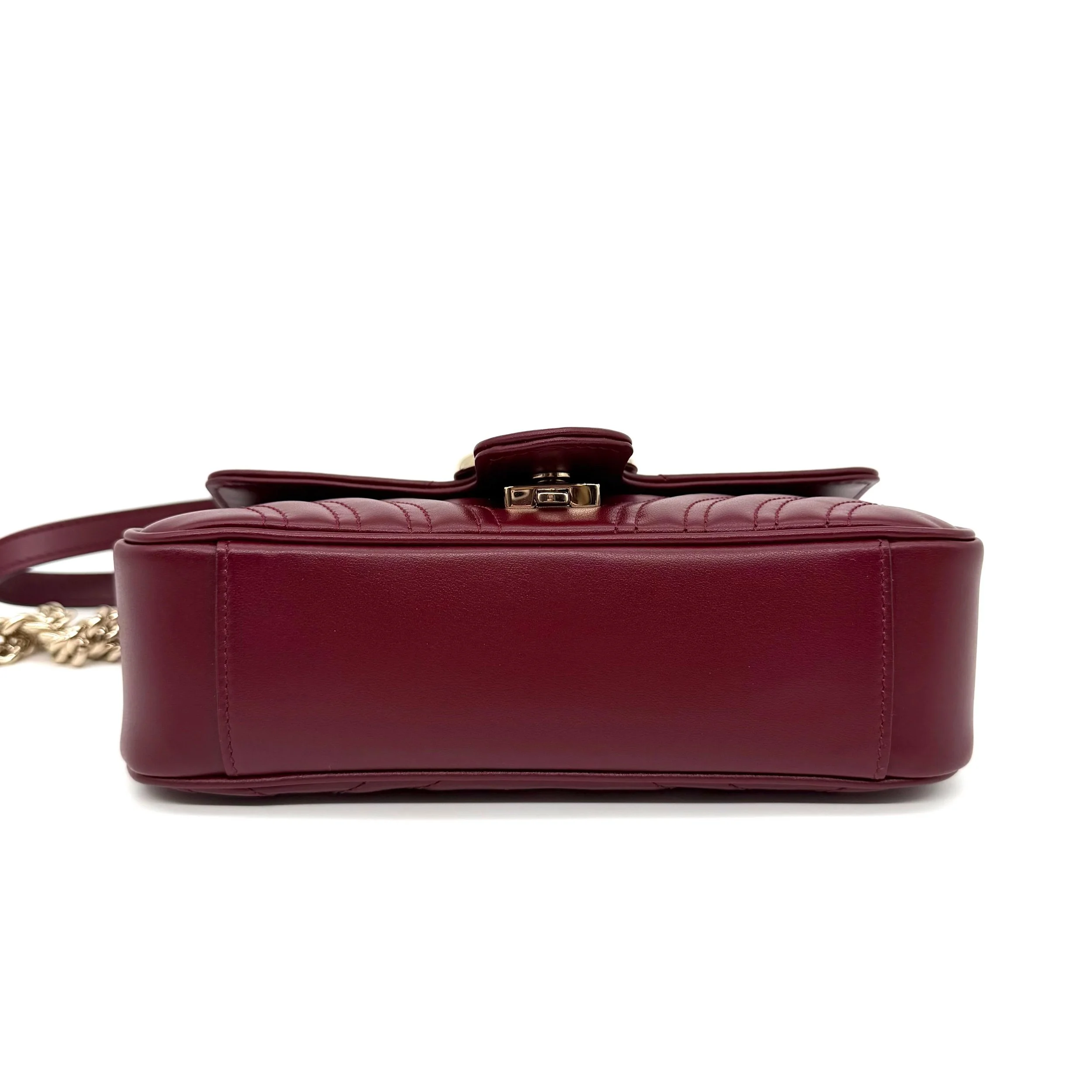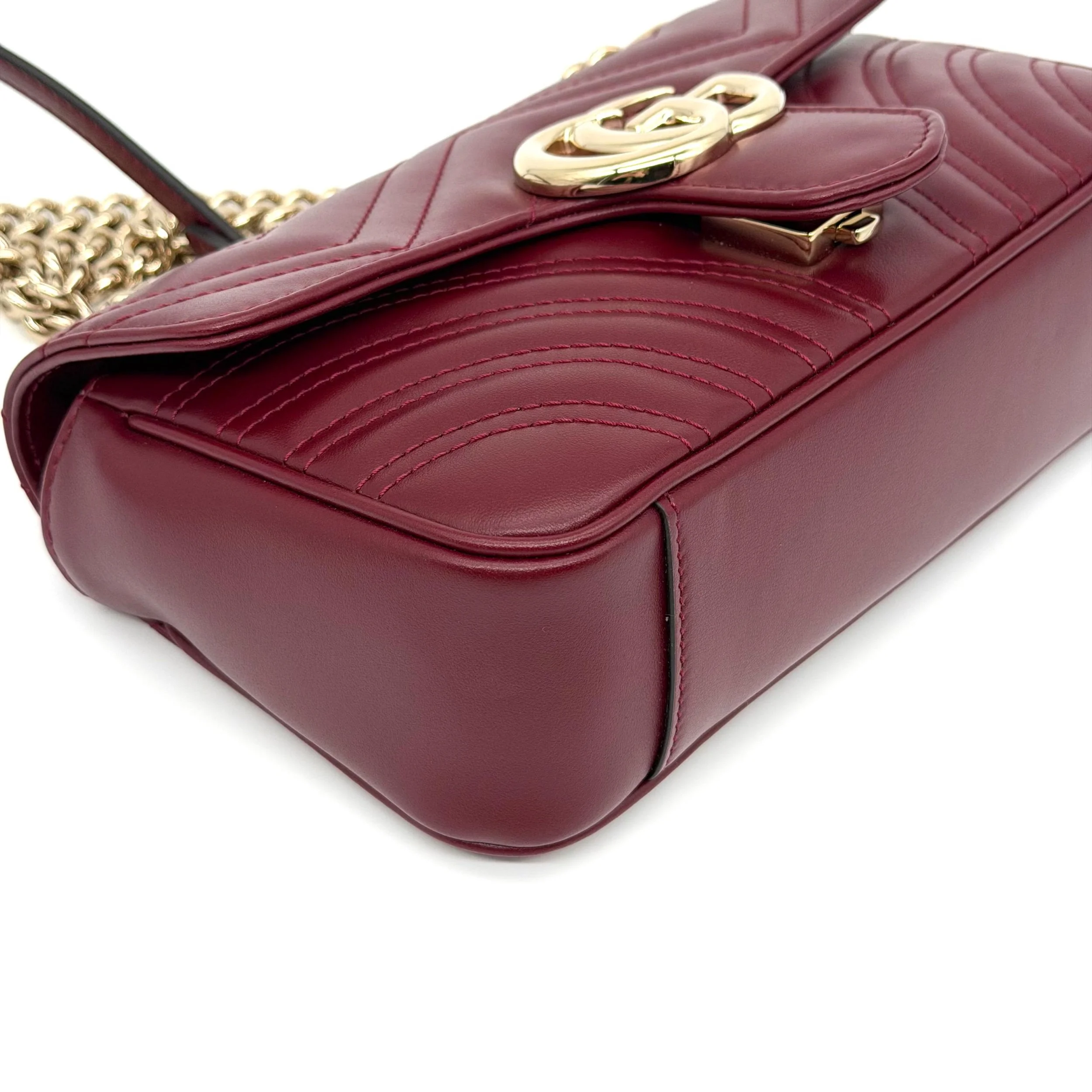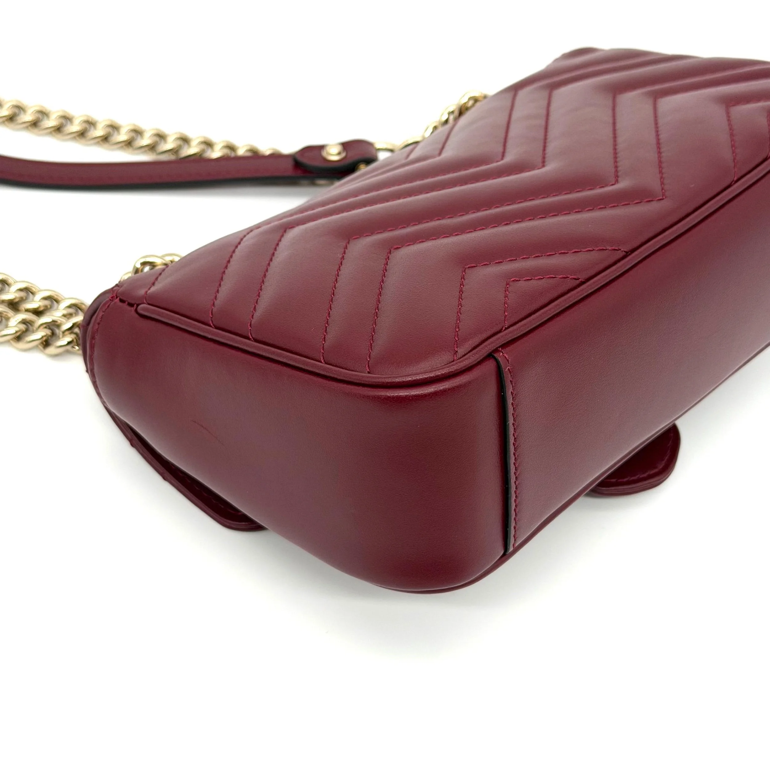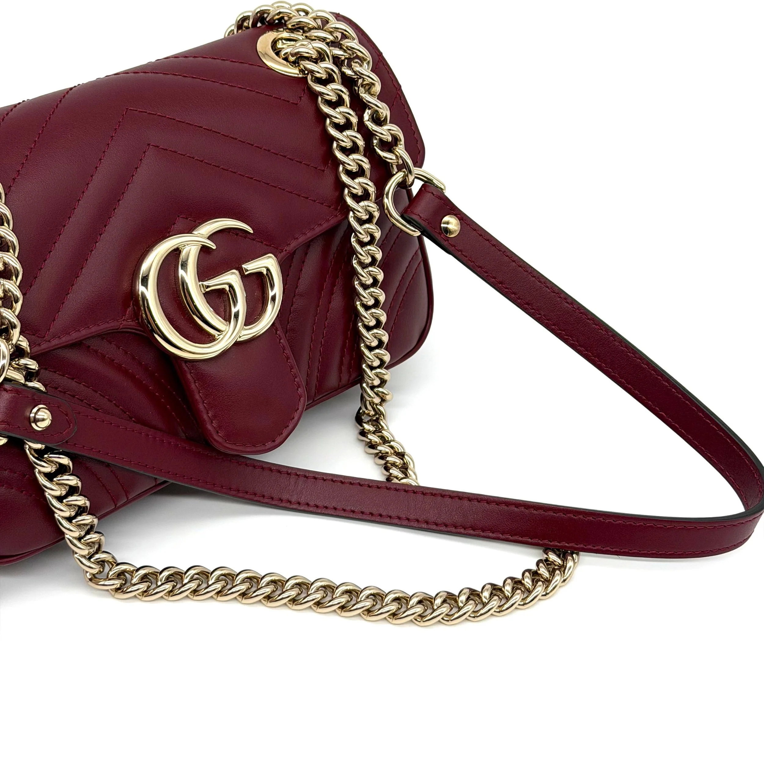 Item Description/Model: Gucci GG Small Marmont Flap Bag in Rosso Ancora Red Leather Champagne Gold Hardware