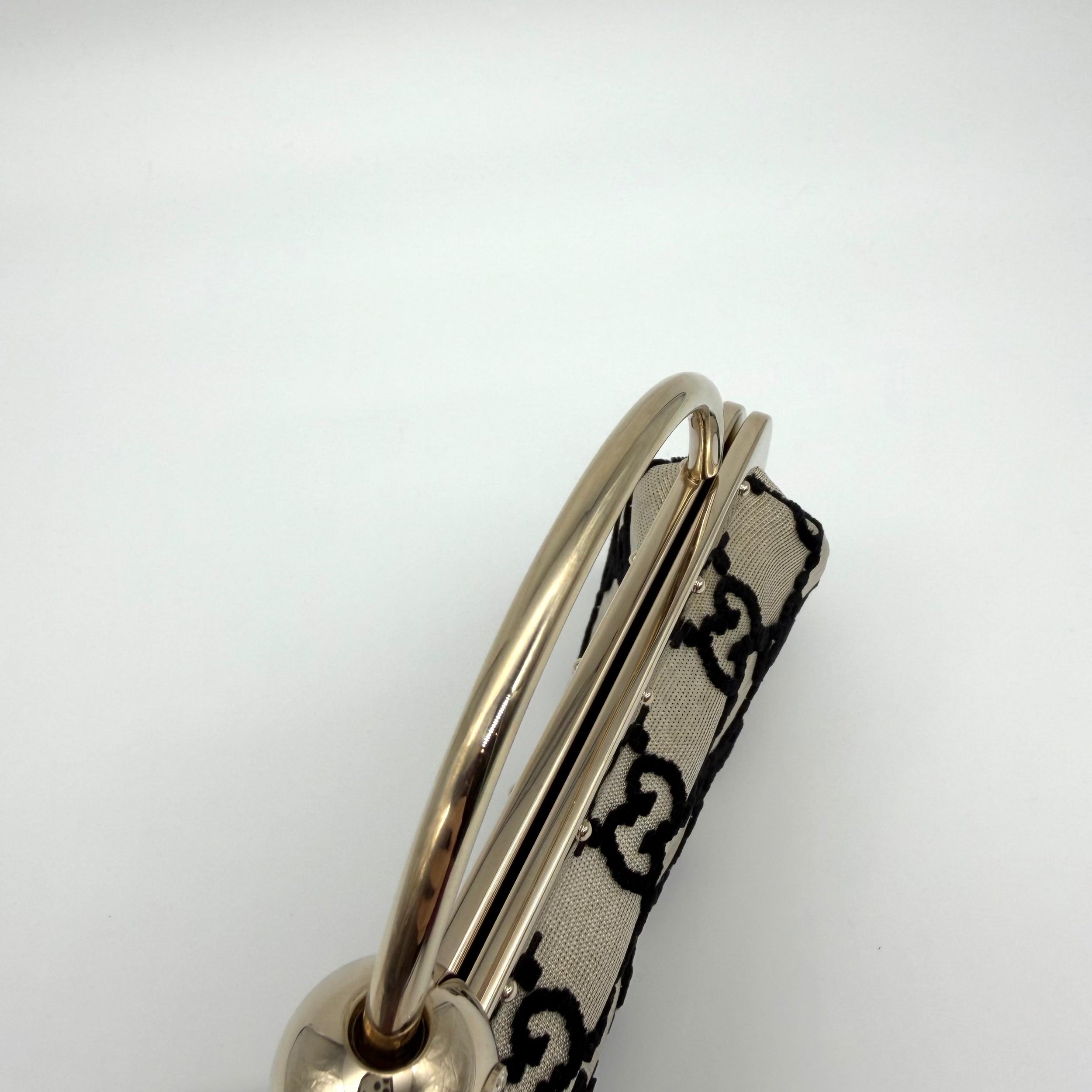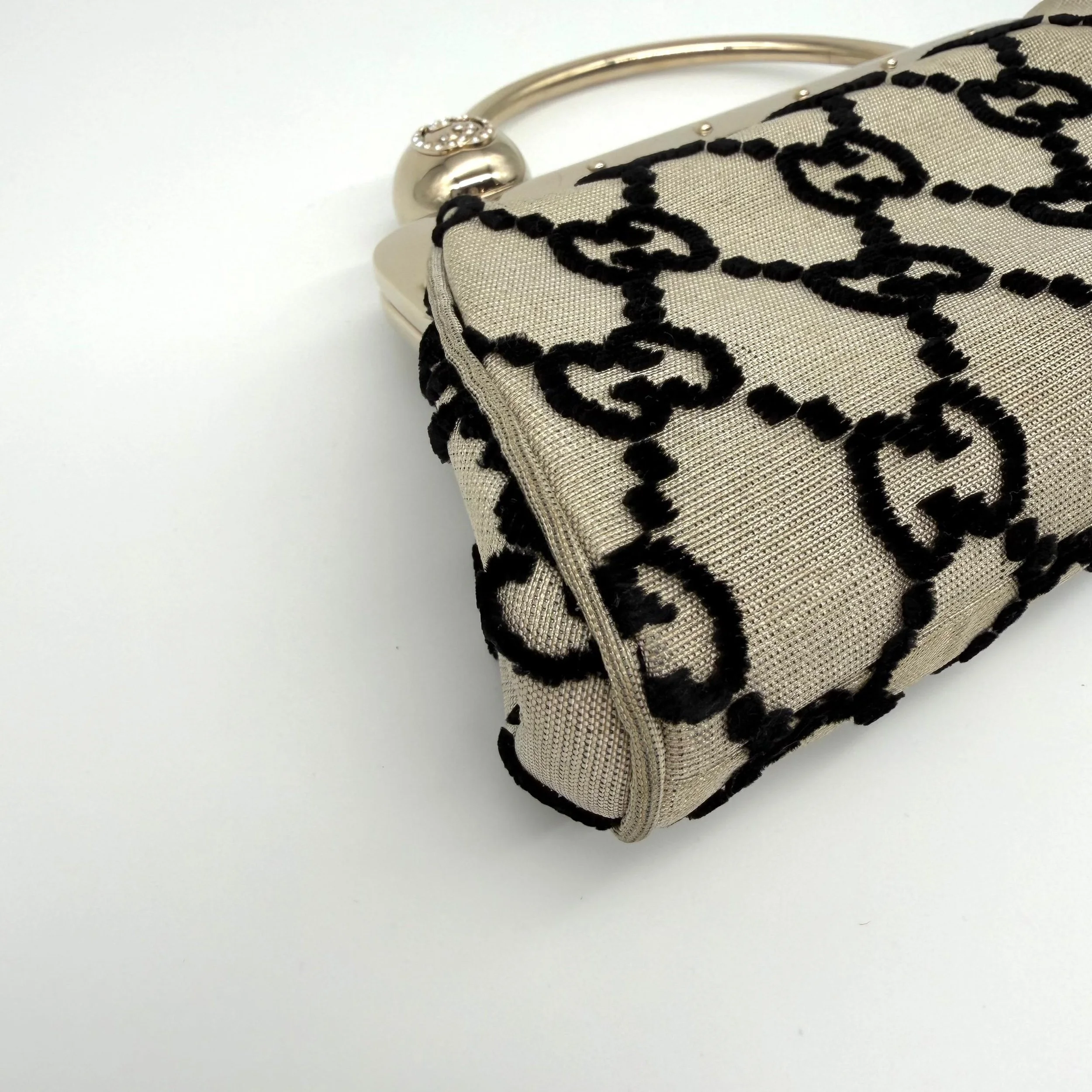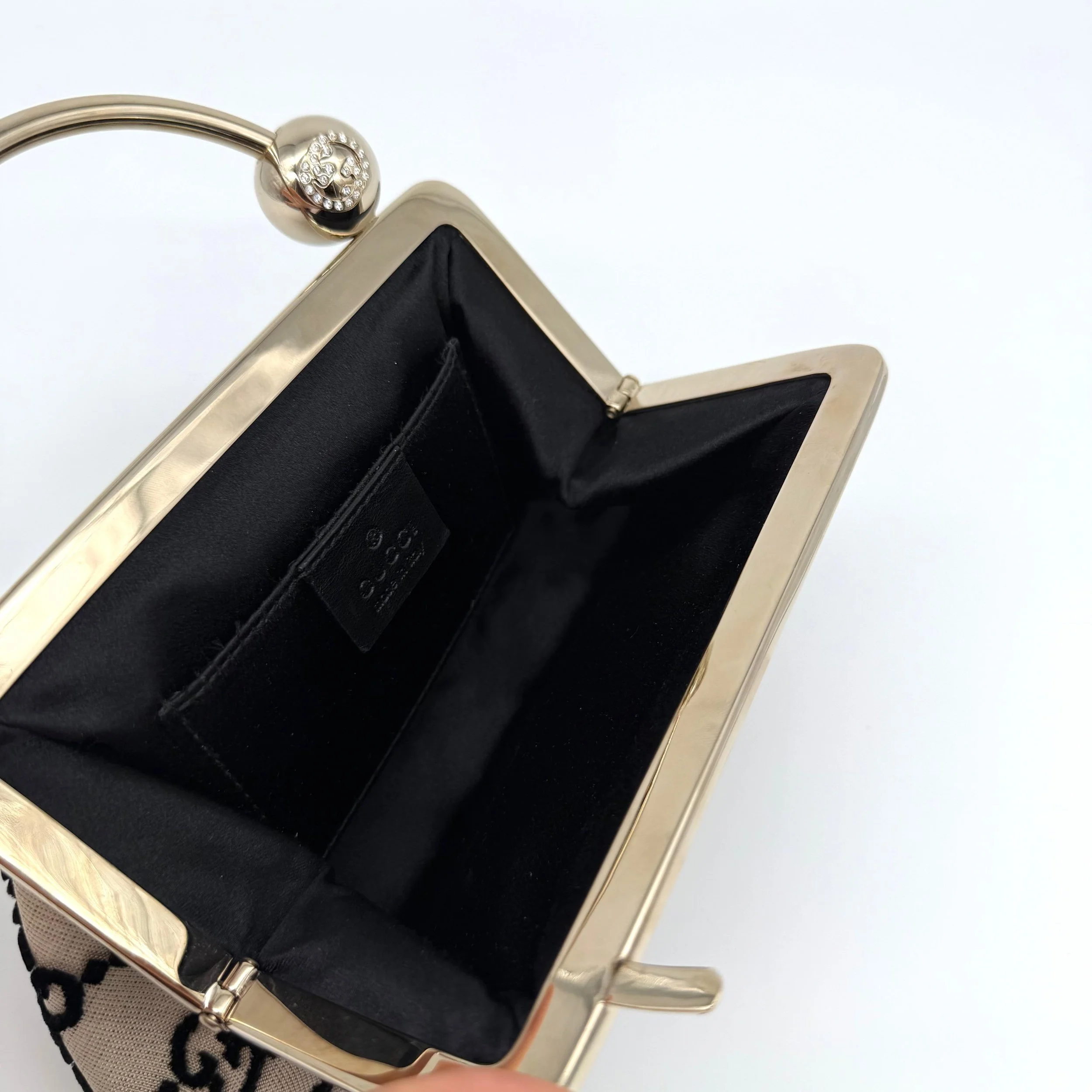 Item Description/Model: Gucci Mini GG Frame Top Handle Clutch Bag in Beige with Black Velvet GG Detailing and Jewelled Monogram.