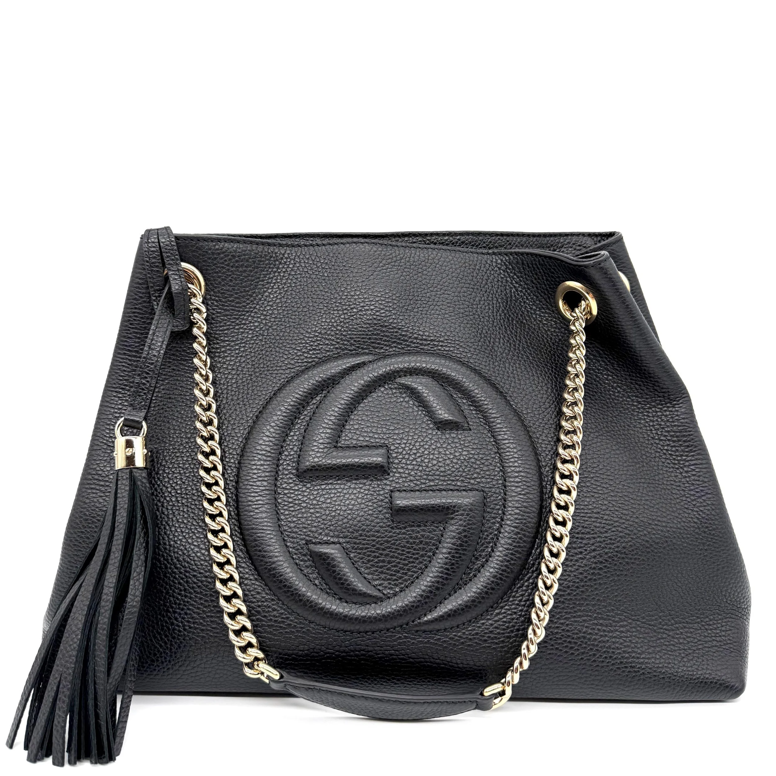 Item Description/Model: Gucci Soho Chain Tote Bag In Black Pebbled Leather Champagne Gold Hardware
