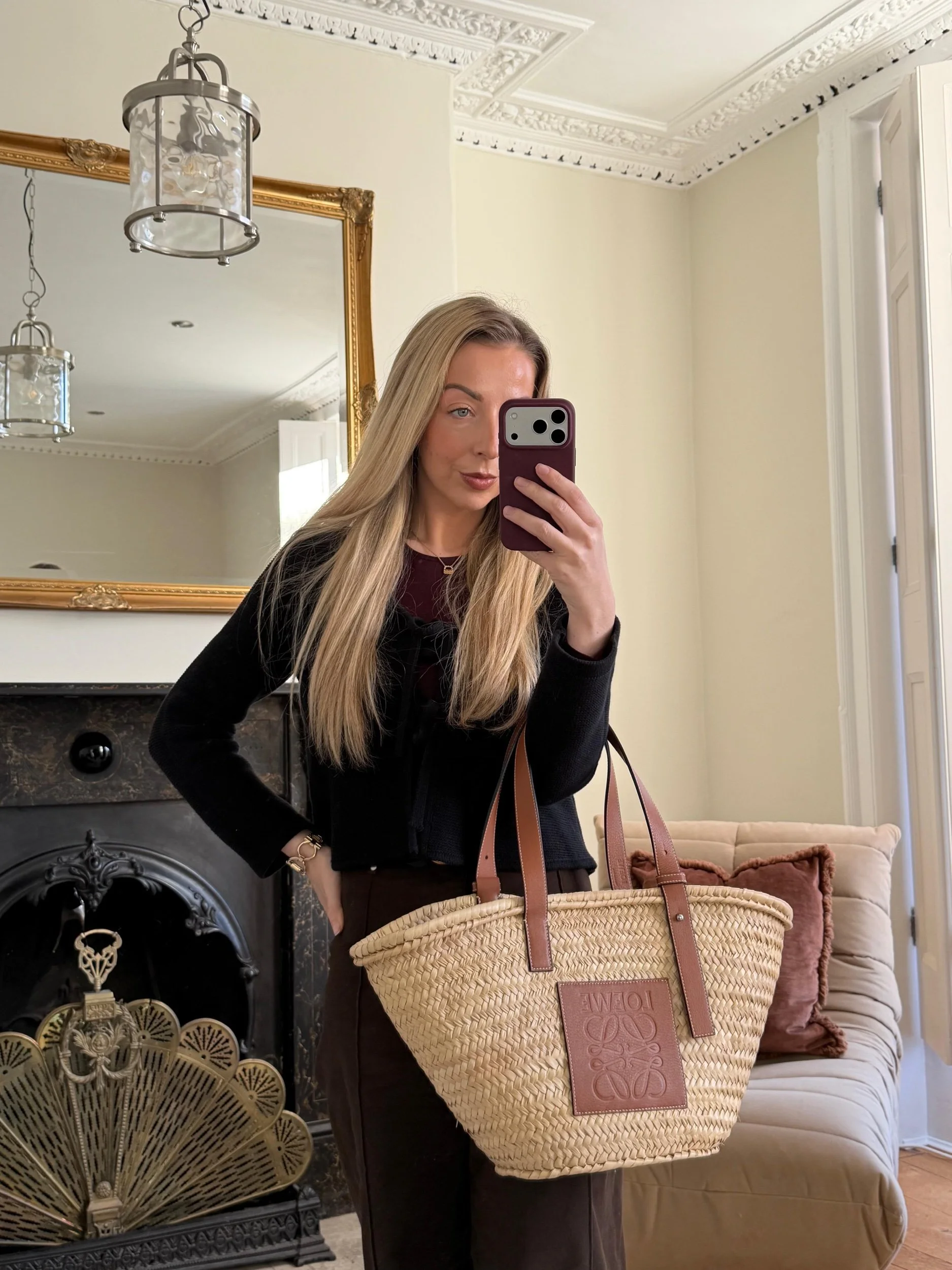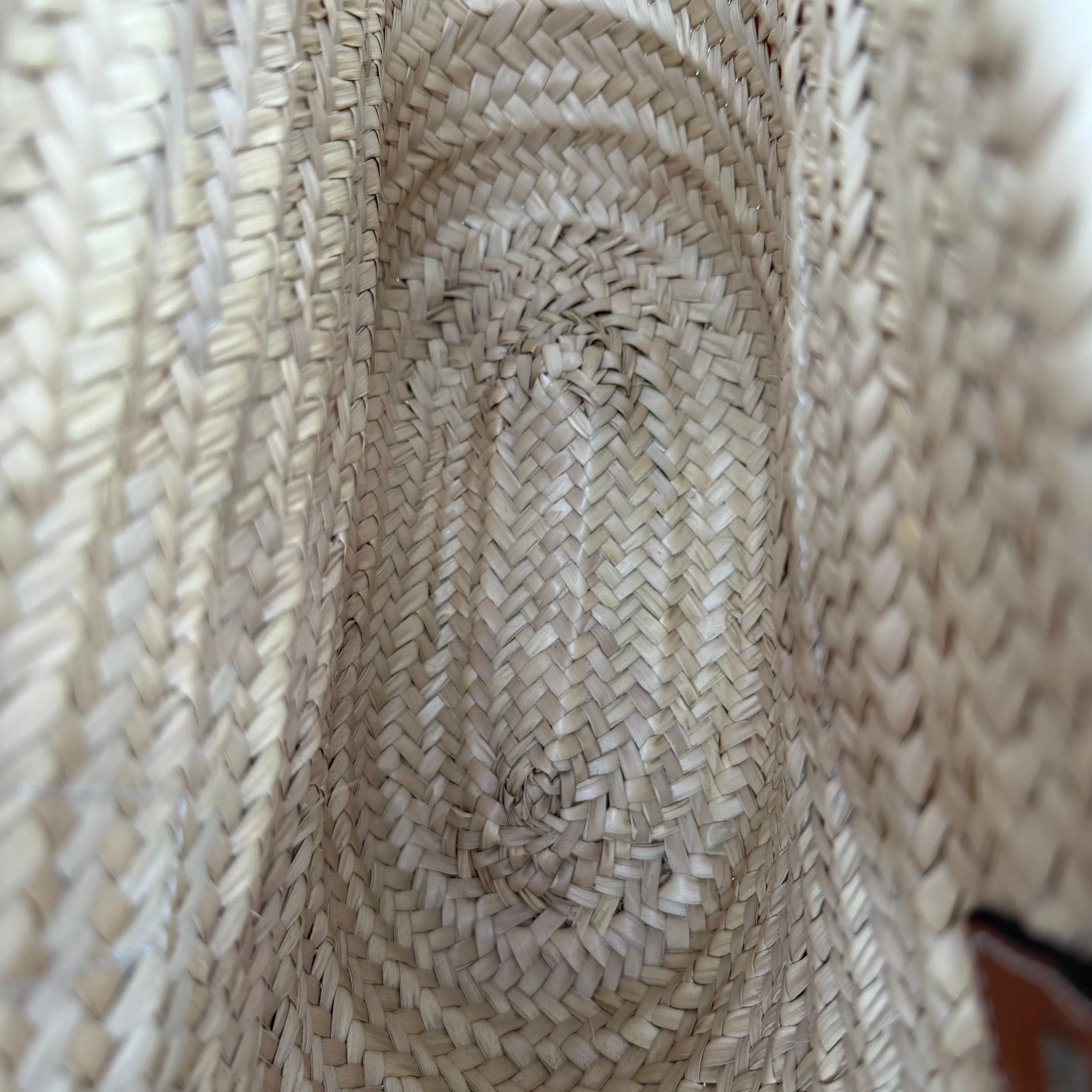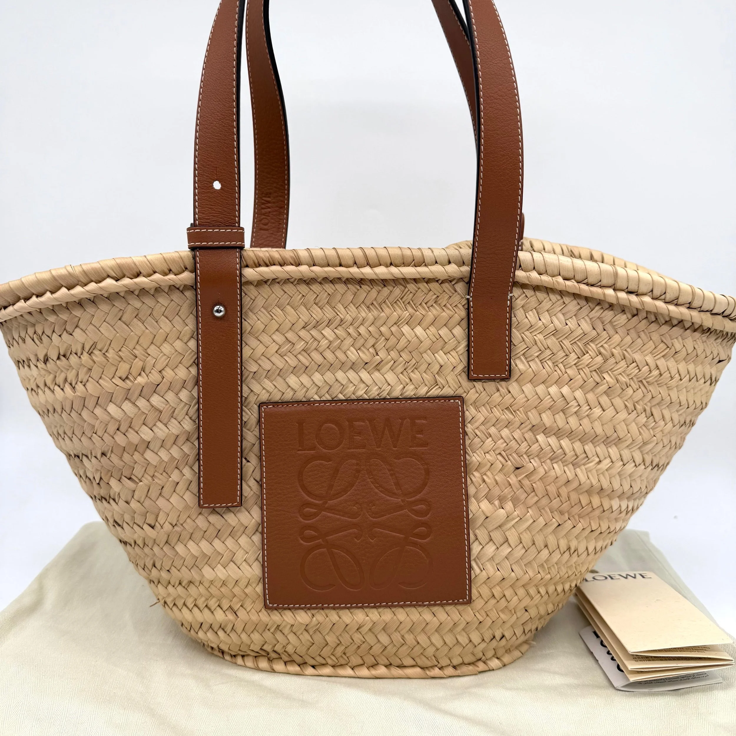 Item Description/Model: Loewe Palm Leaf Wicker and Brown Calfskin Leather Trim Large Basket Tote Bag