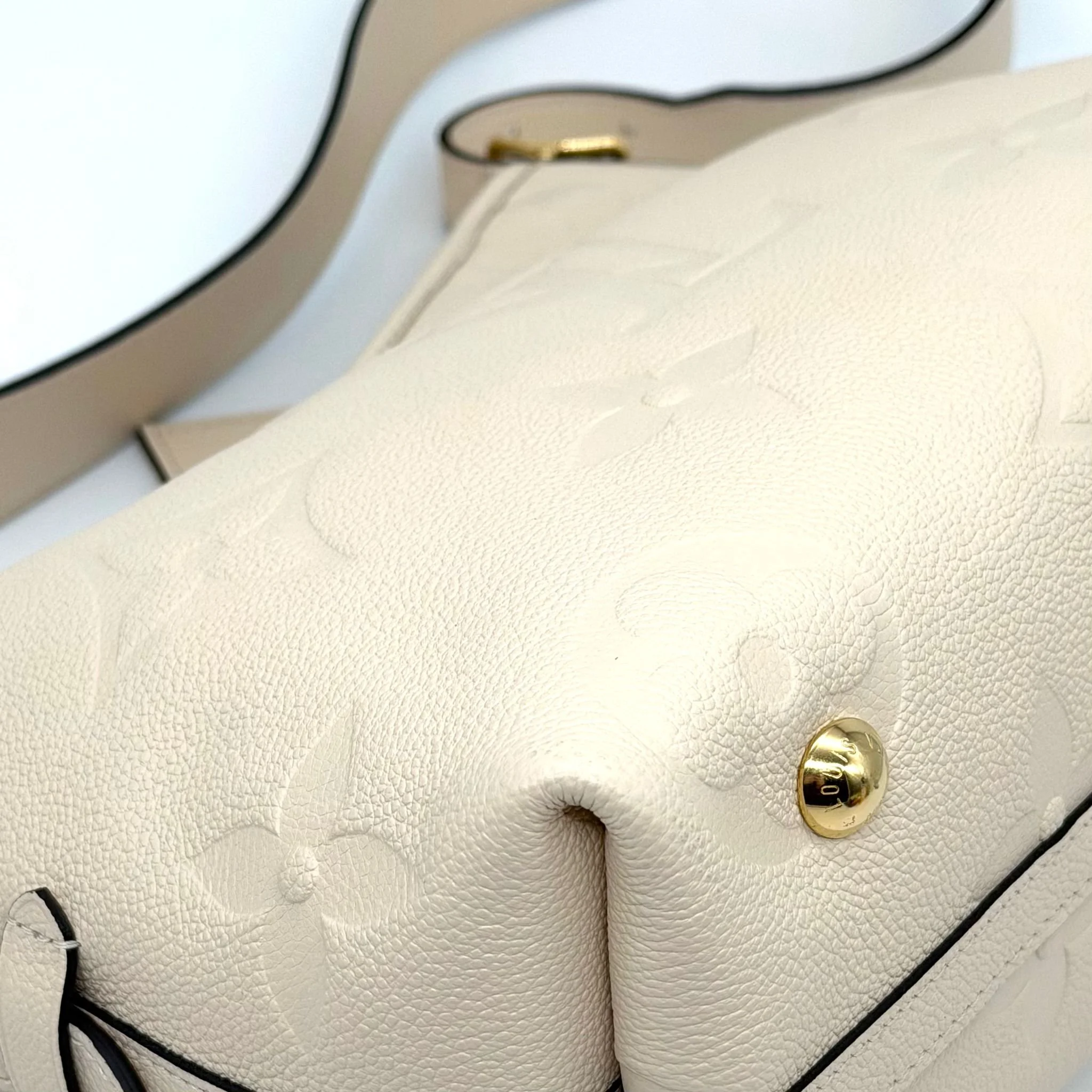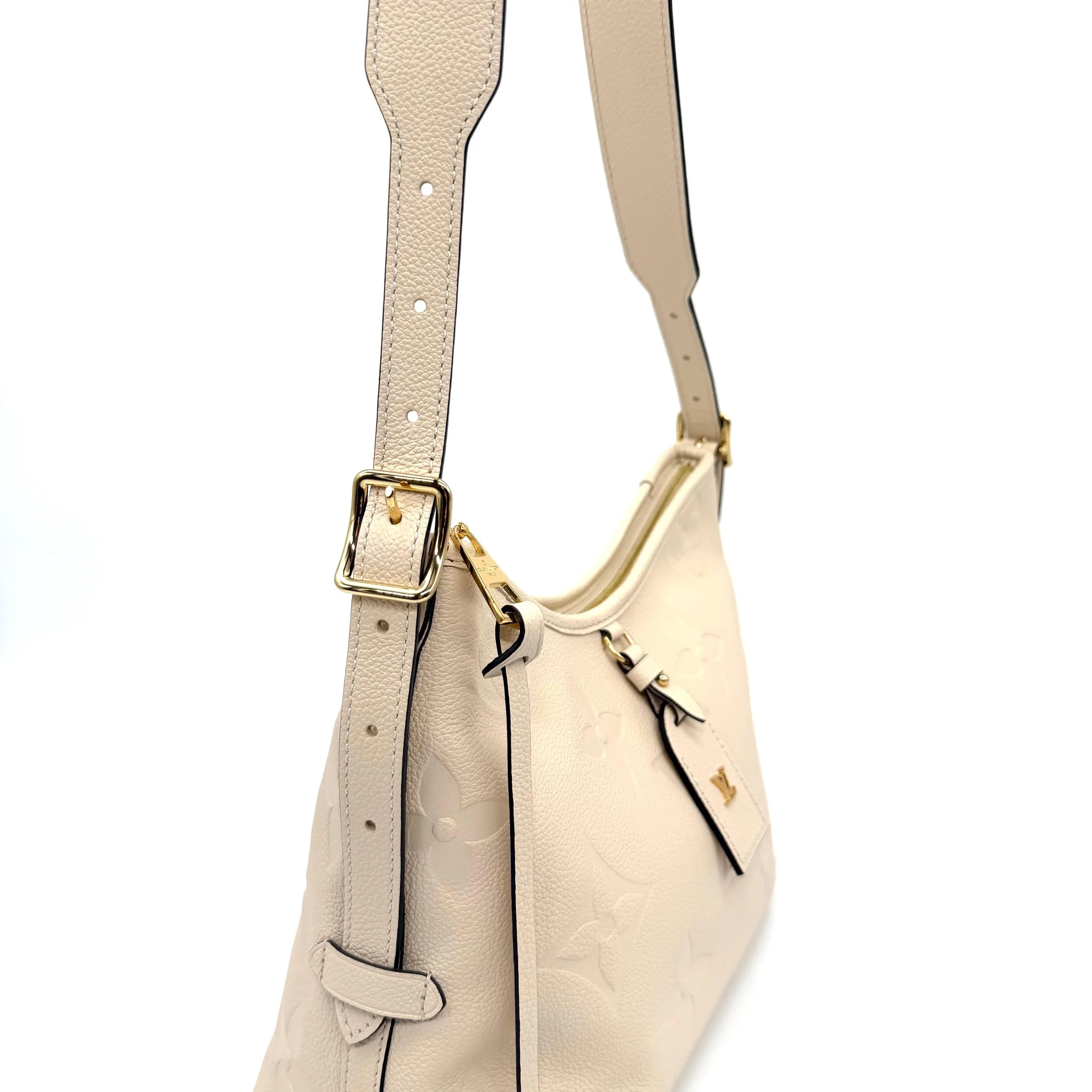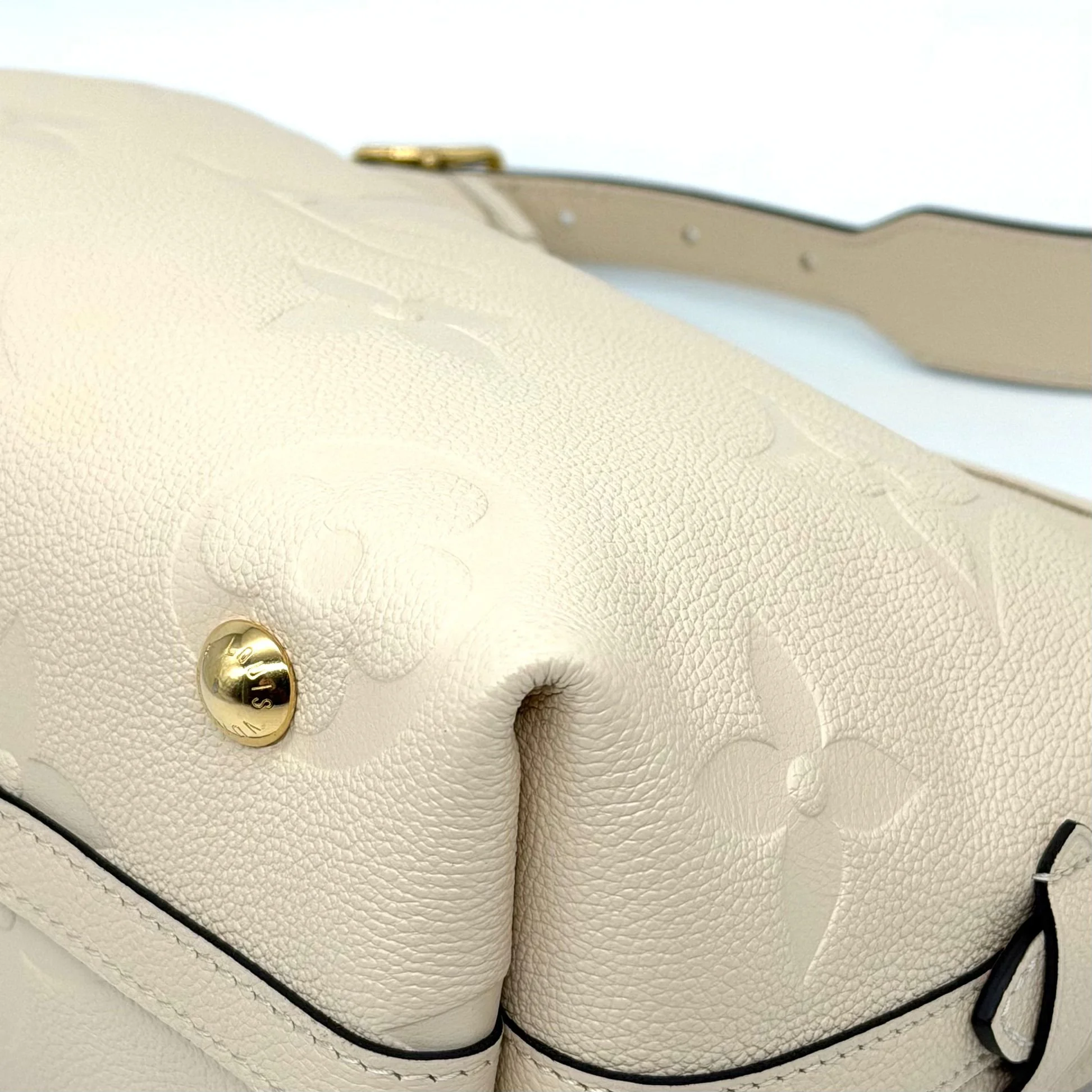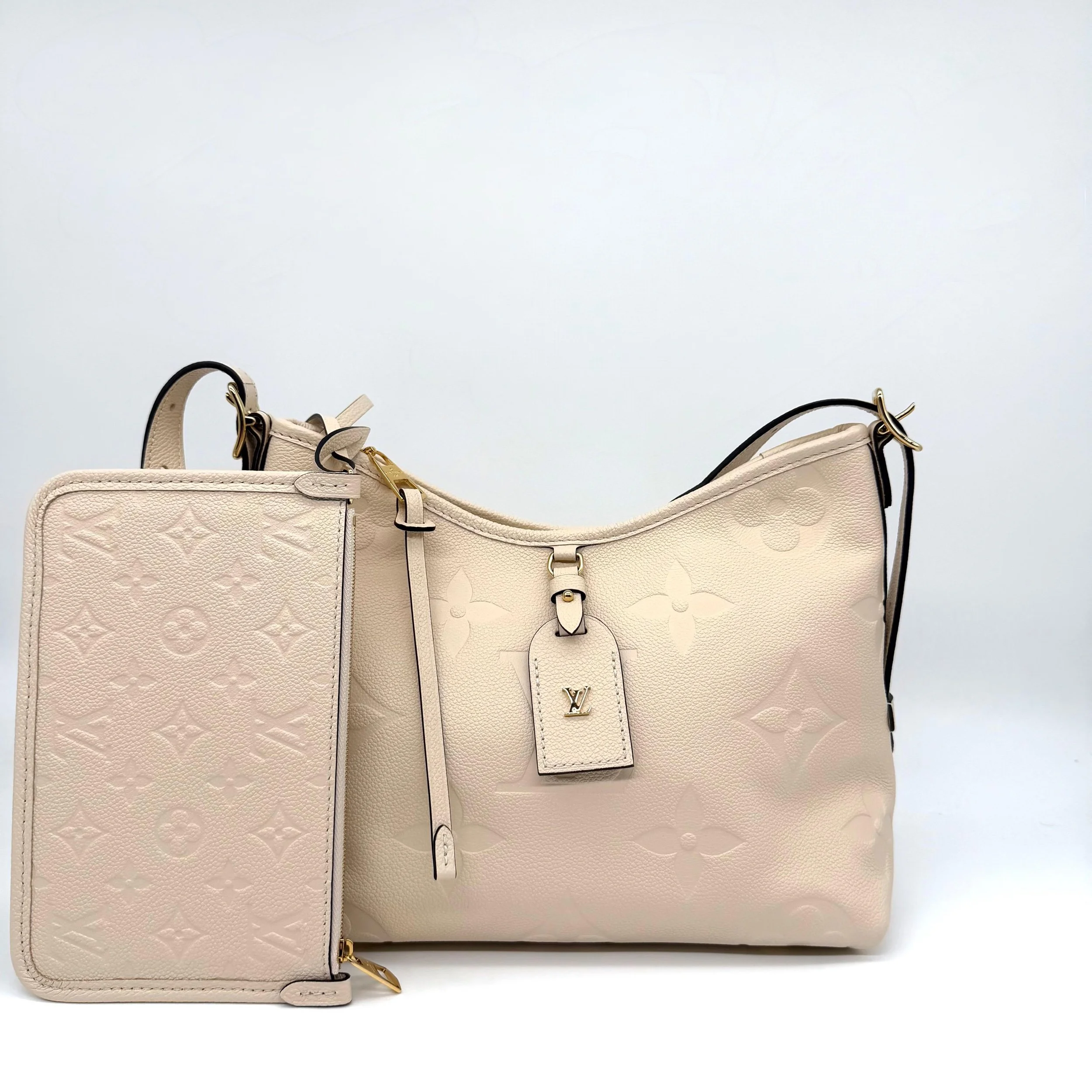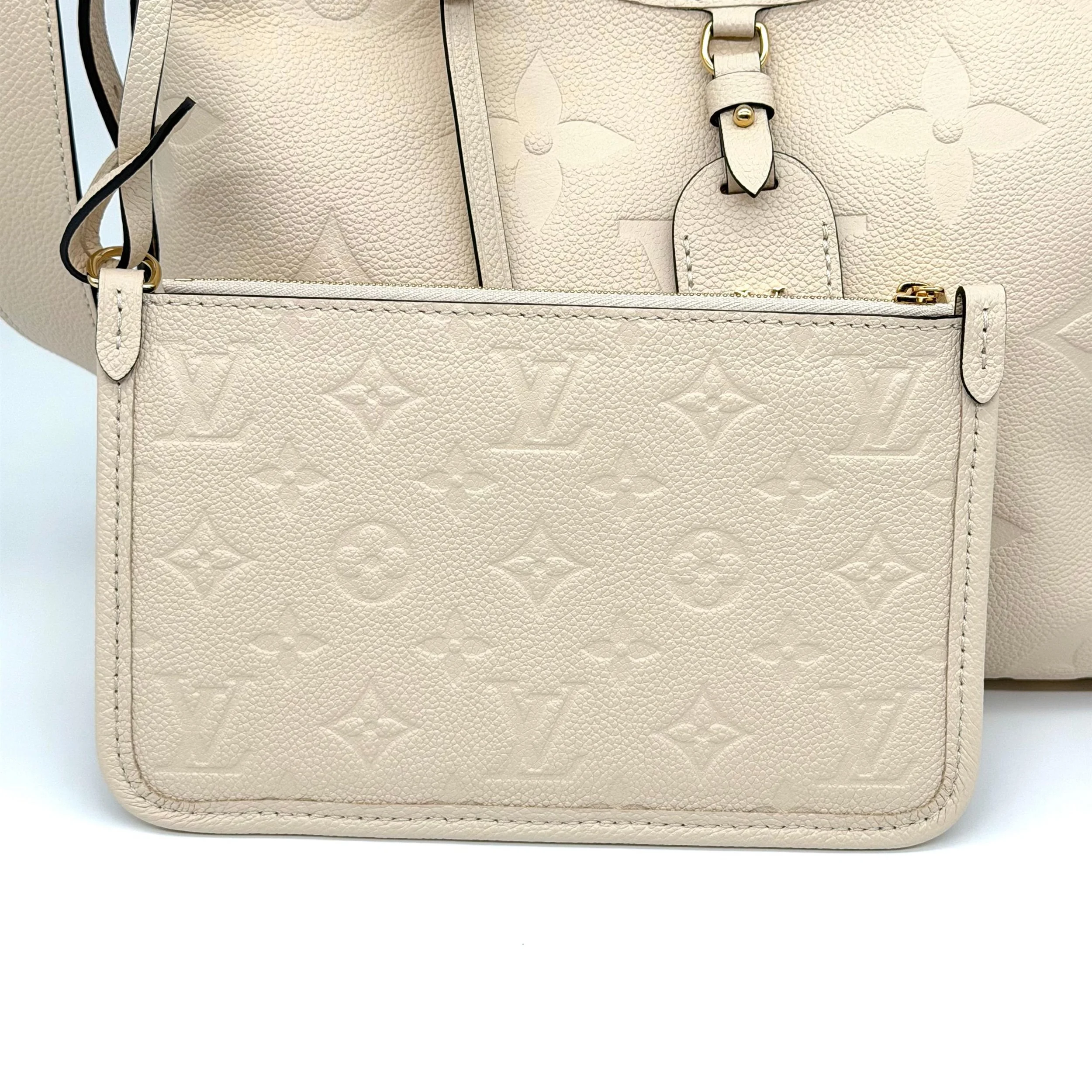 Item Description/Model: Louis Vuitton Carryall Giant Monogram PM Shoulder Bag in Cream Ivory Empreinte Leather Gold Hardware and Interior Pouch Clutch.