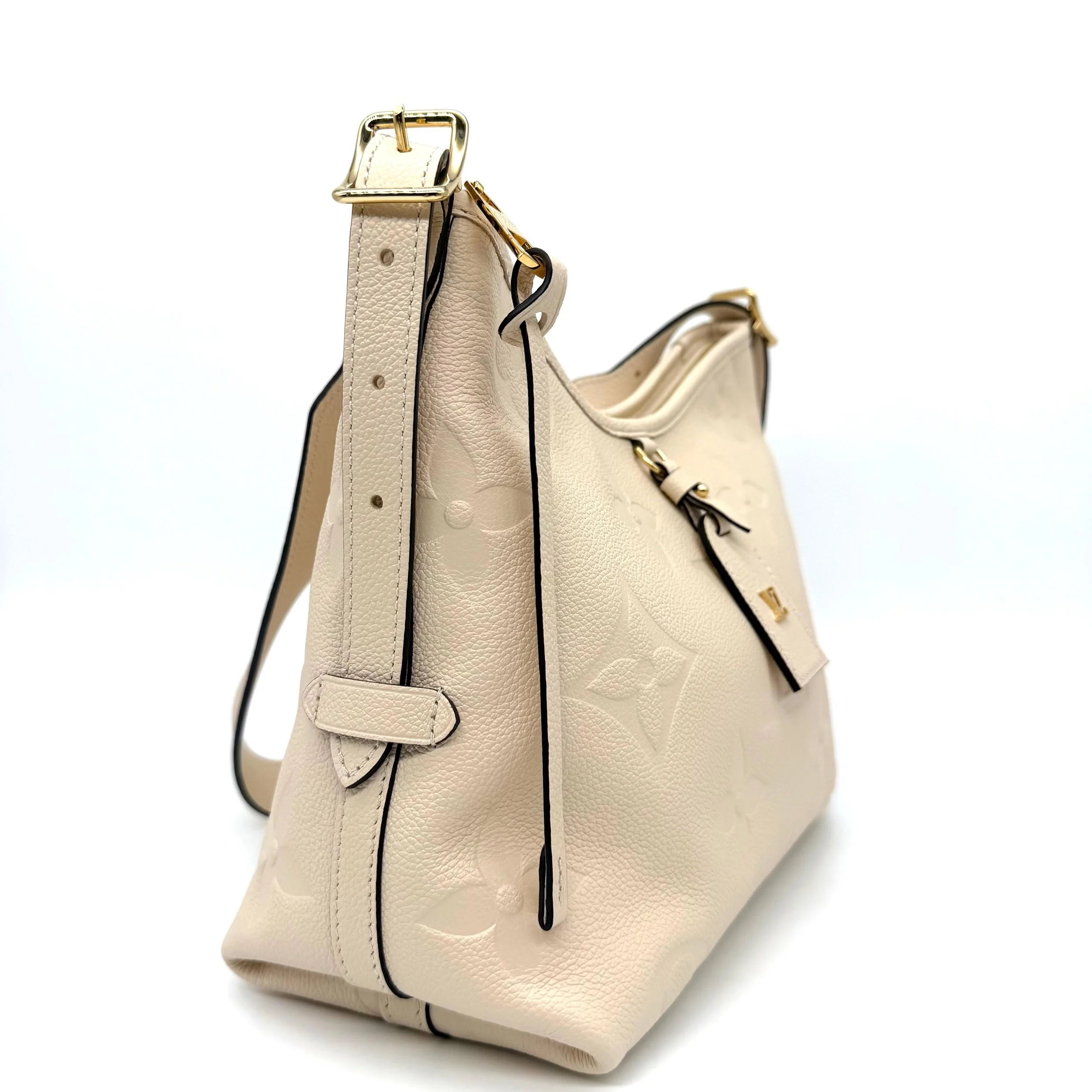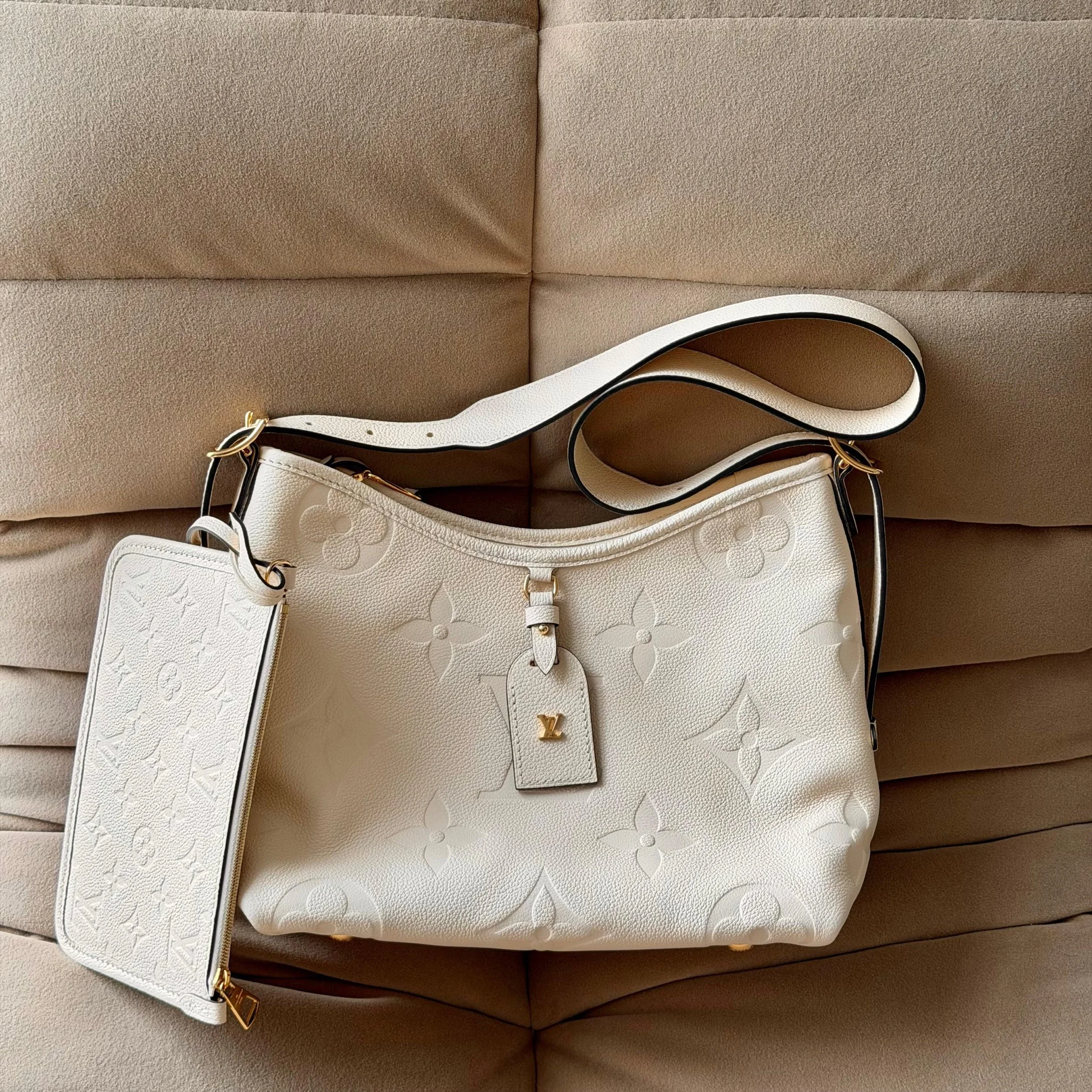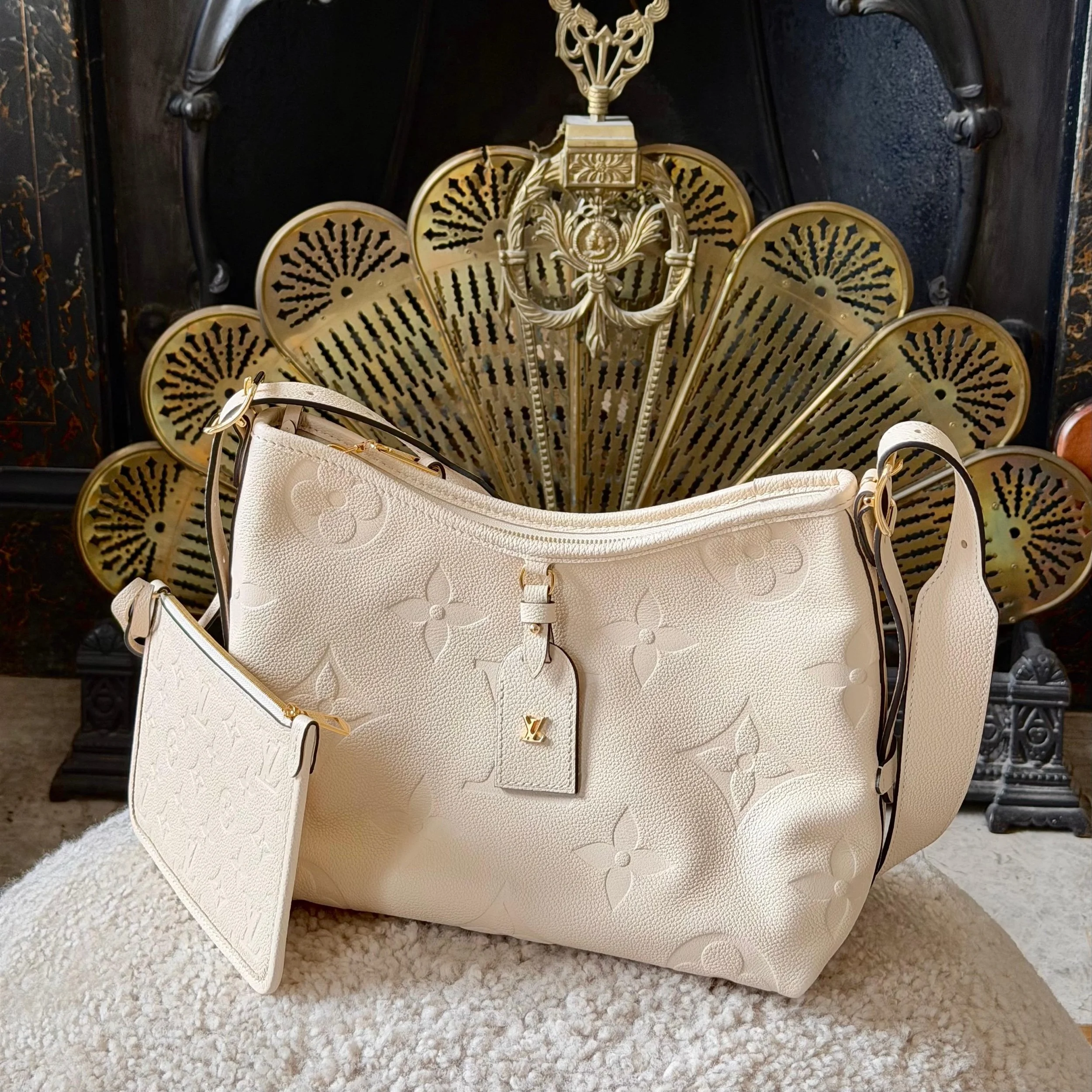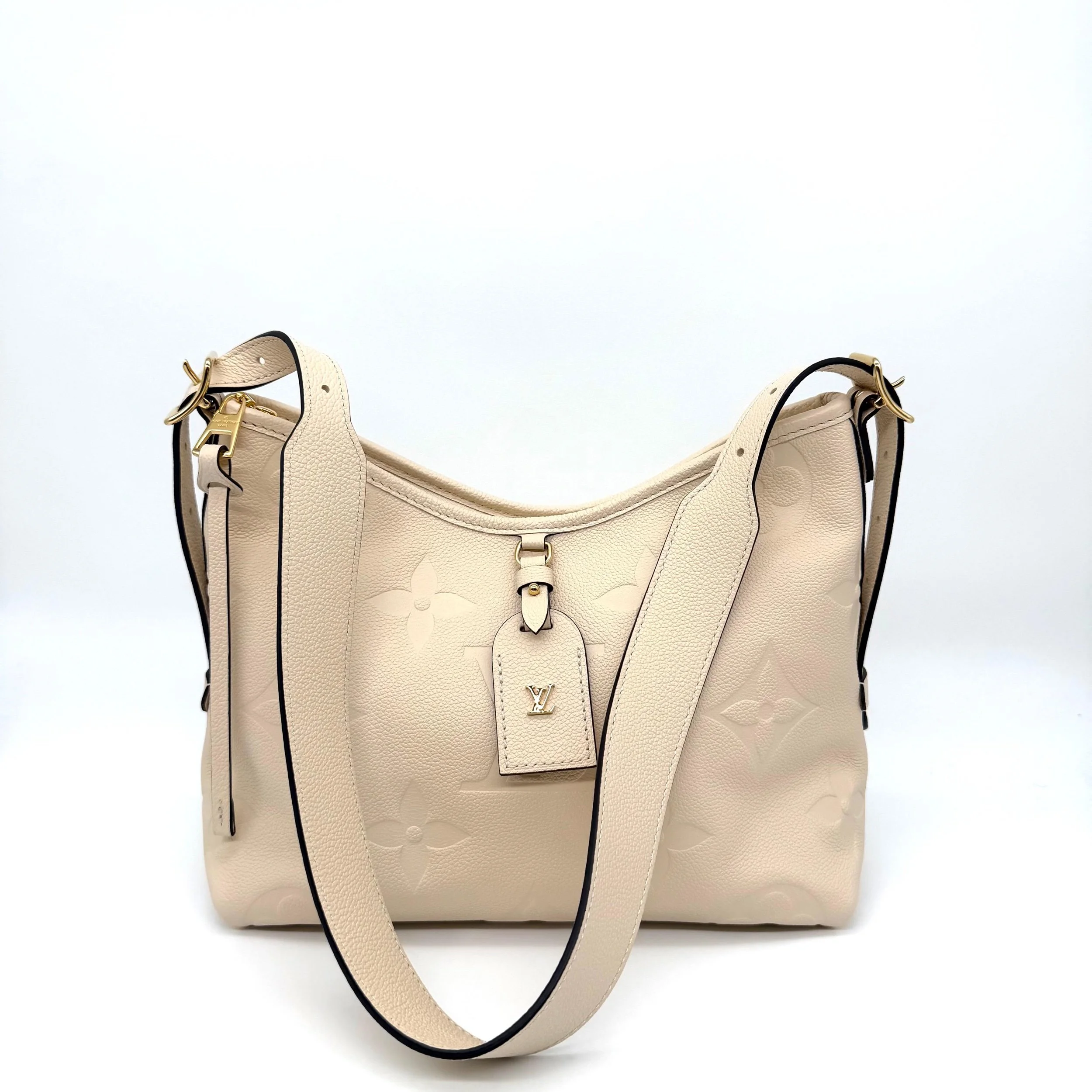 Item Description/Model: Louis Vuitton Carryall Giant Monogram PM Shoulder Bag in Cream Ivory Empreinte Leather Gold Hardware and Interior Pouch Clutch.