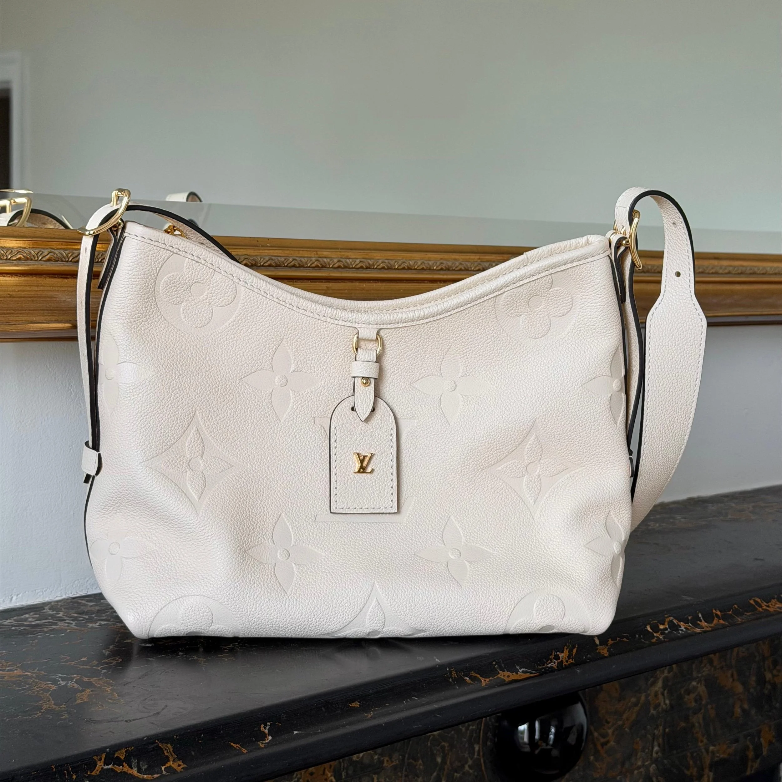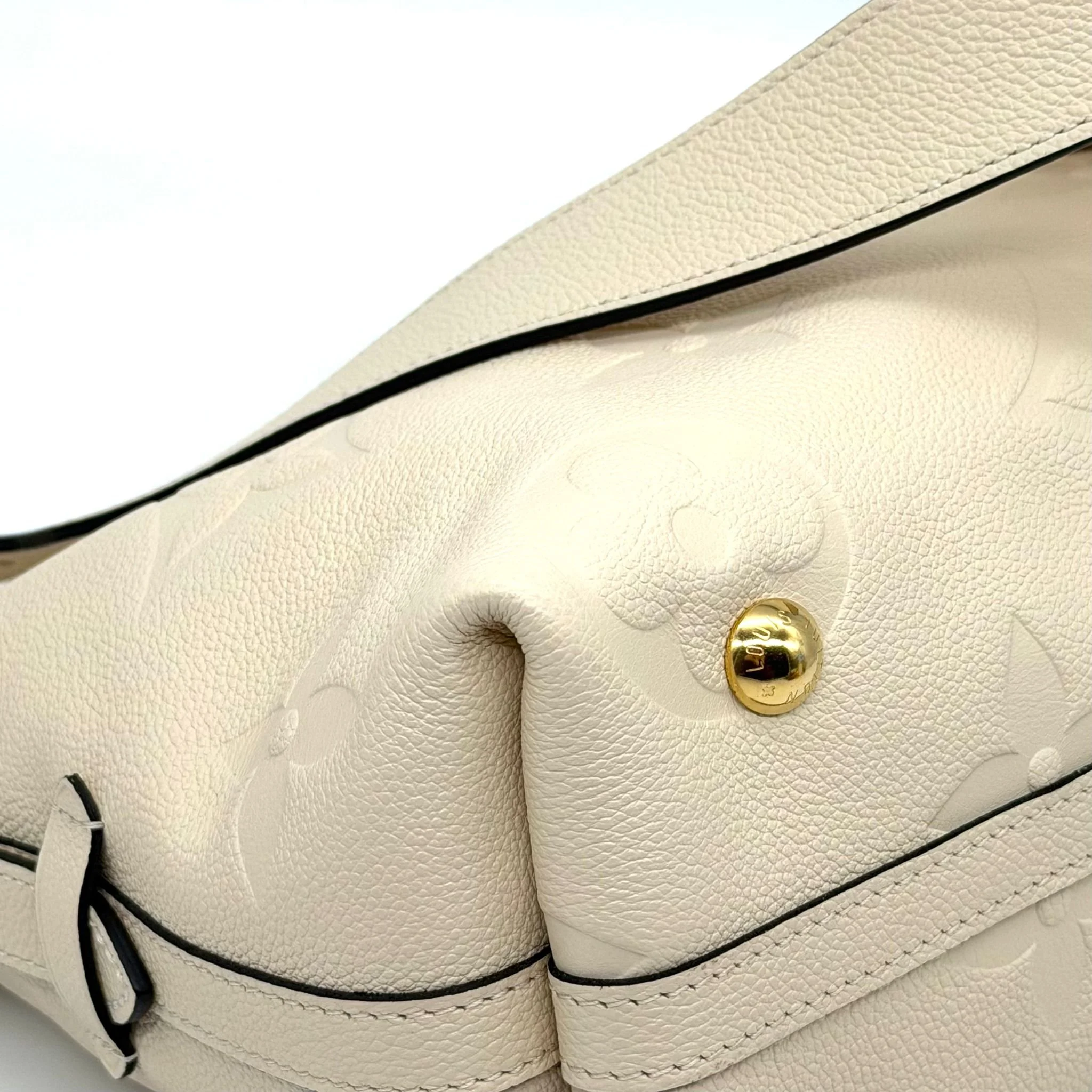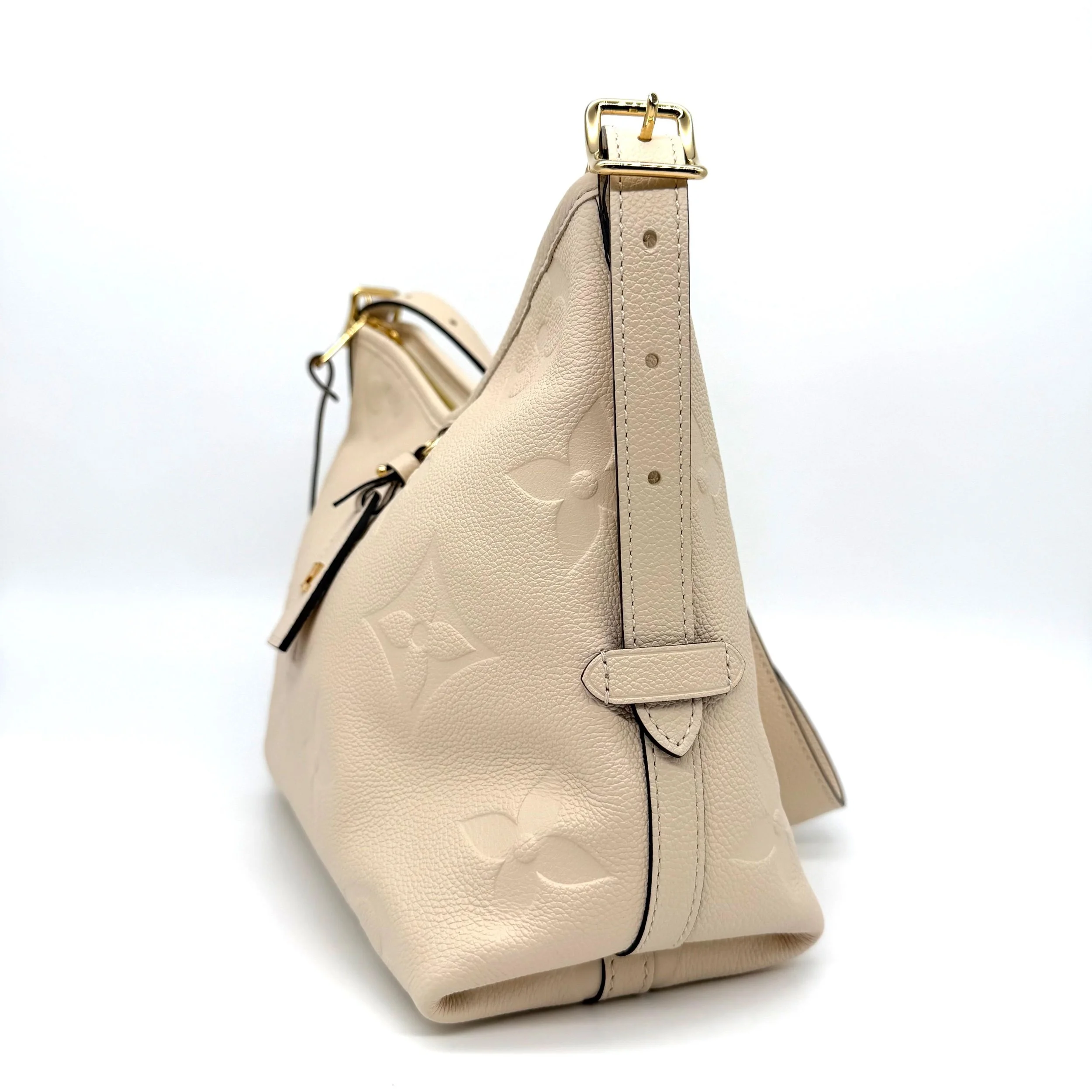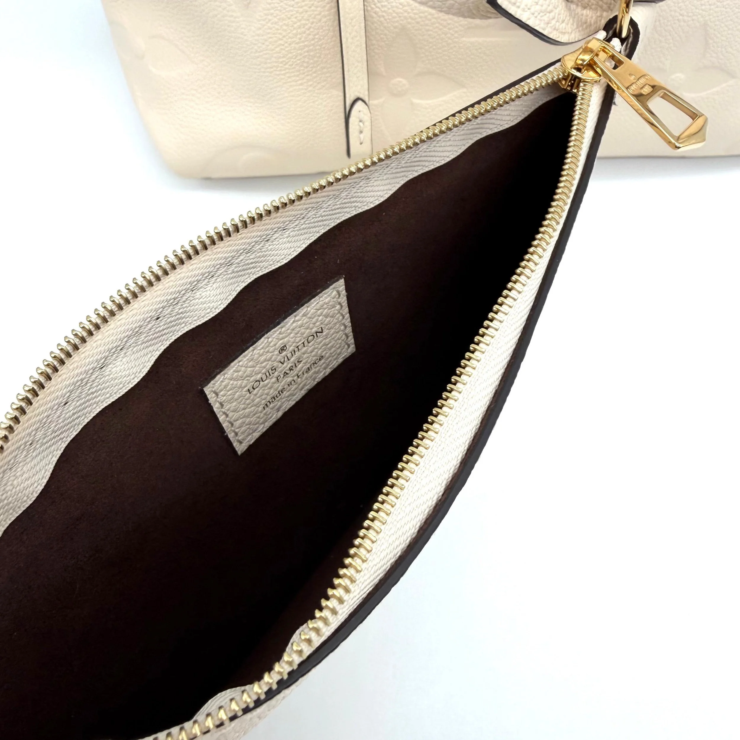 Item Description/Model: Louis Vuitton Carryall Giant Monogram PM Shoulder Bag in Cream Ivory Empreinte Leather Gold Hardware and Interior Pouch Clutch.