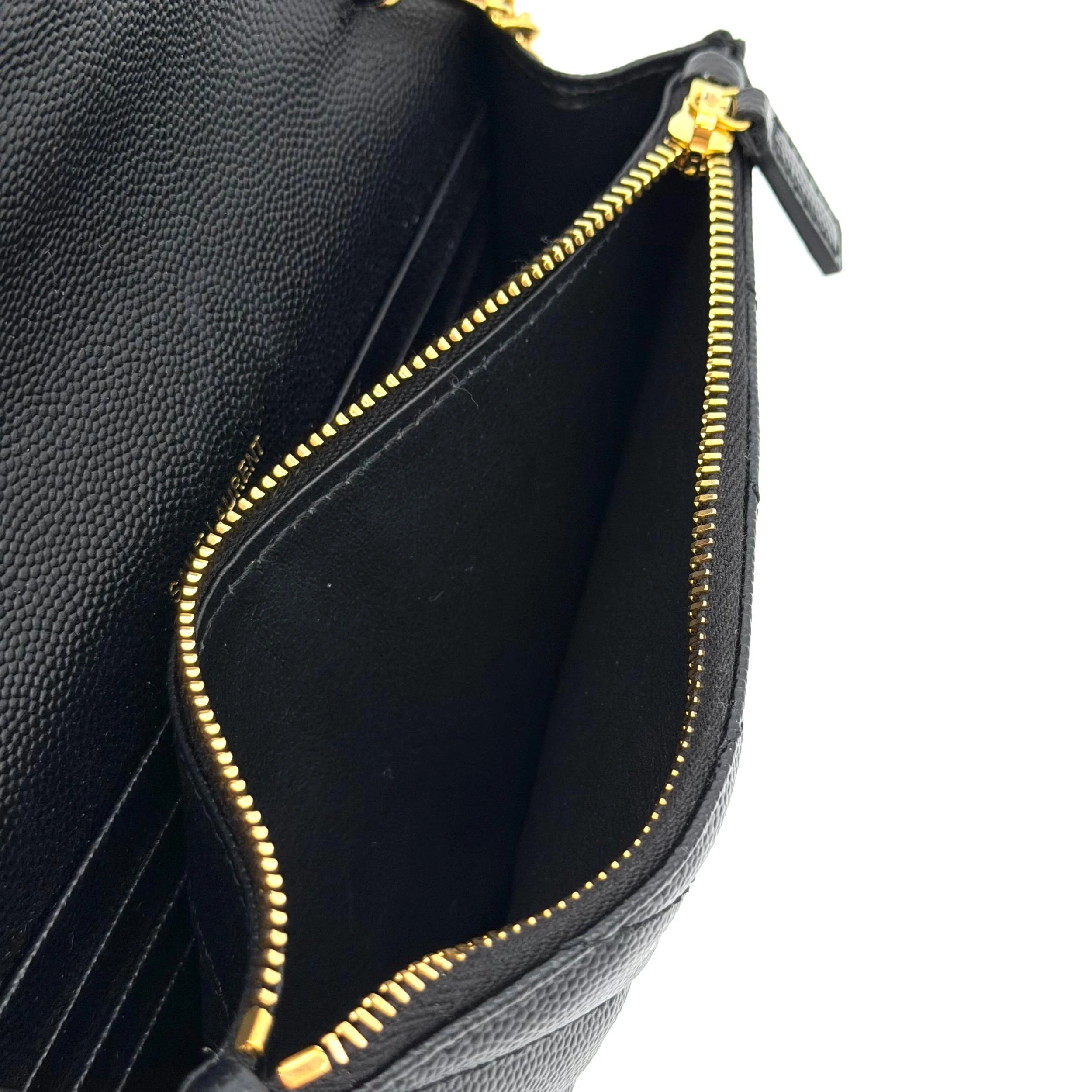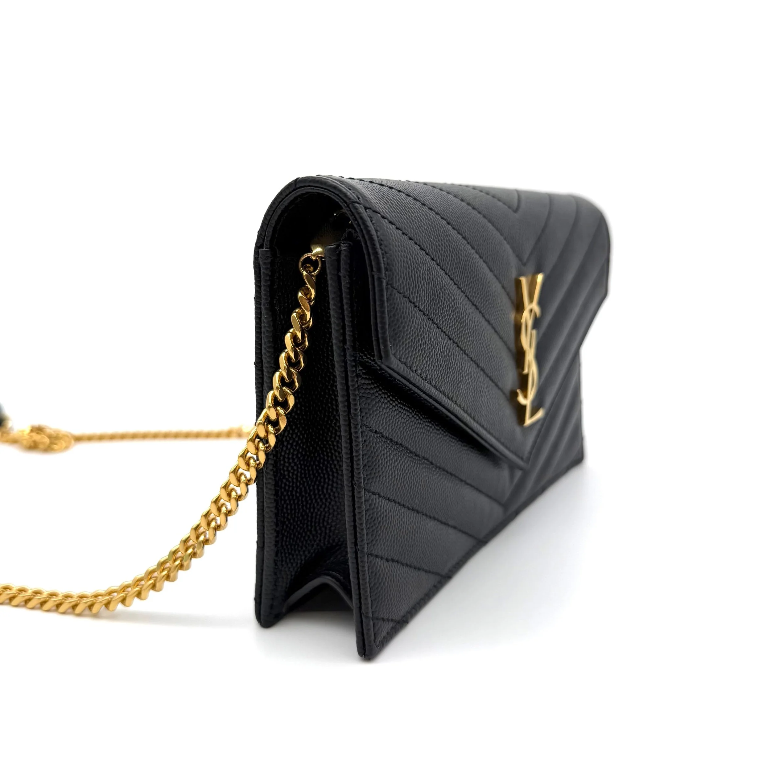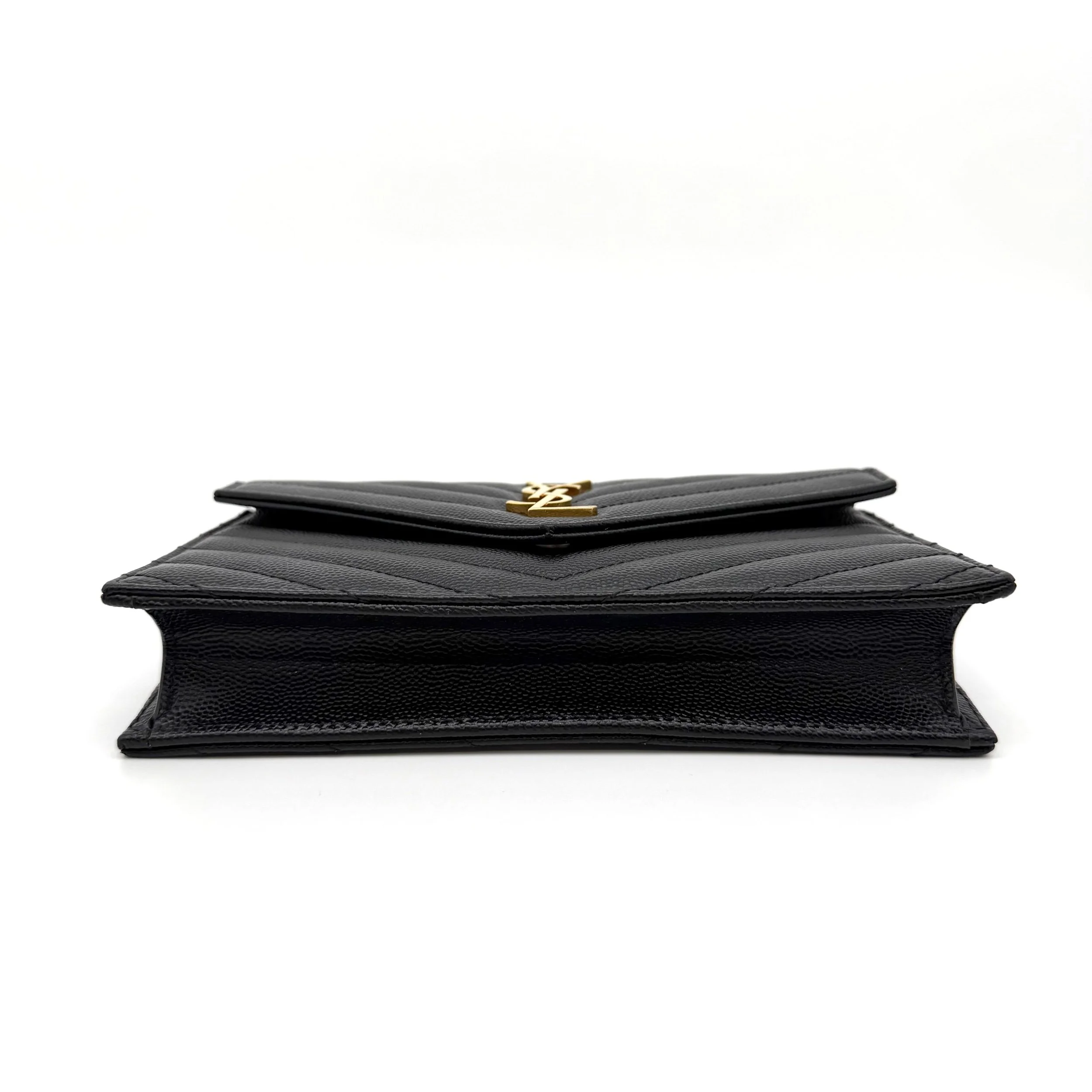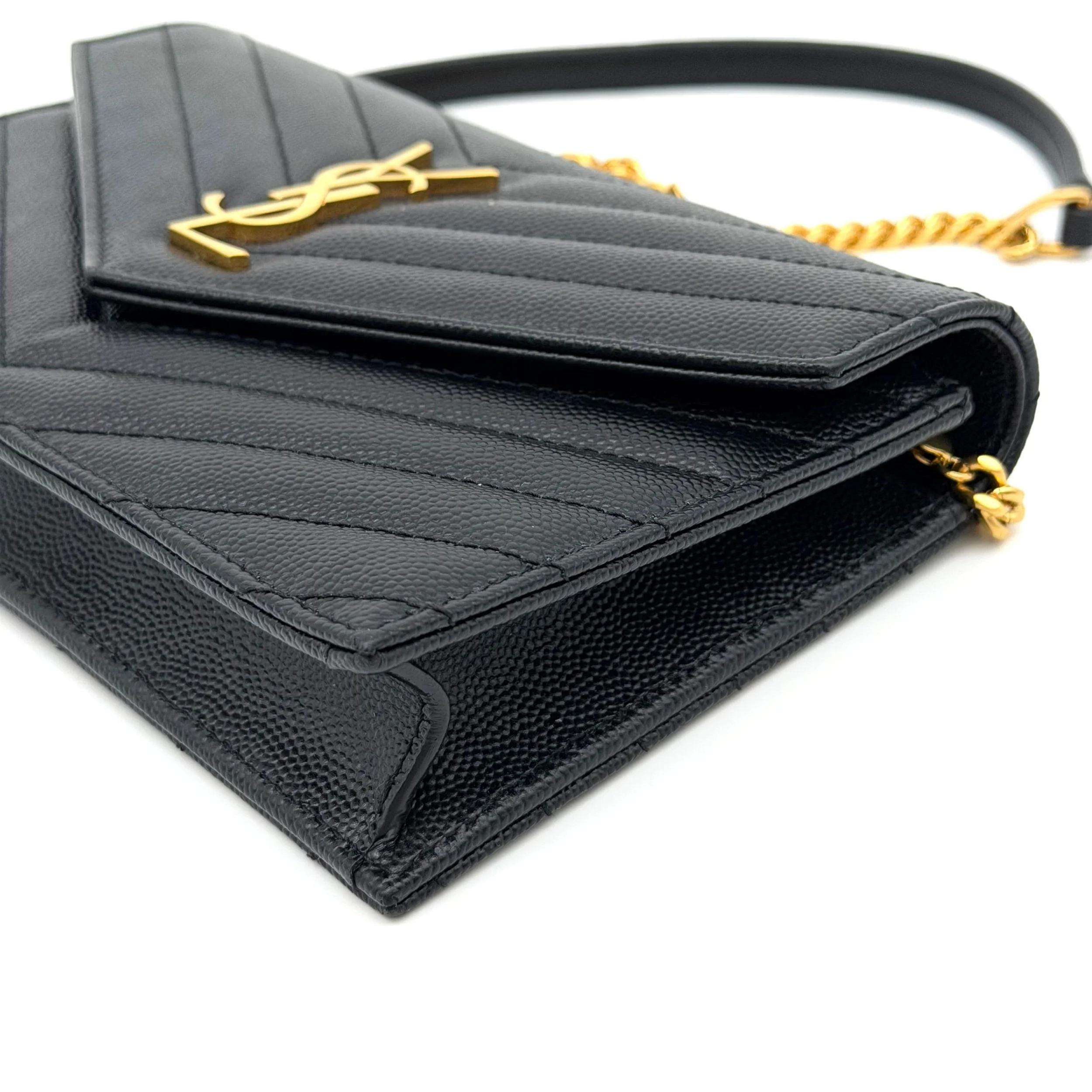 Item Description/Model: Saint Laurent YSL Small Envelope Cassandre Wallet on Chain Bag in Black Quilted Grained Leather and Gold Hardware.