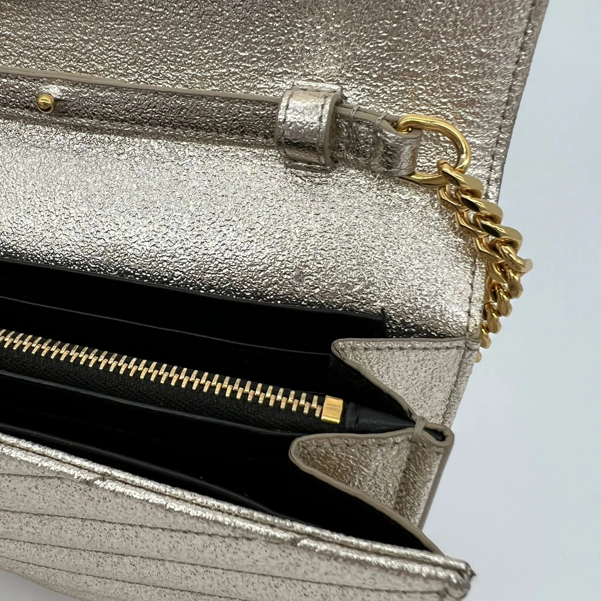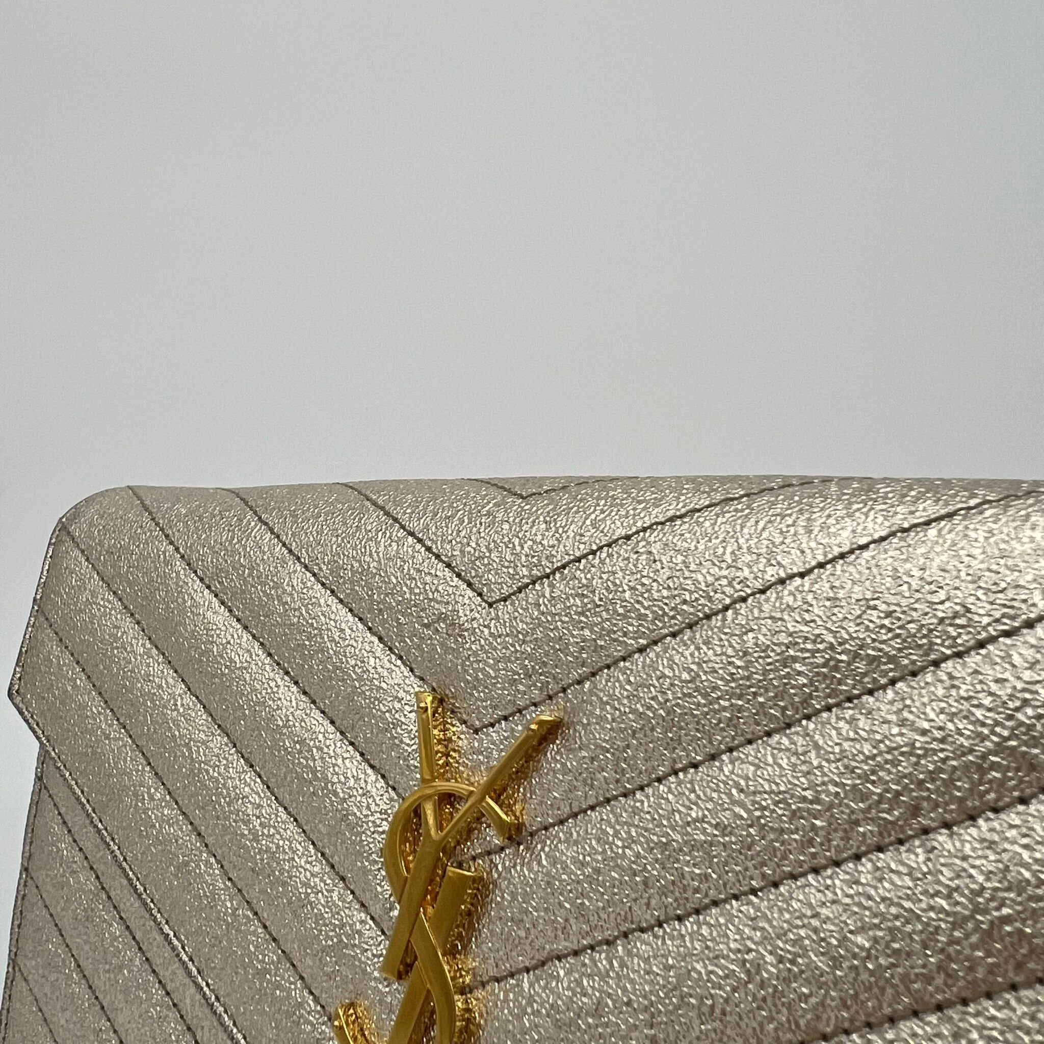 Item Description/Model: Saint Laurent YSL Envelope Cassandre Large Wallet on Chain Bag in Champaigne Gold Leather and Gold Hardware.