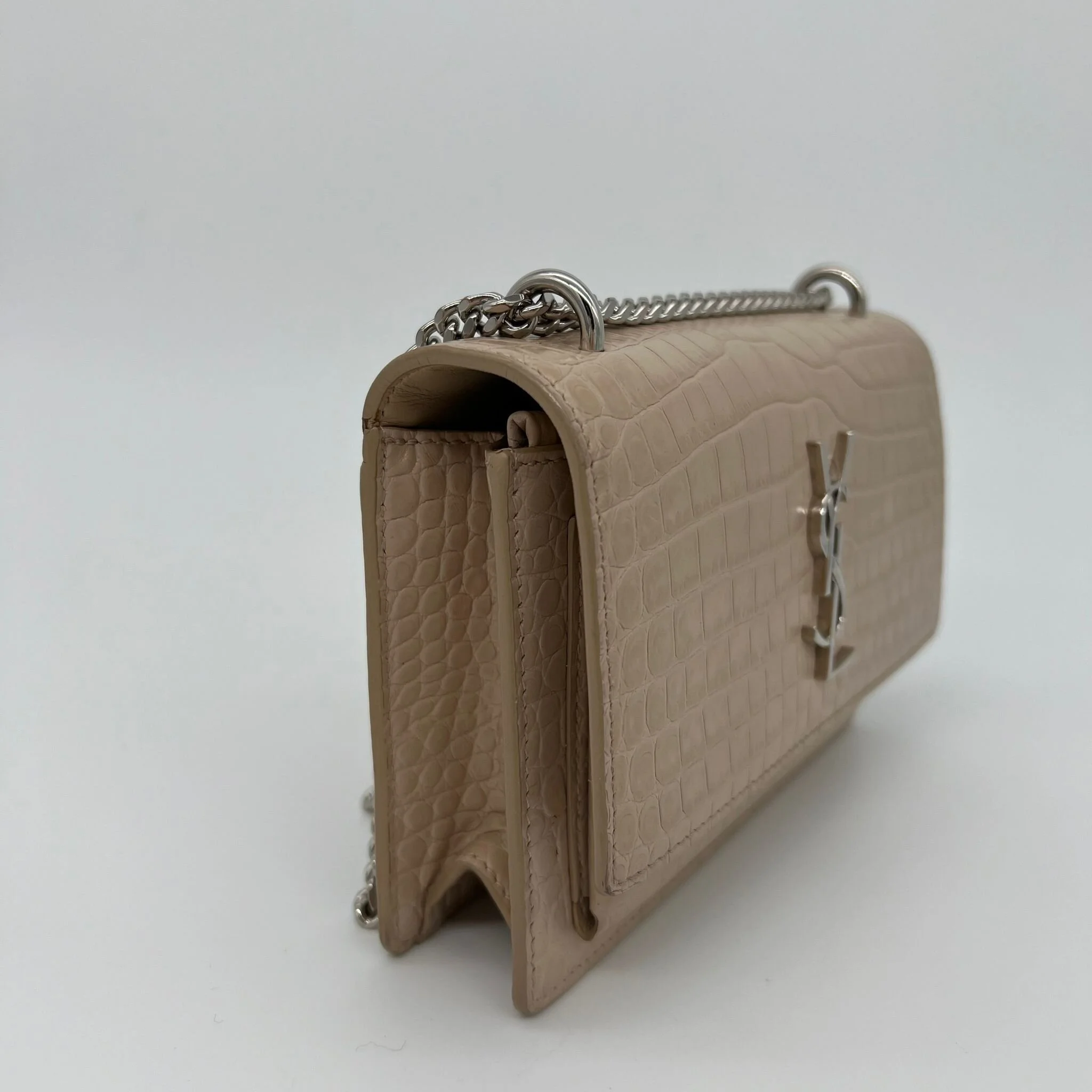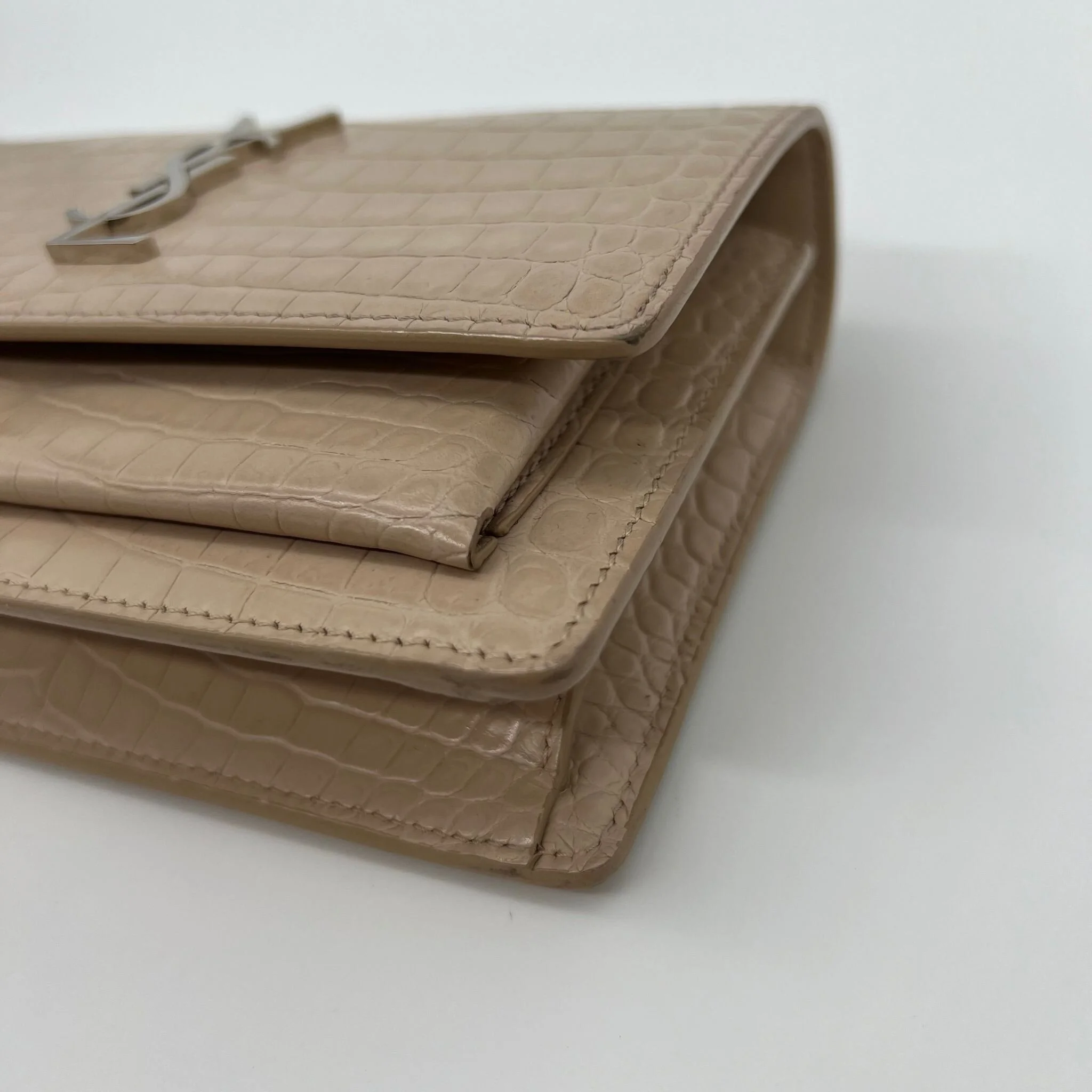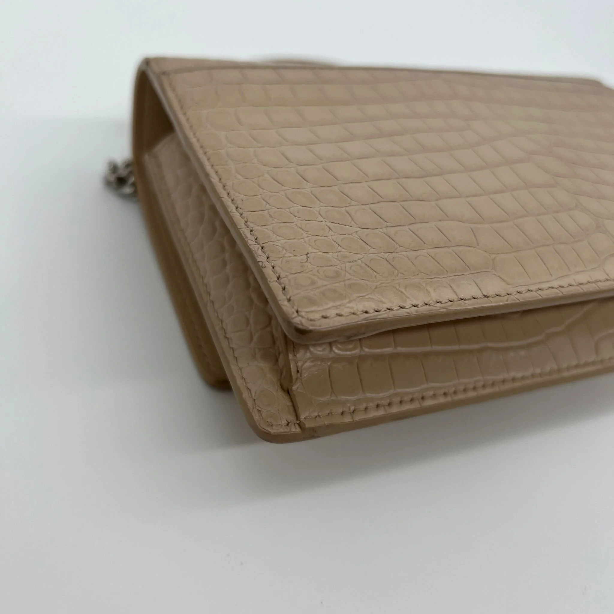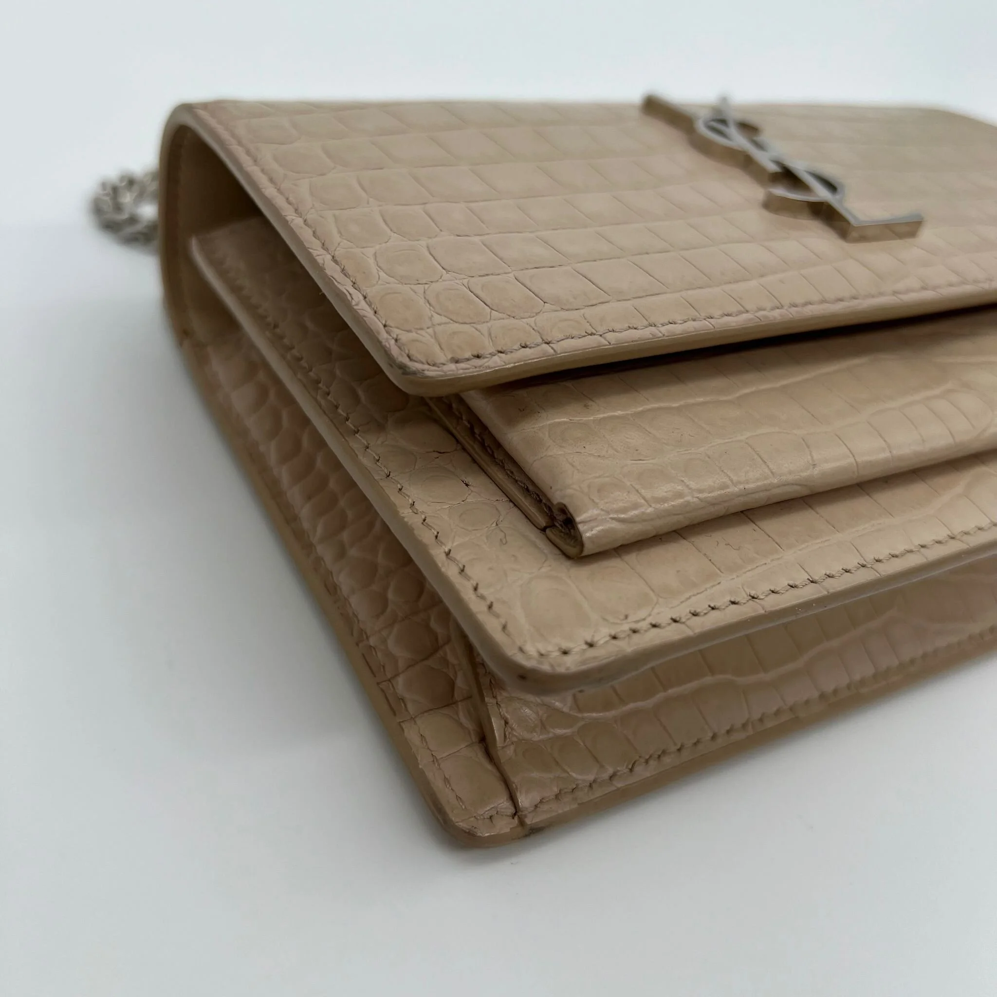 Item Description/Model: Saint Laurent YSL Sunset Wallet on Chain Bag in Croc Embossed Dark Beige Leather and Silver Hardware