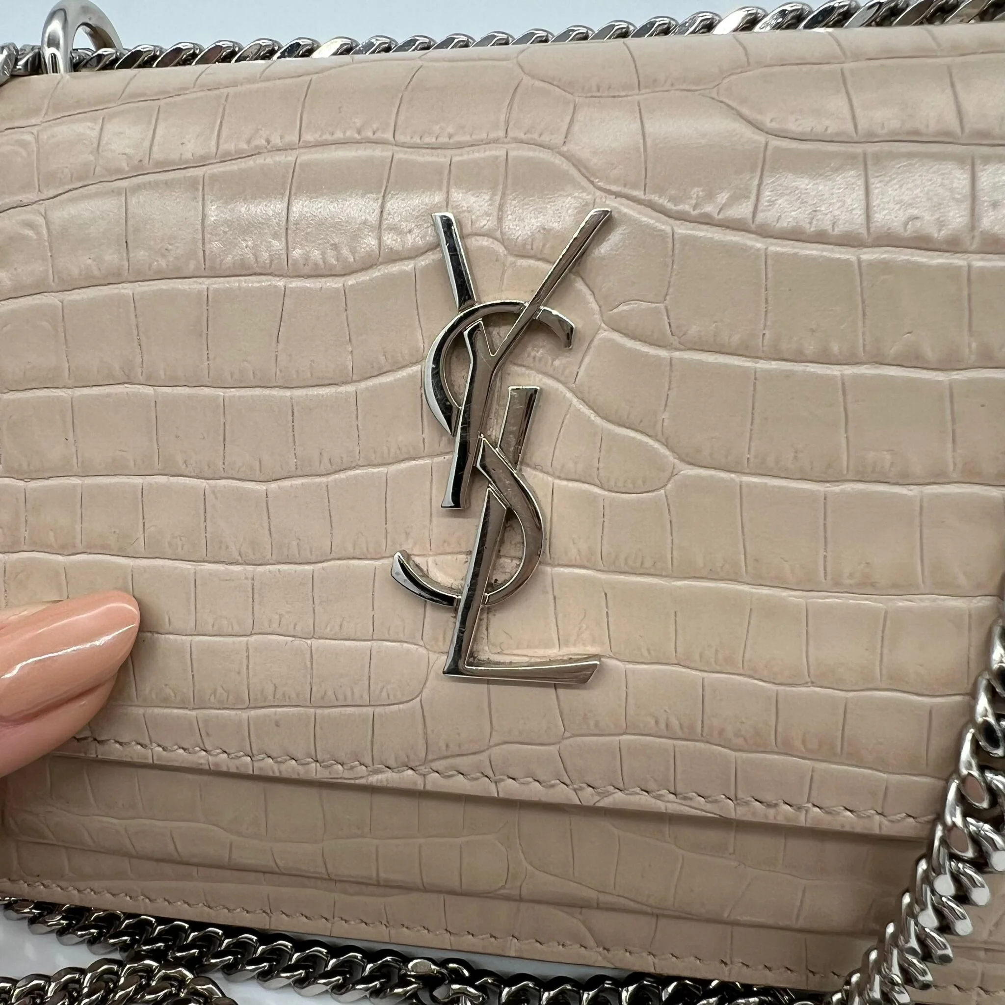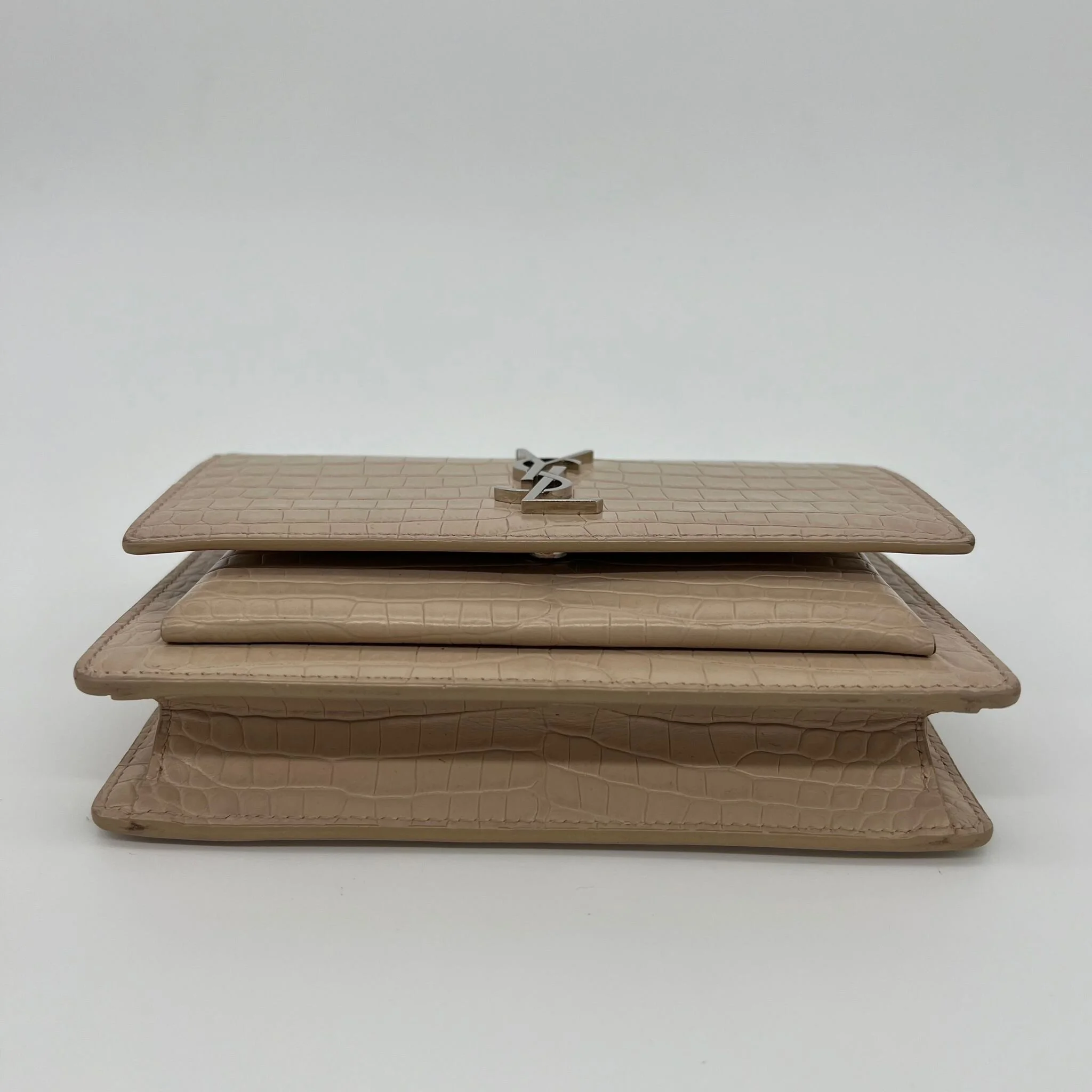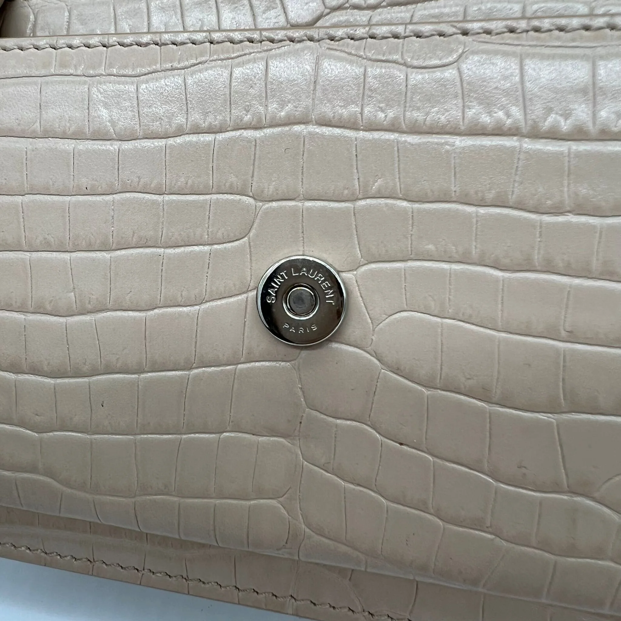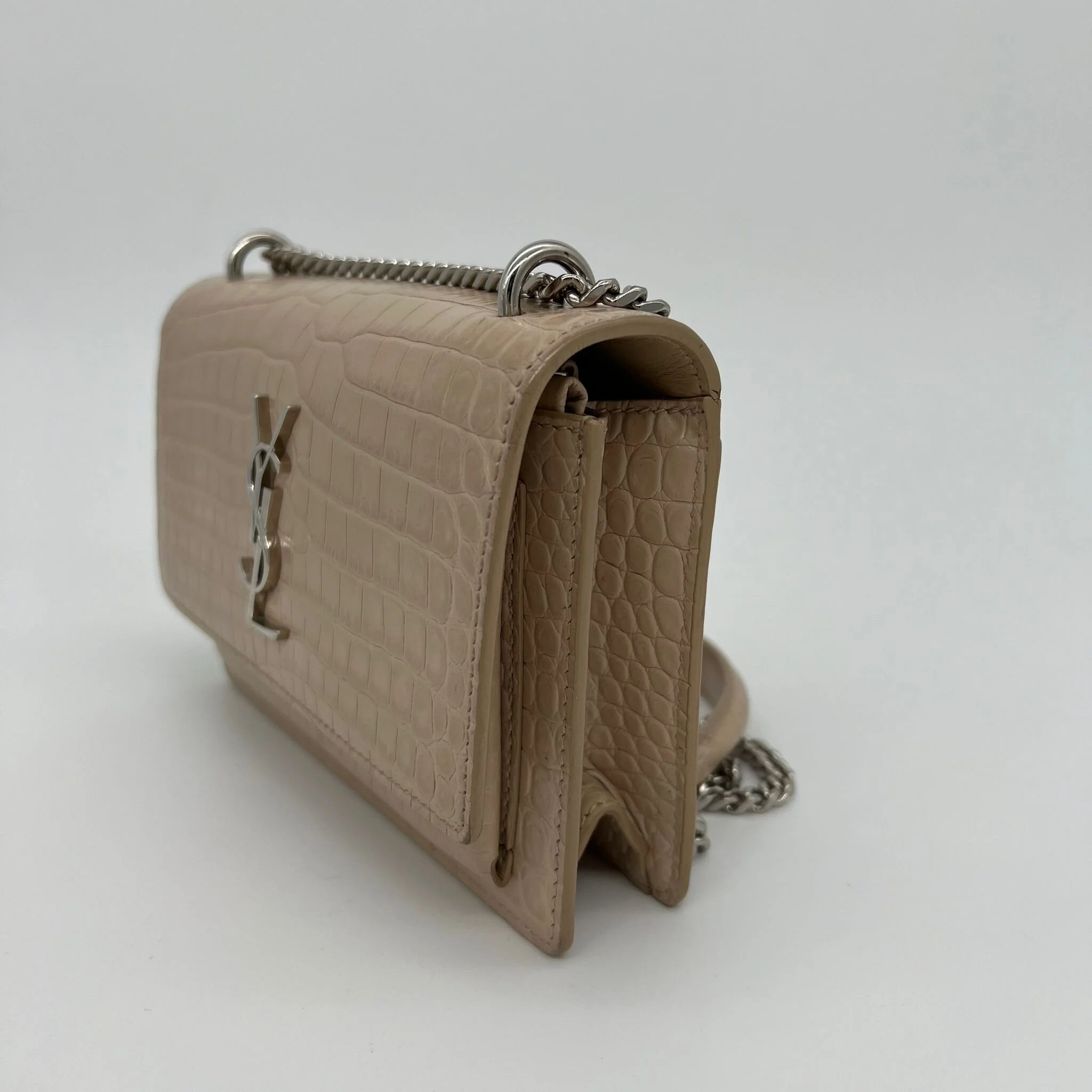 Item Description/Model: Saint Laurent YSL Sunset Wallet on Chain Bag in Croc Embossed Dark Beige Leather and Silver Hardware