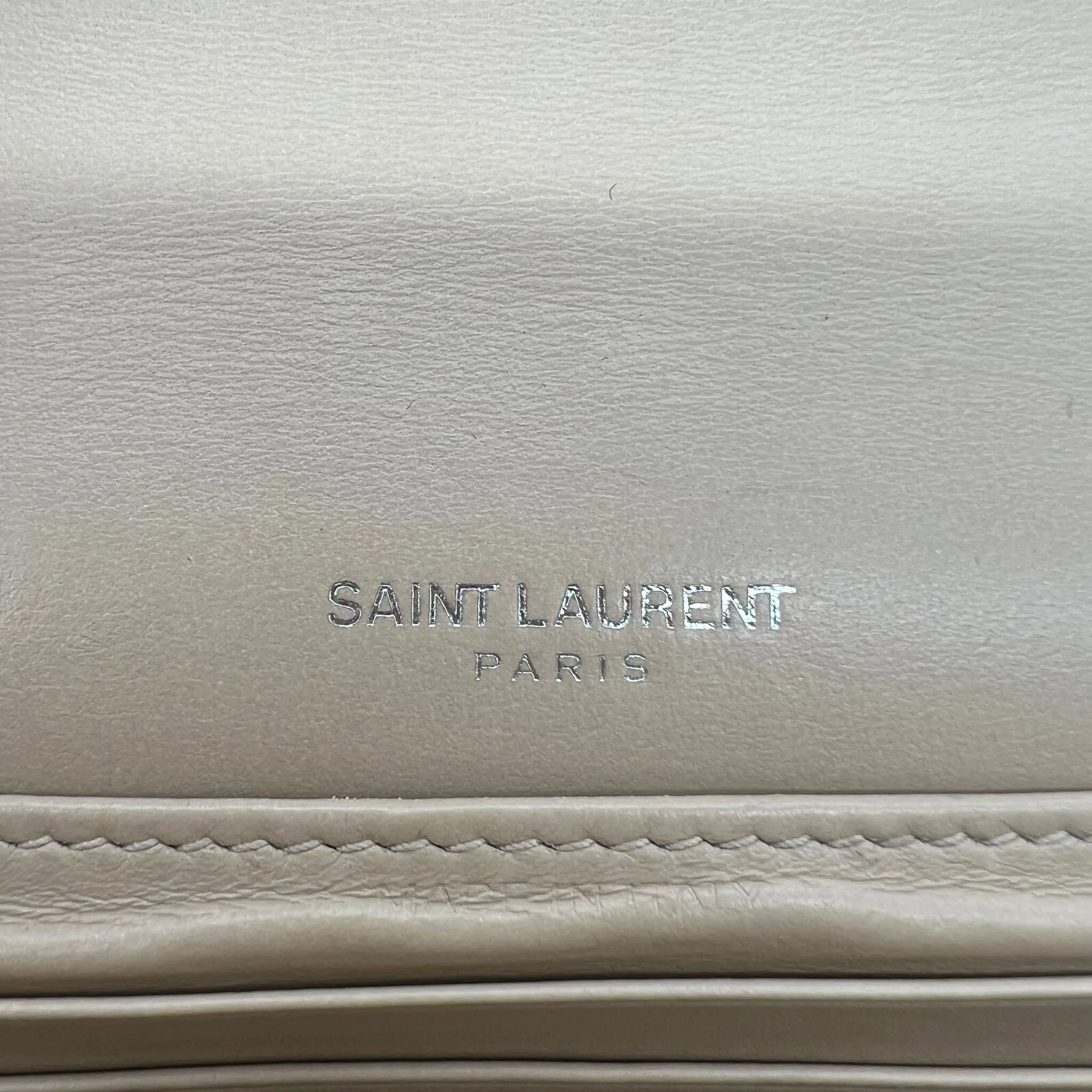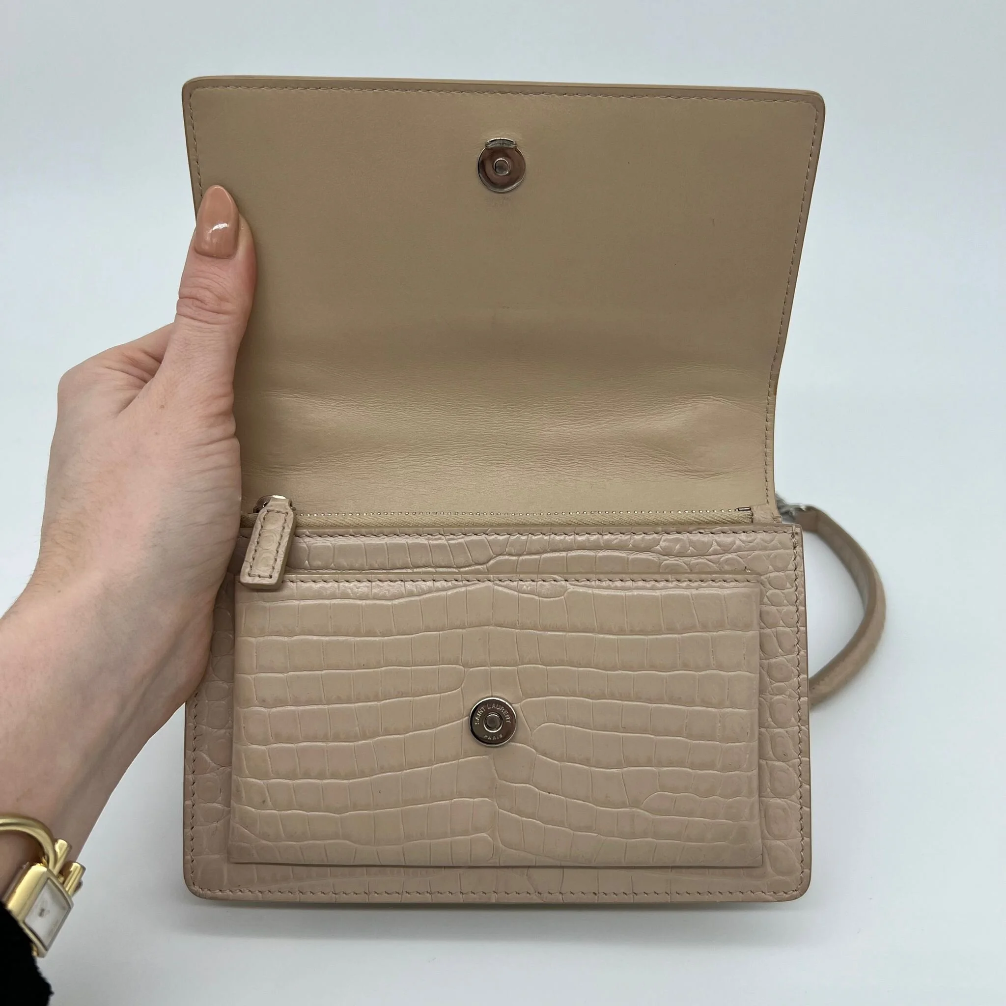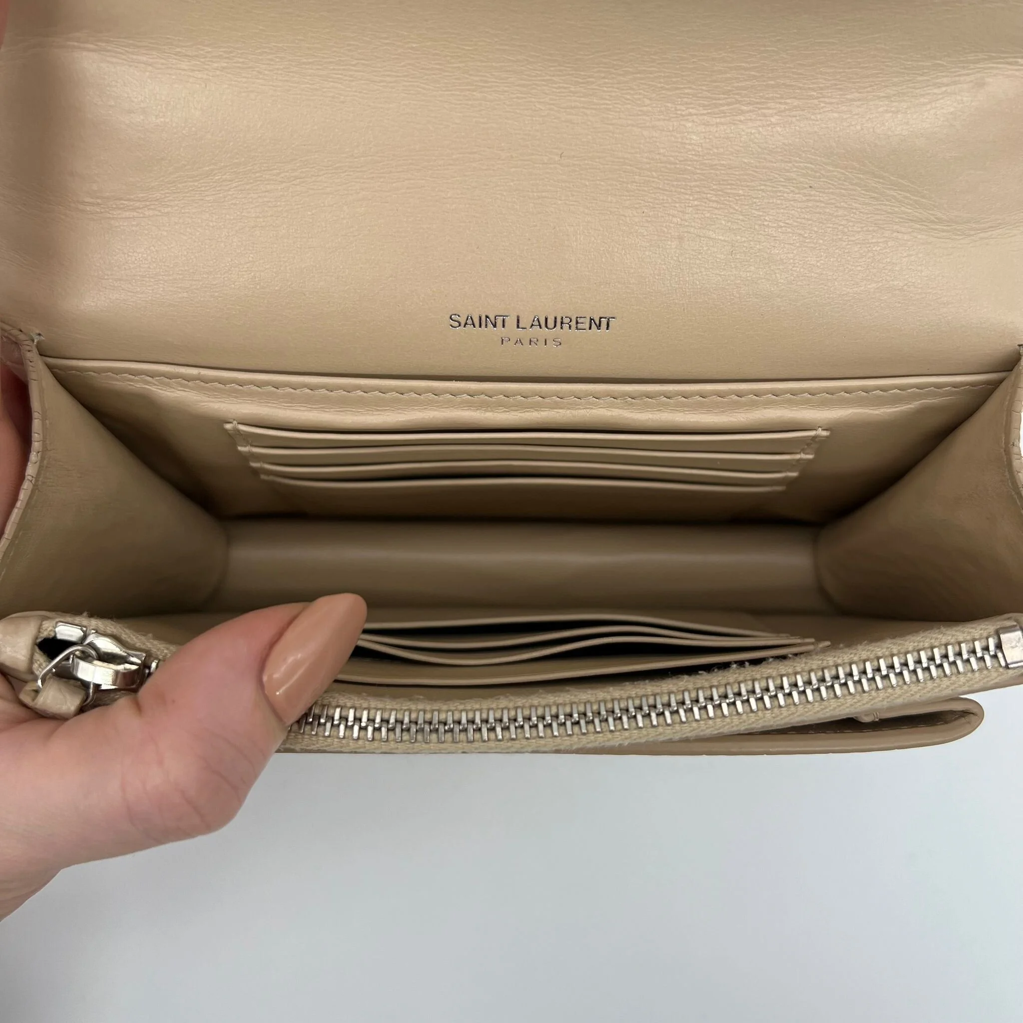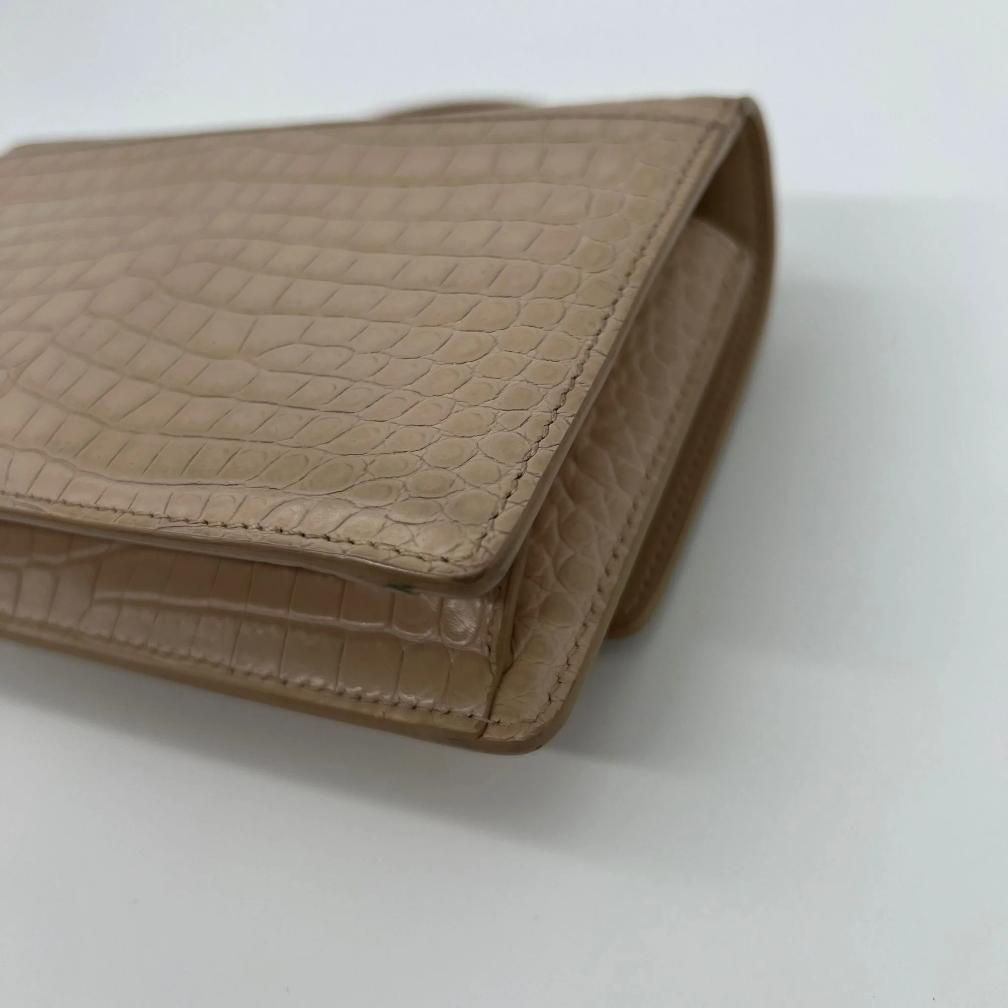 Item Description/Model: Saint Laurent YSL Sunset Wallet on Chain Bag in Croc Embossed Dark Beige Leather and Silver Hardware