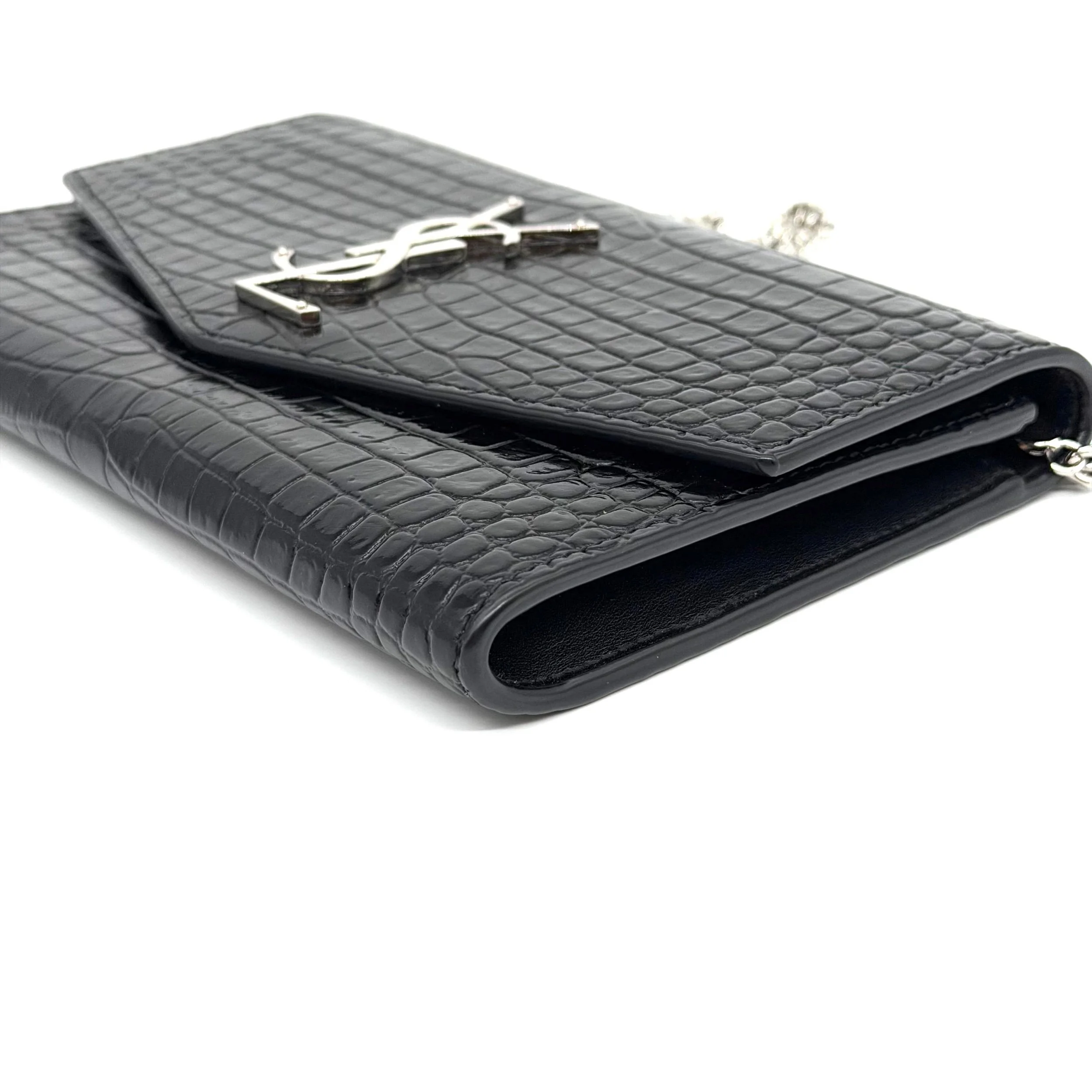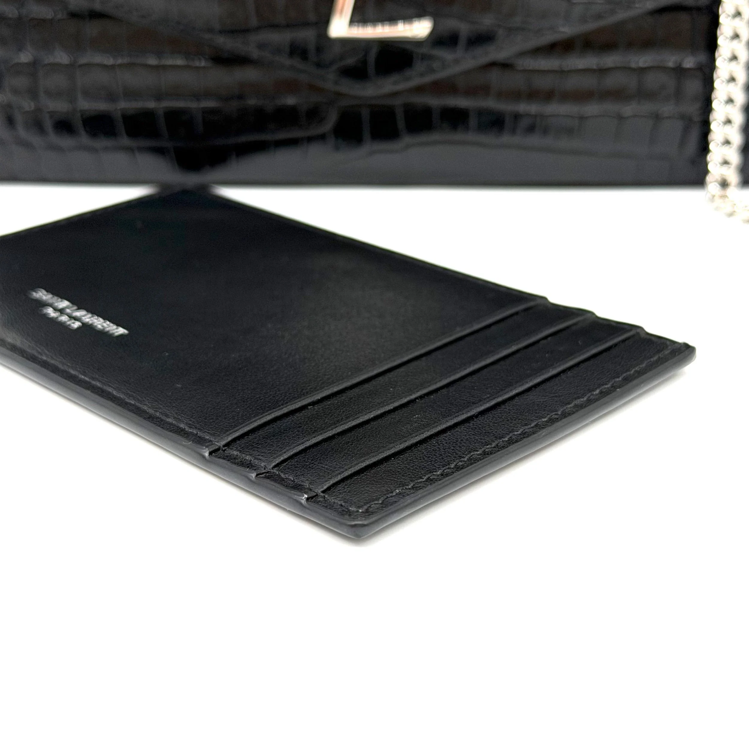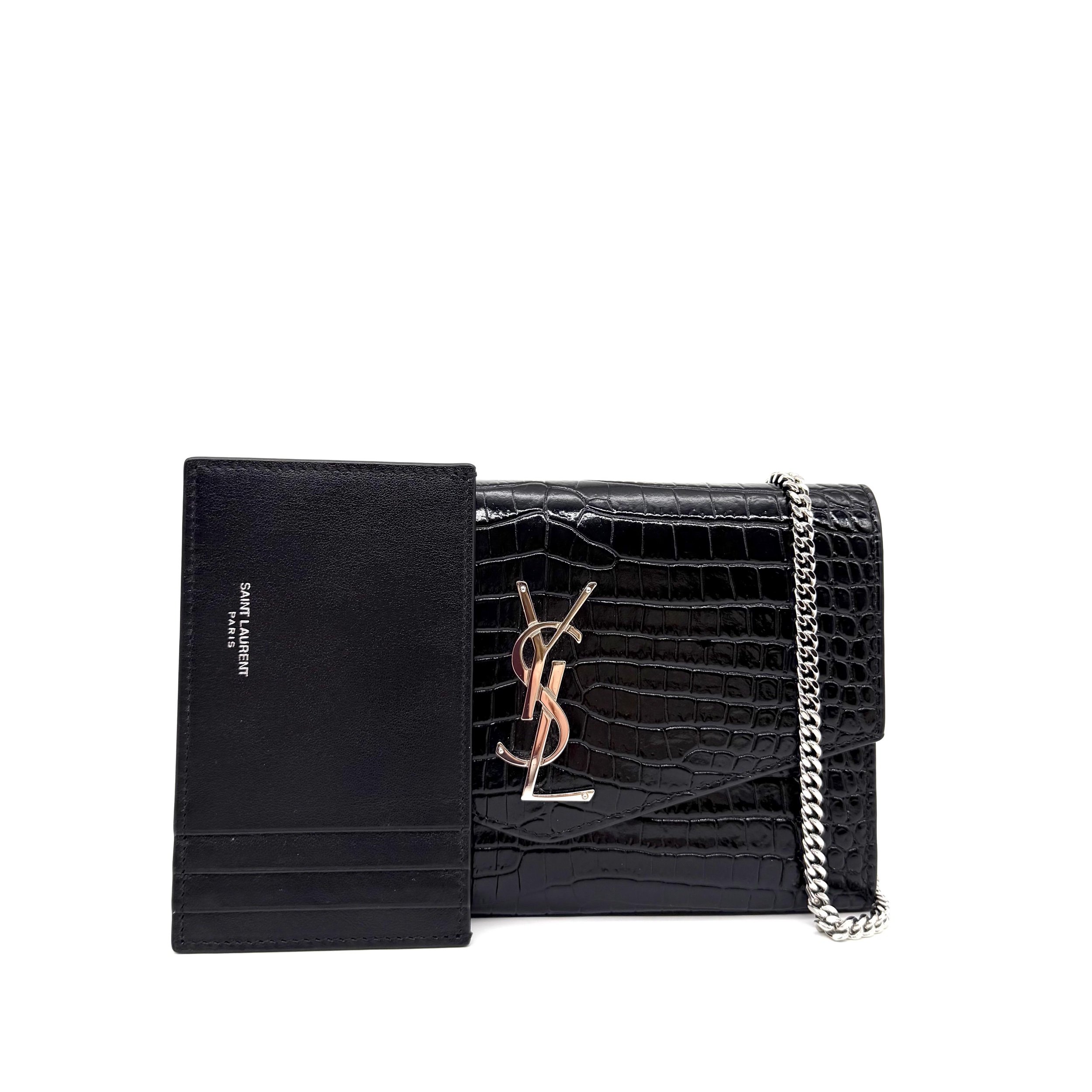 Item Description/Model: Saint Laurent YSL Uptown Wallet on Chain Bag and Card Holder in Black Croc Embossed Leather Silver Hardware