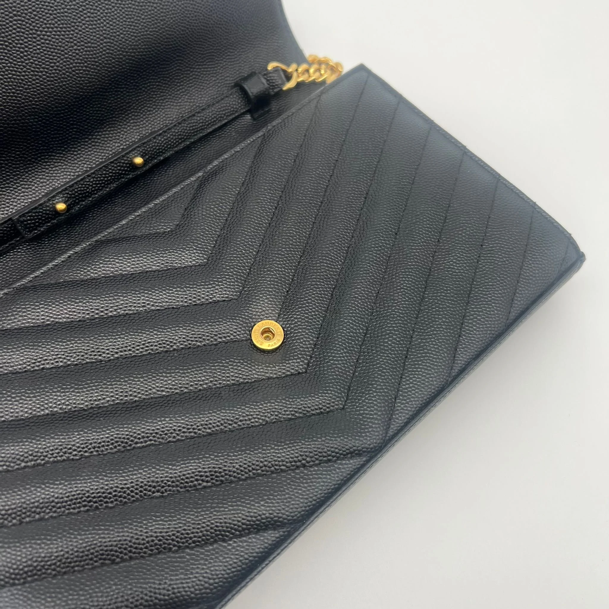 Item Description/Model: Saint Laurent YSL Large Envelope Cassandre Wallet on Chain Bag in Black Quilted Grained Leather and Gold Hardware.