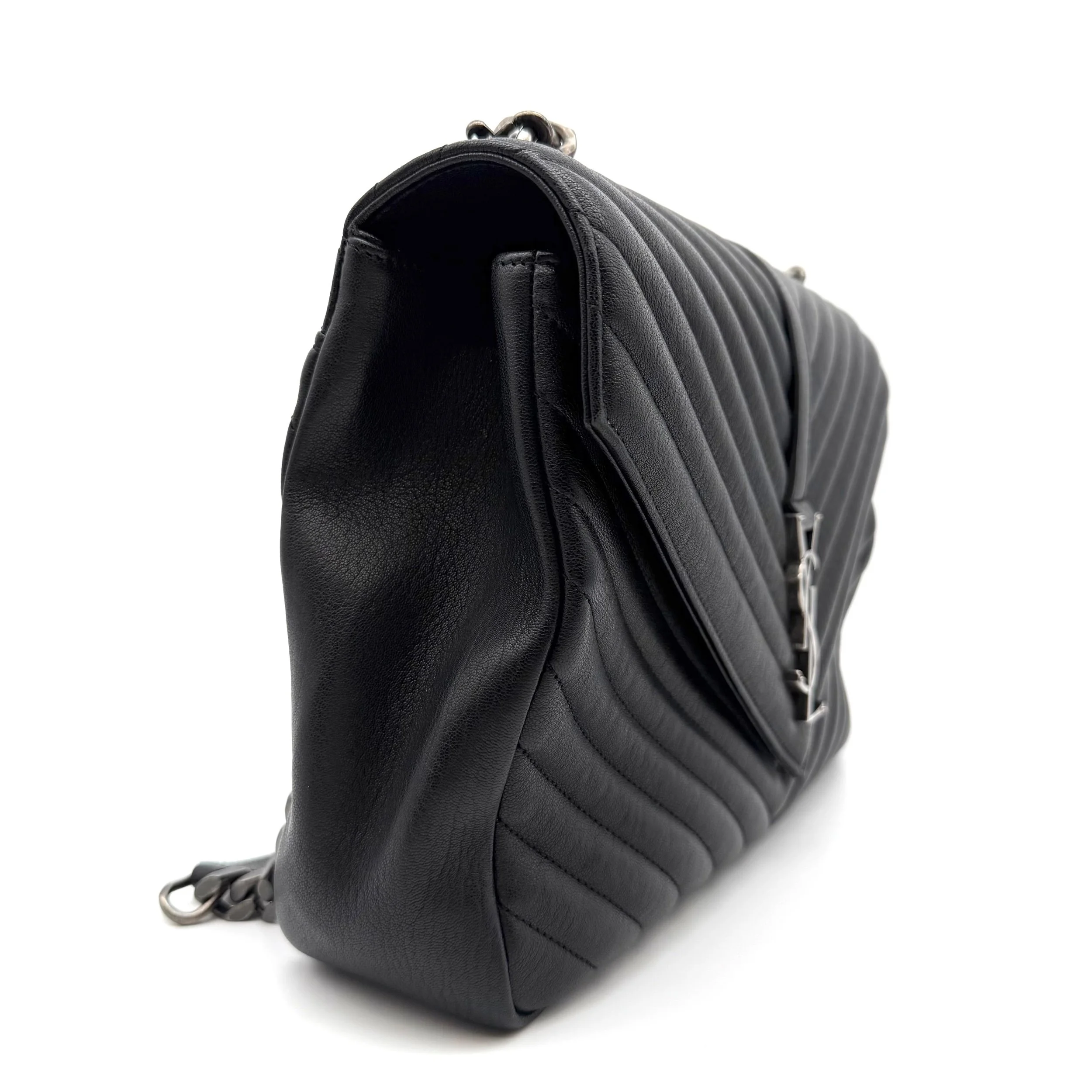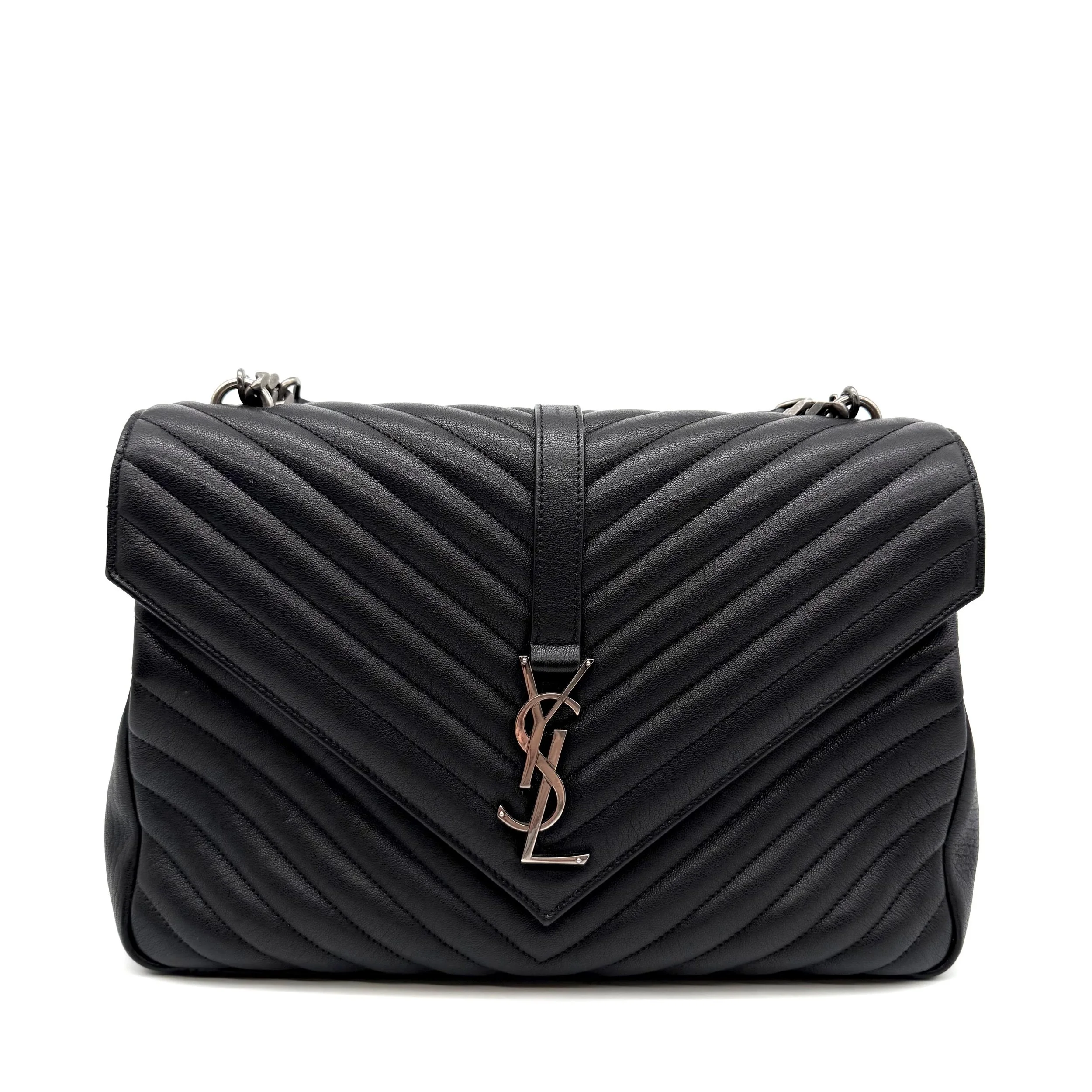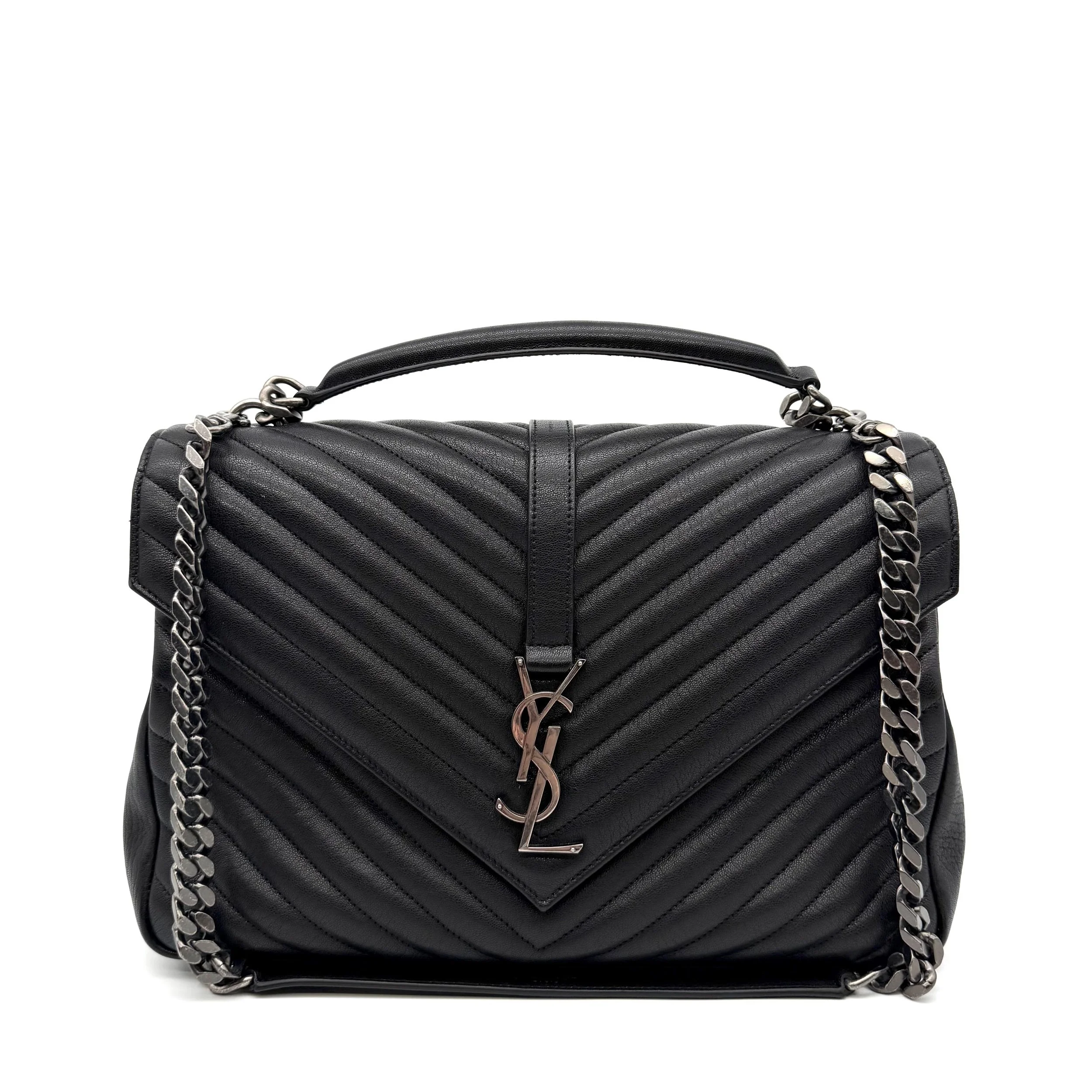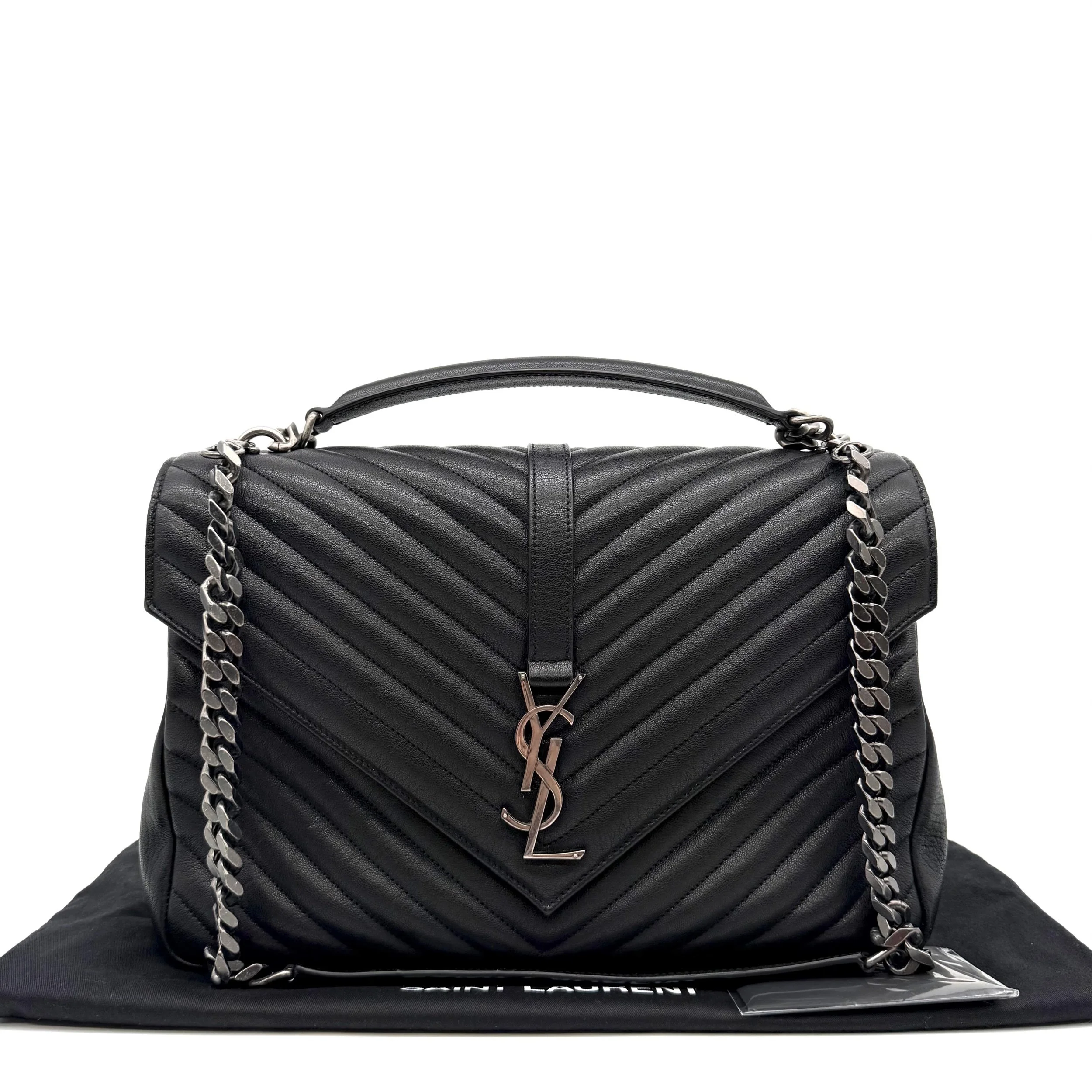 Item Description/Model: Saint Laurent YSL Large College Bag in Chevron Quilted Black Leather Aged Silver Hardware