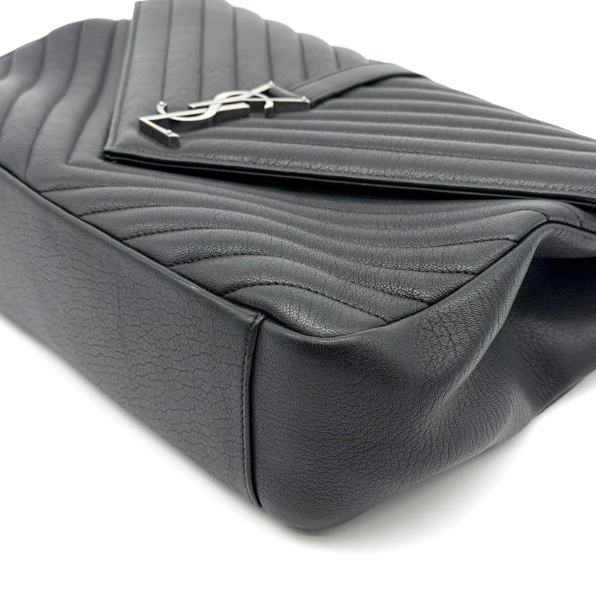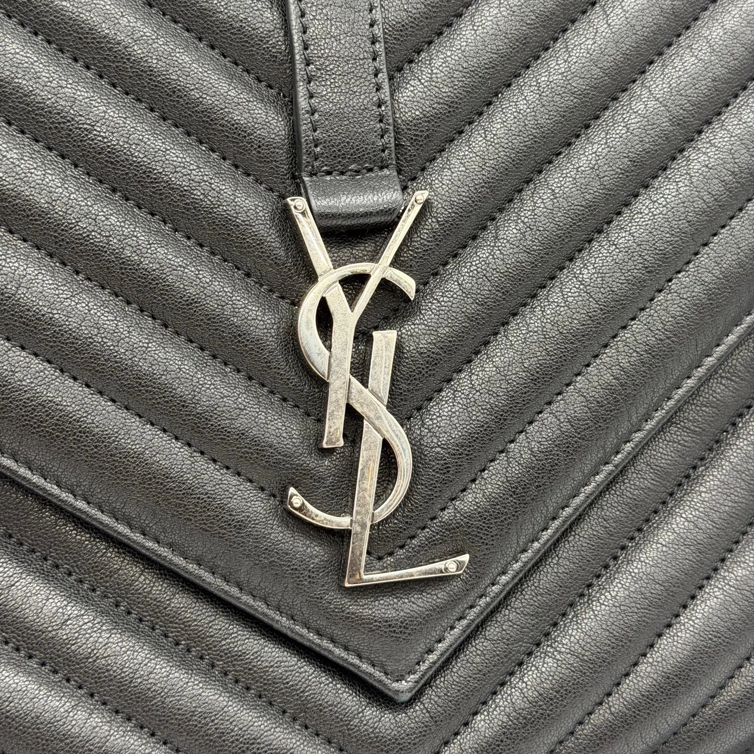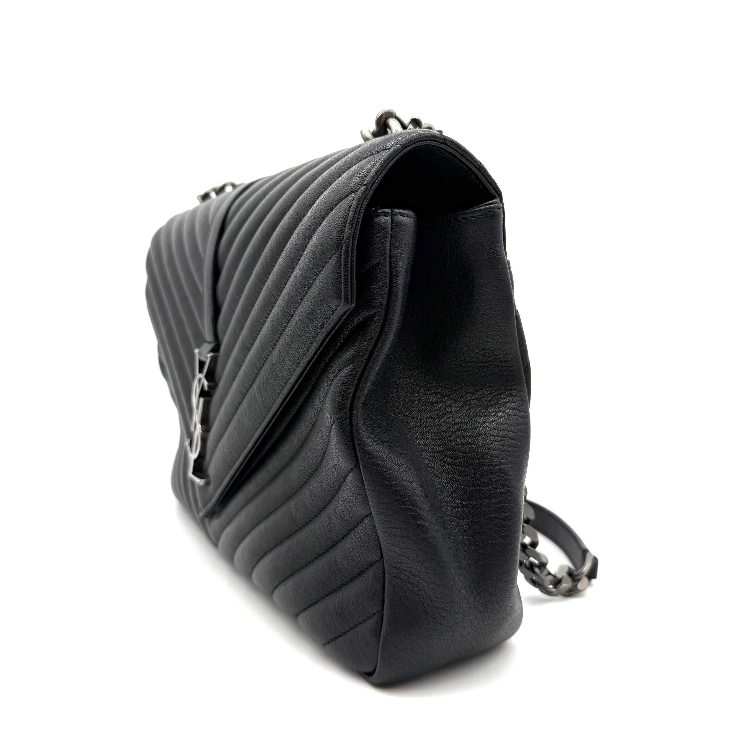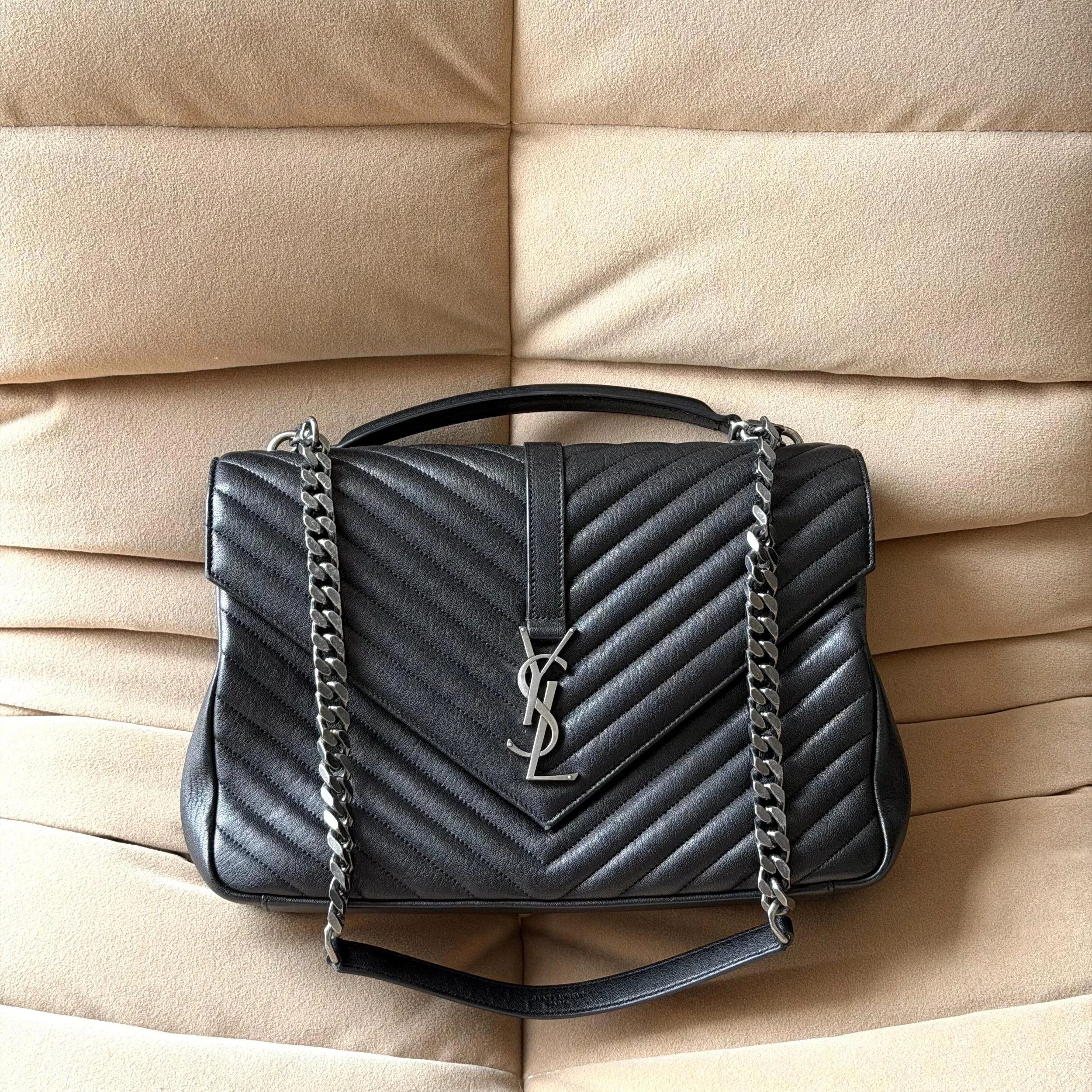 Item Description/Model: Saint Laurent YSL Large College Bag in Chevron Quilted Black Leather Aged Silver Hardware