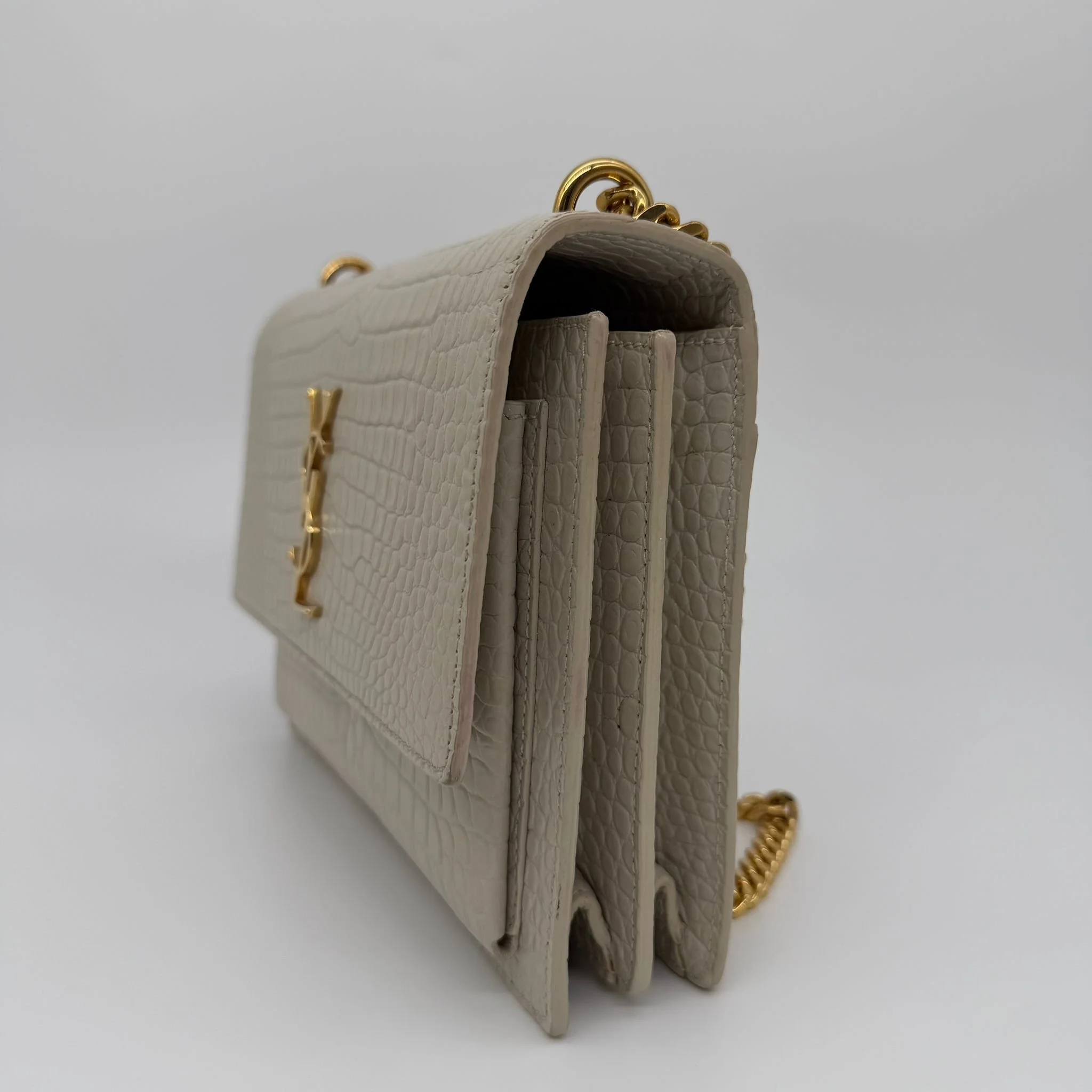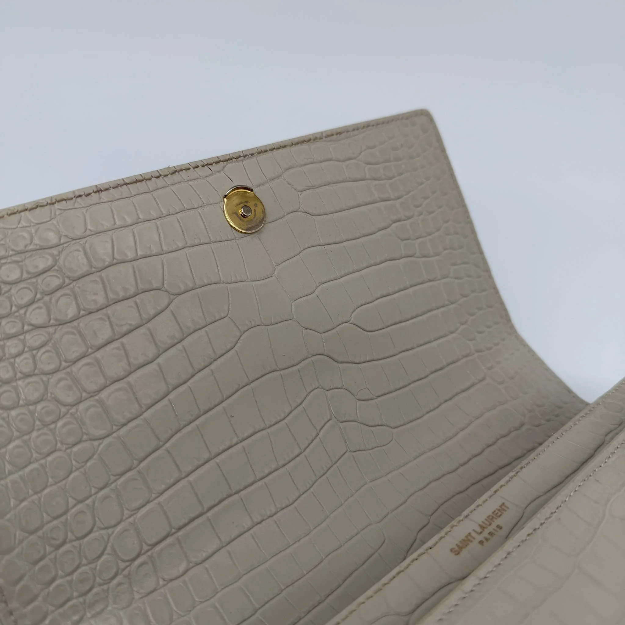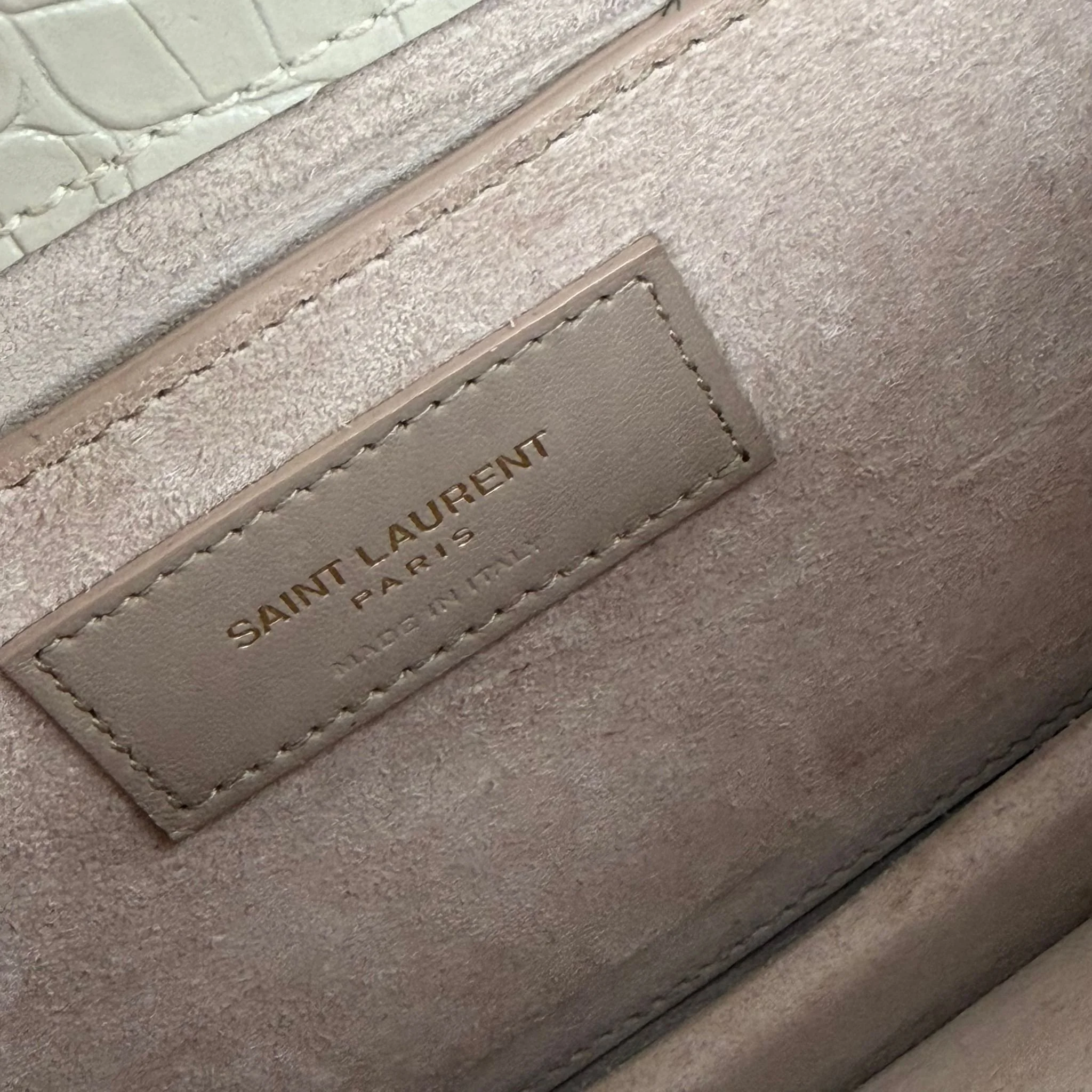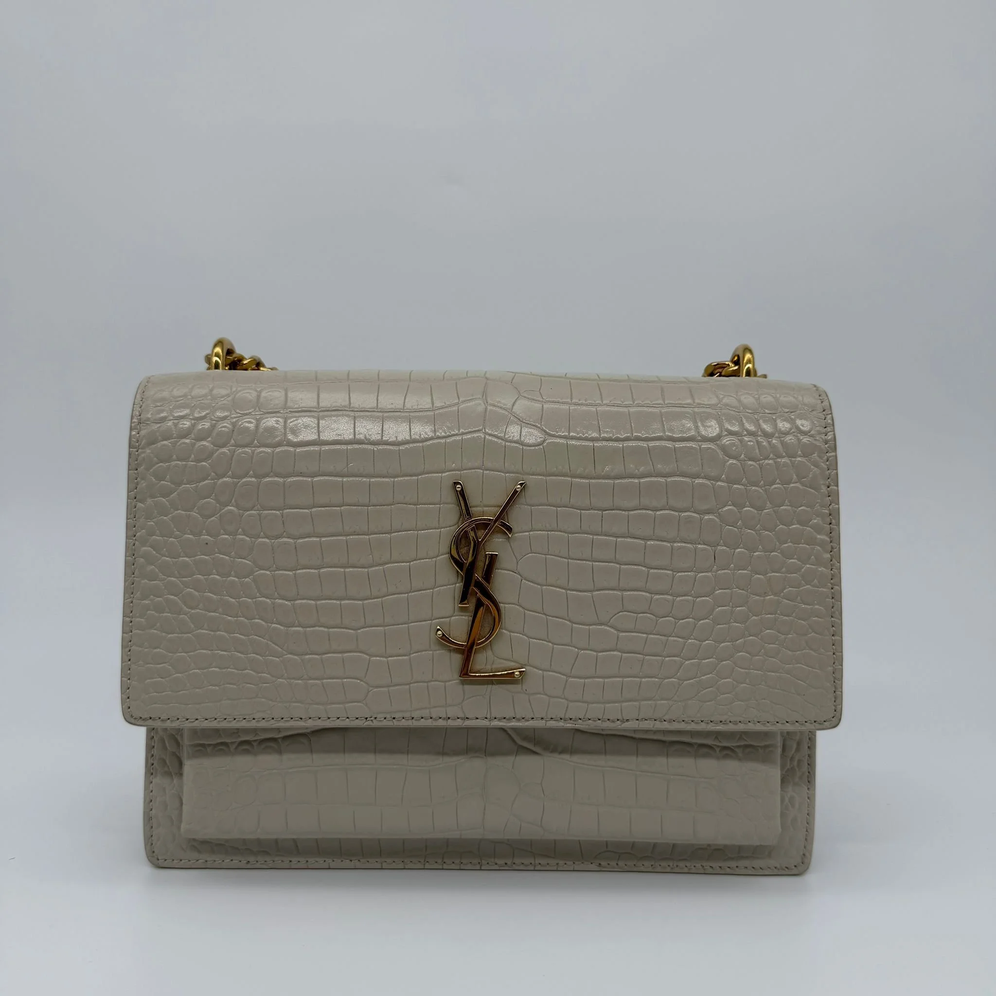 Item Description/Model: Saint Laurent YSL Medium Sunset Bag in Blanc Vintage (off white) Croc Embossed Leather Gold Hardware