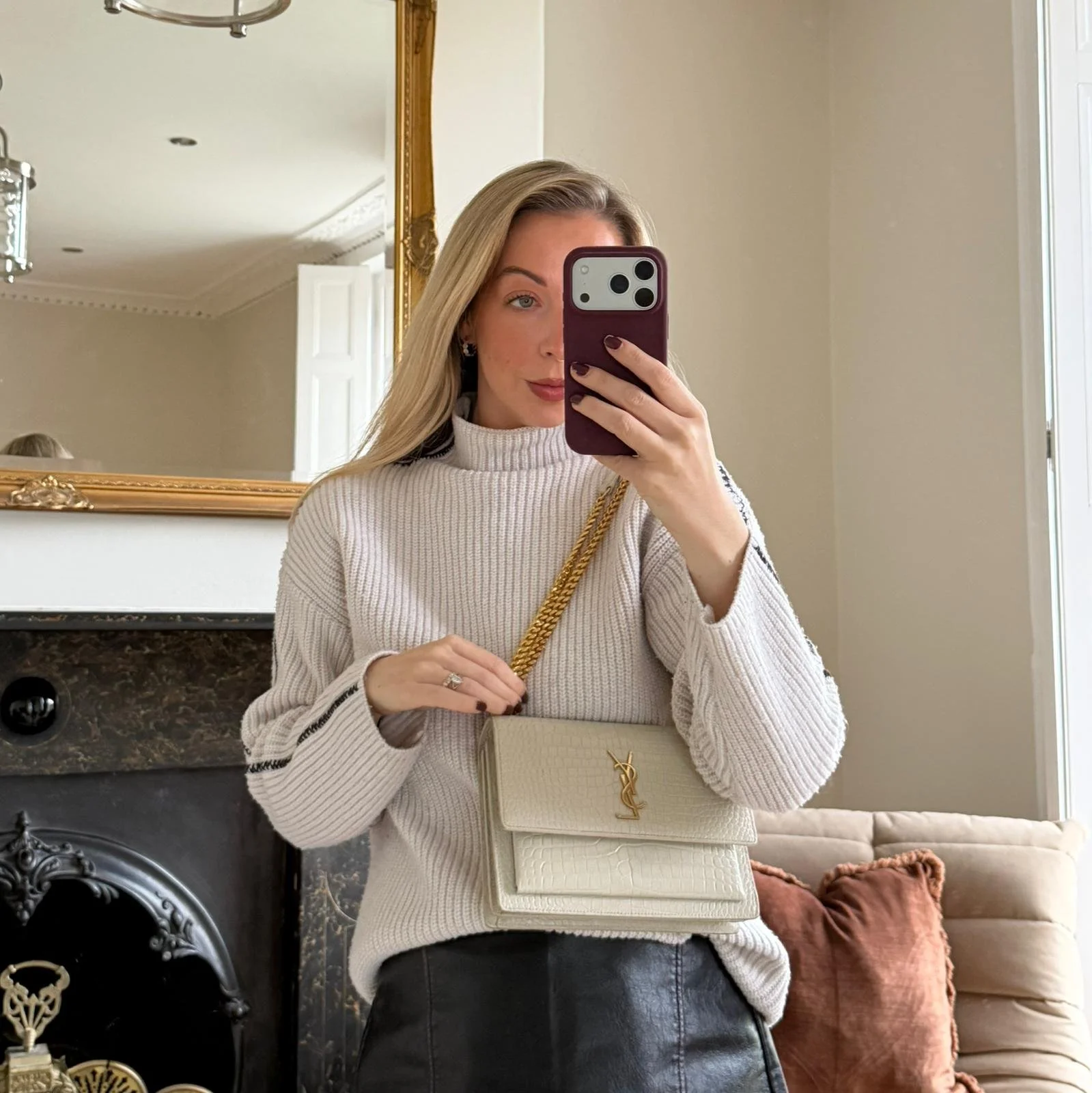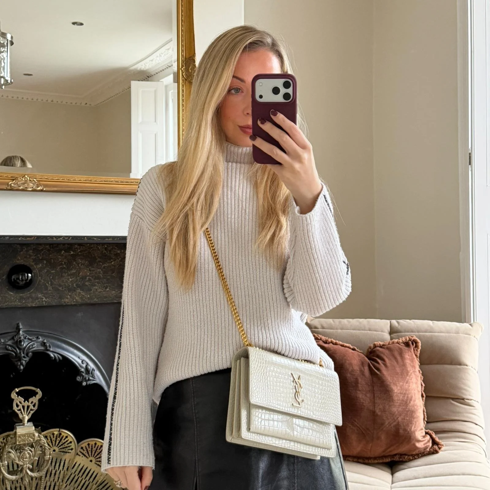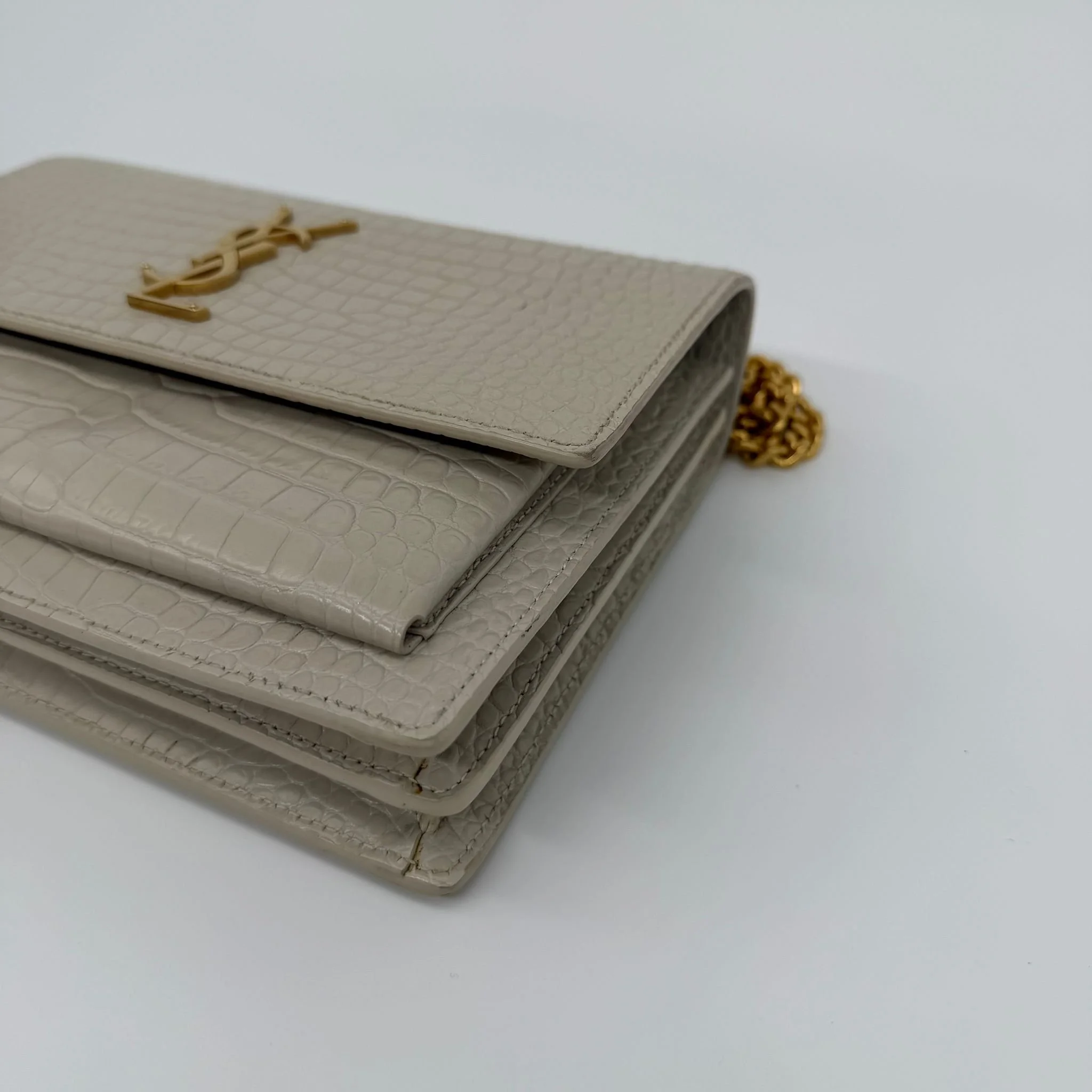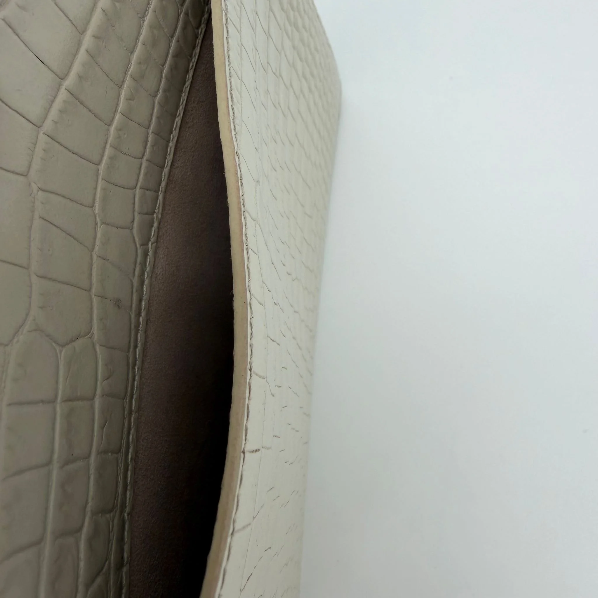 Item Description/Model: Saint Laurent YSL Medium Sunset Bag in Blanc Vintage (off white) Croc Embossed Leather Gold Hardware