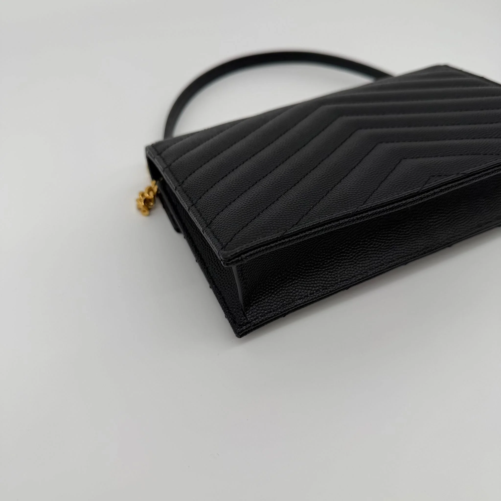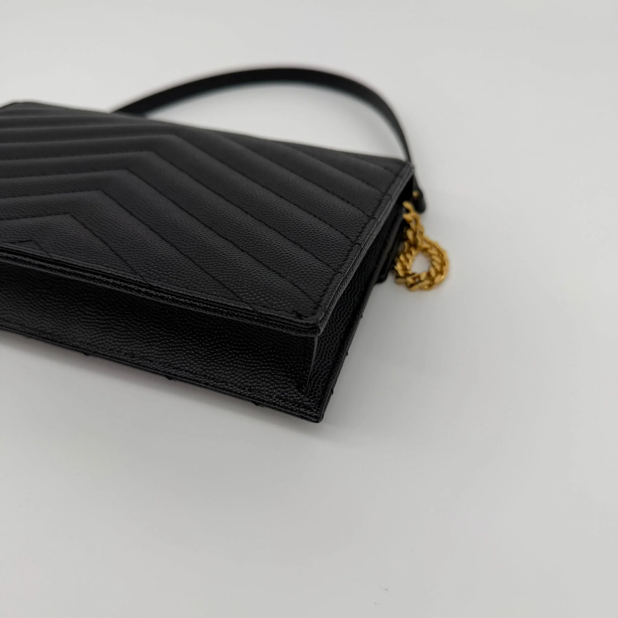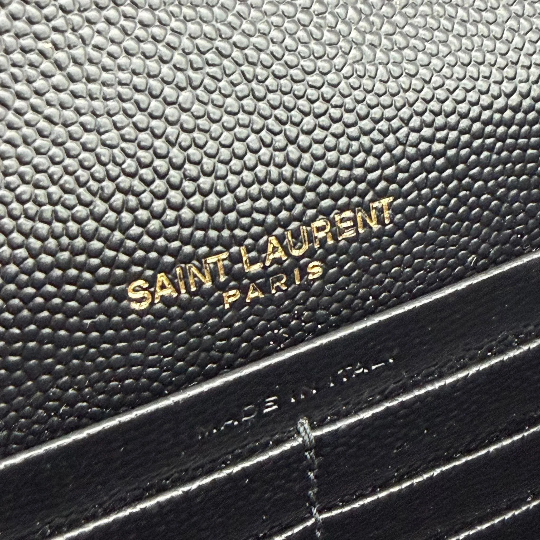 Item Description/Model: Saint Laurent YSL Small Envelope Cassandre Wallet on Chain Bag in Black Quilted Grained Leather and Gold Hardware.