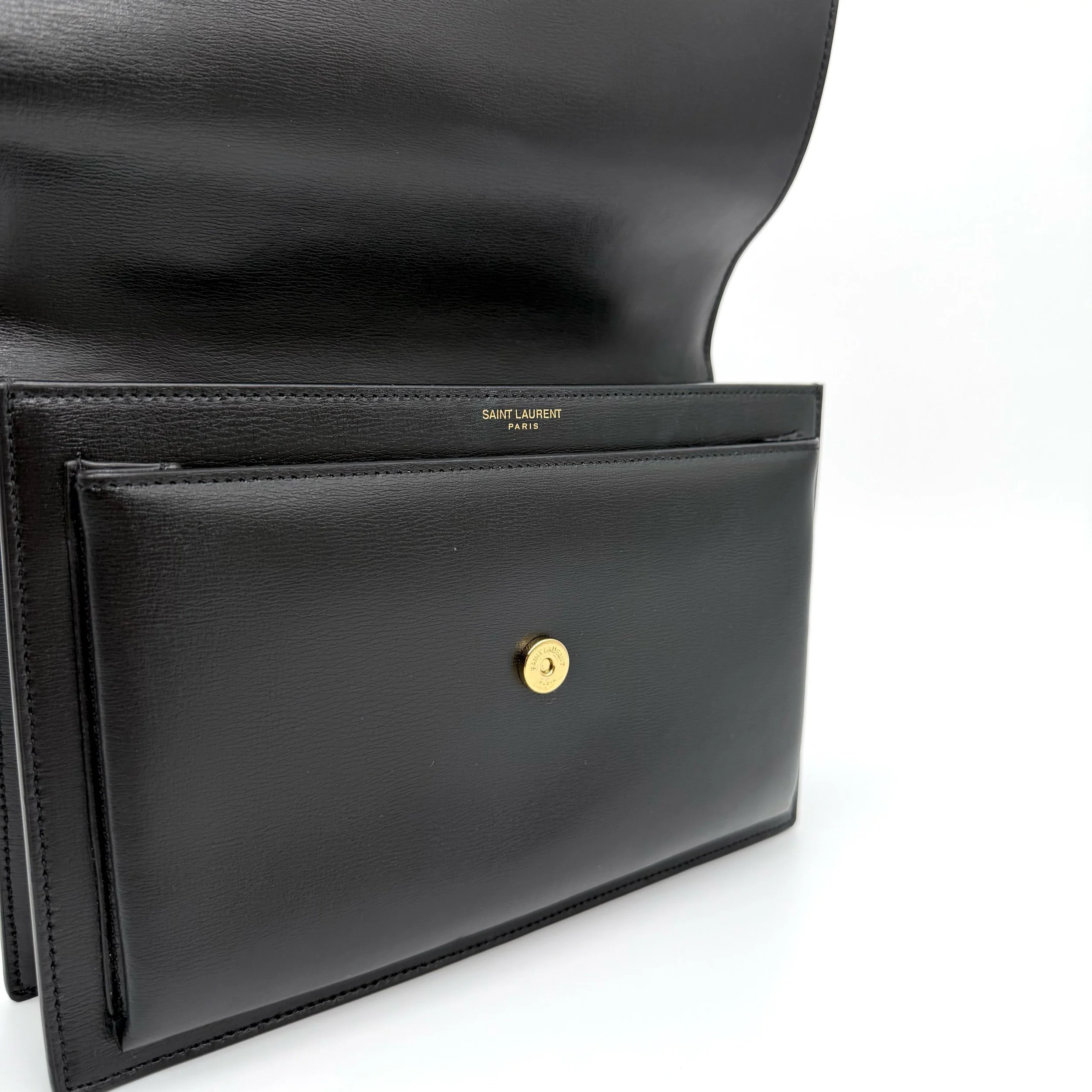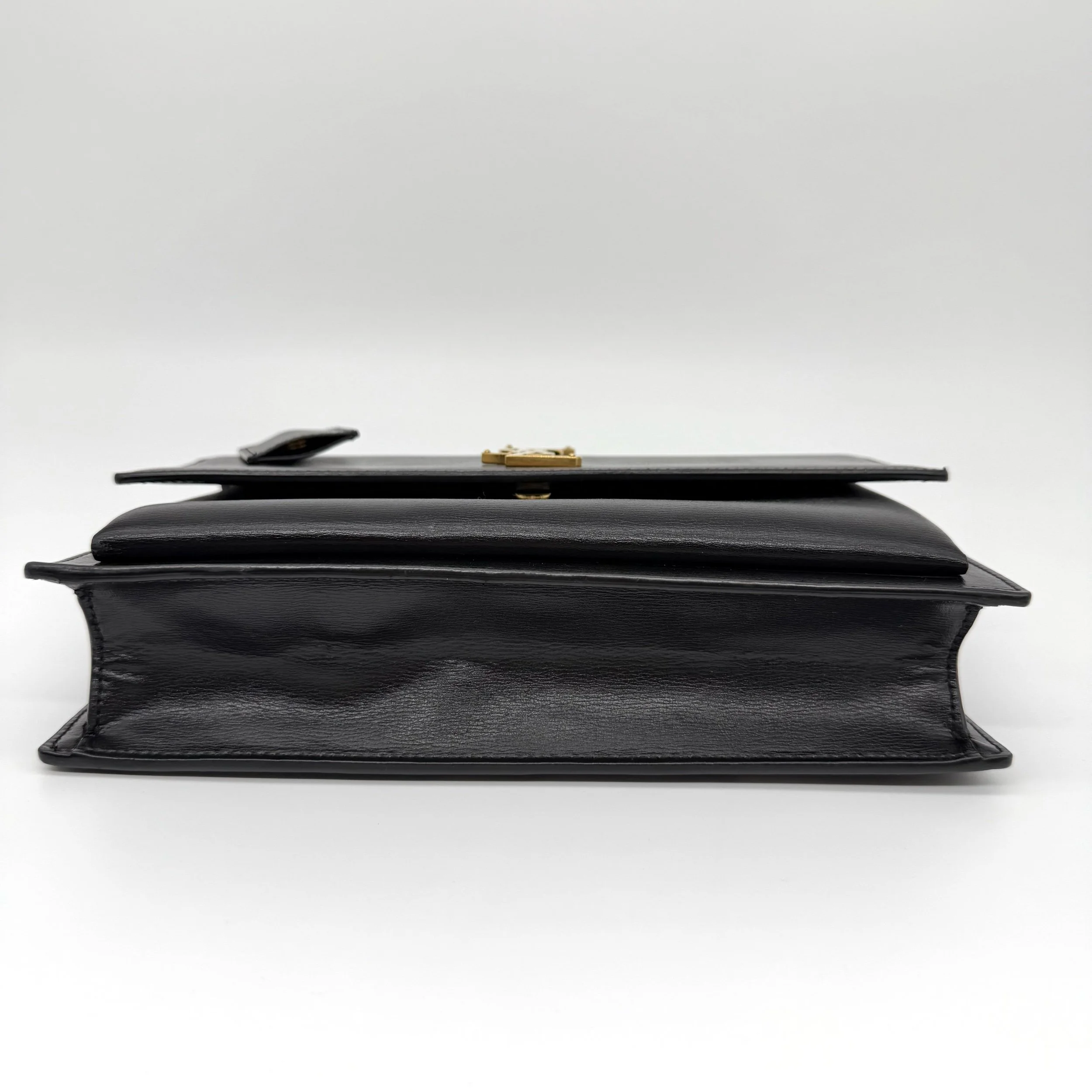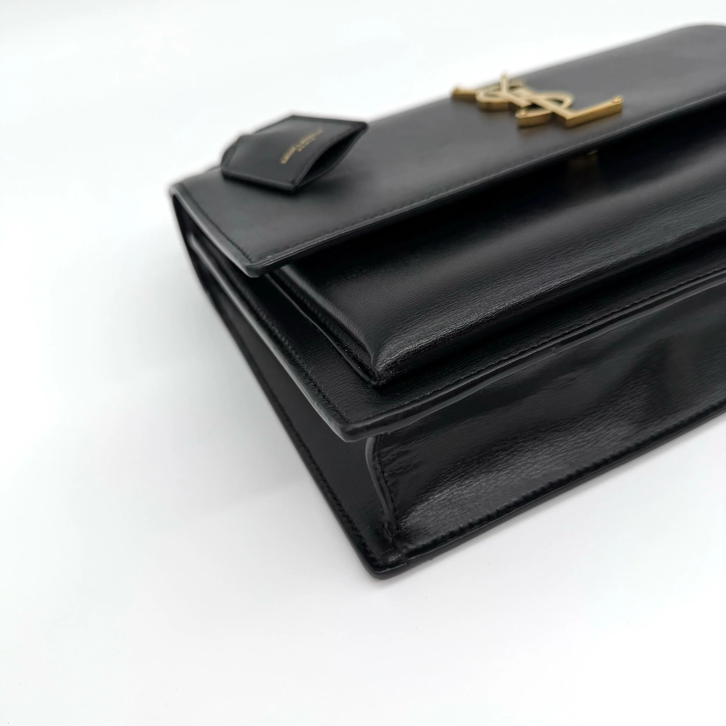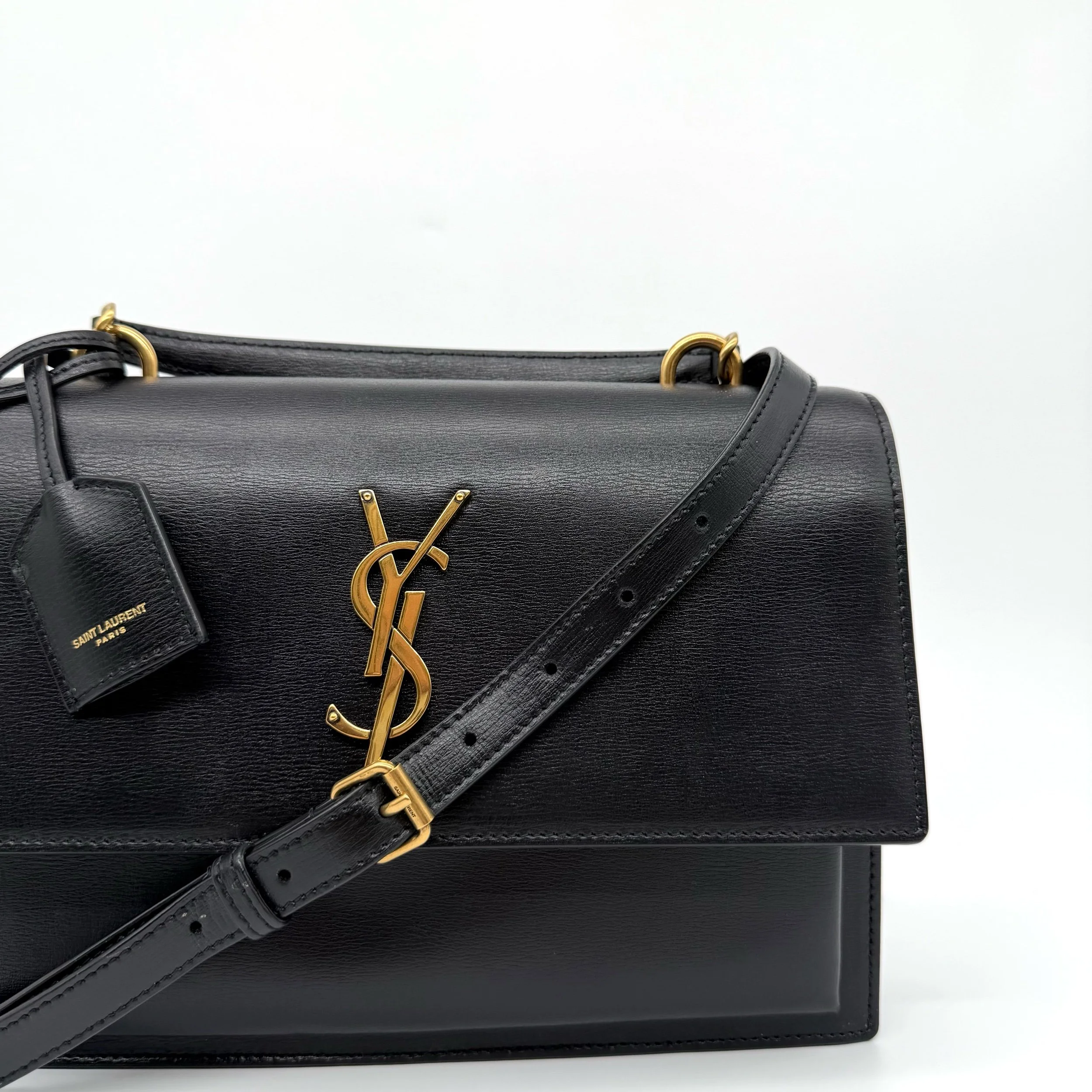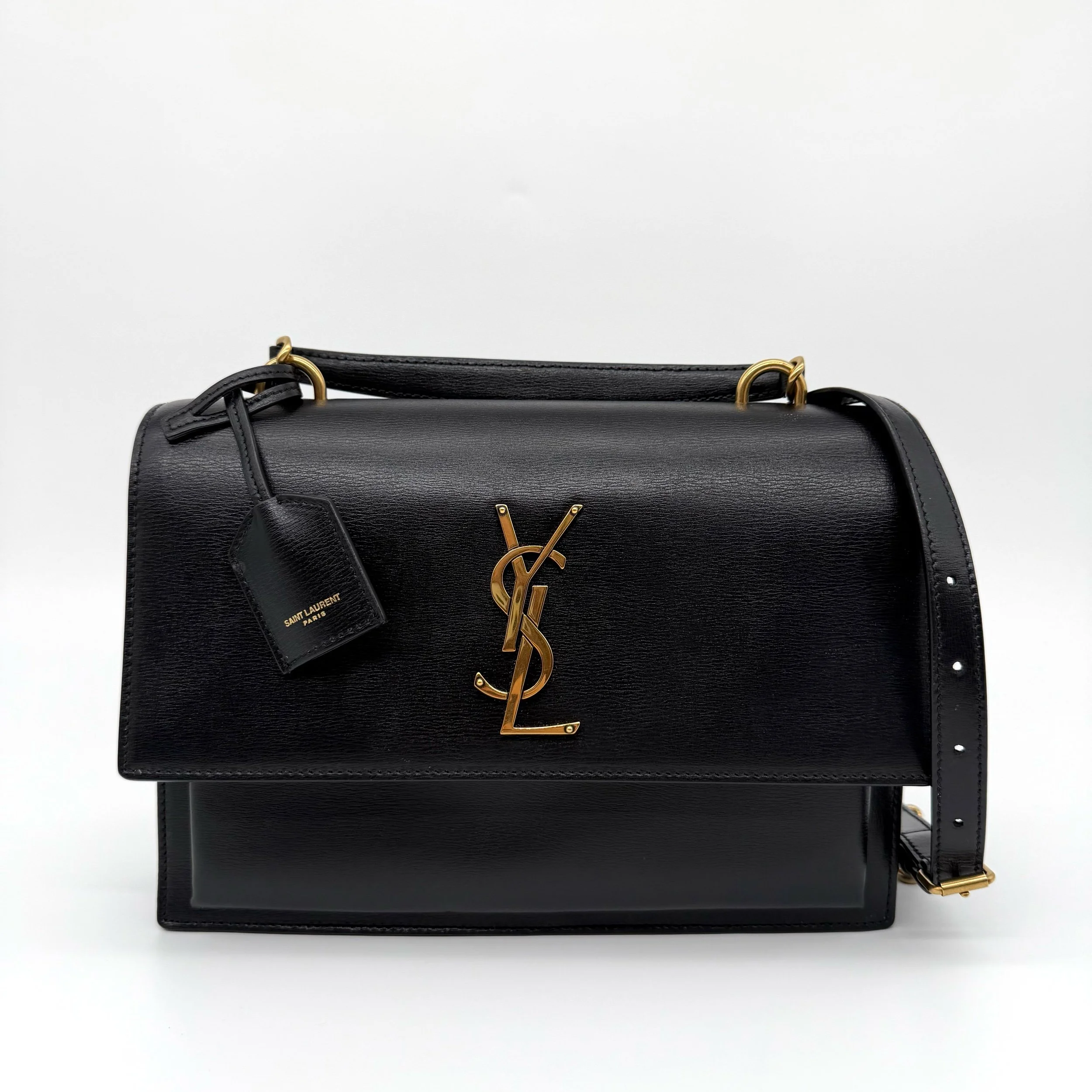 Item Description/Model: Saint Laurent YSL Sunset Top Handle Satchel Medium Bag in Black Smooth Leather and Gold Hardware